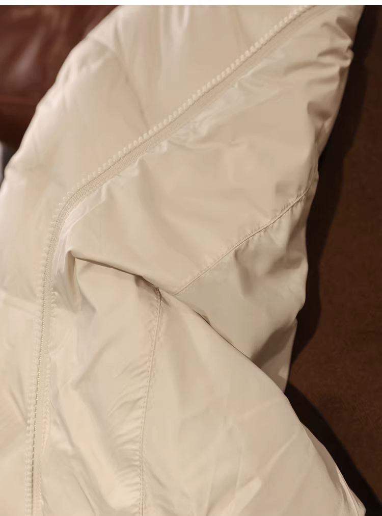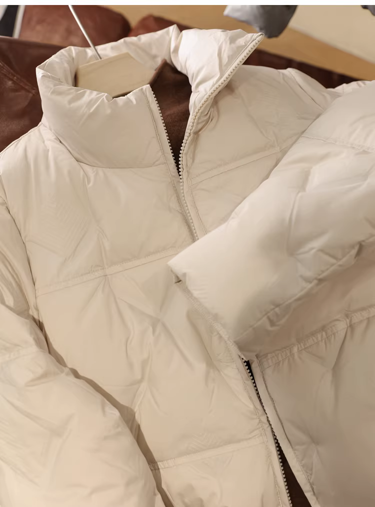 Áo khoác phao cổ đứng 90% lông vũ trắng, nhẹ và ấm áp, may đường may kín, kiểu dáng ôm dáng và rộng rãi cho nữ mùa đông.
