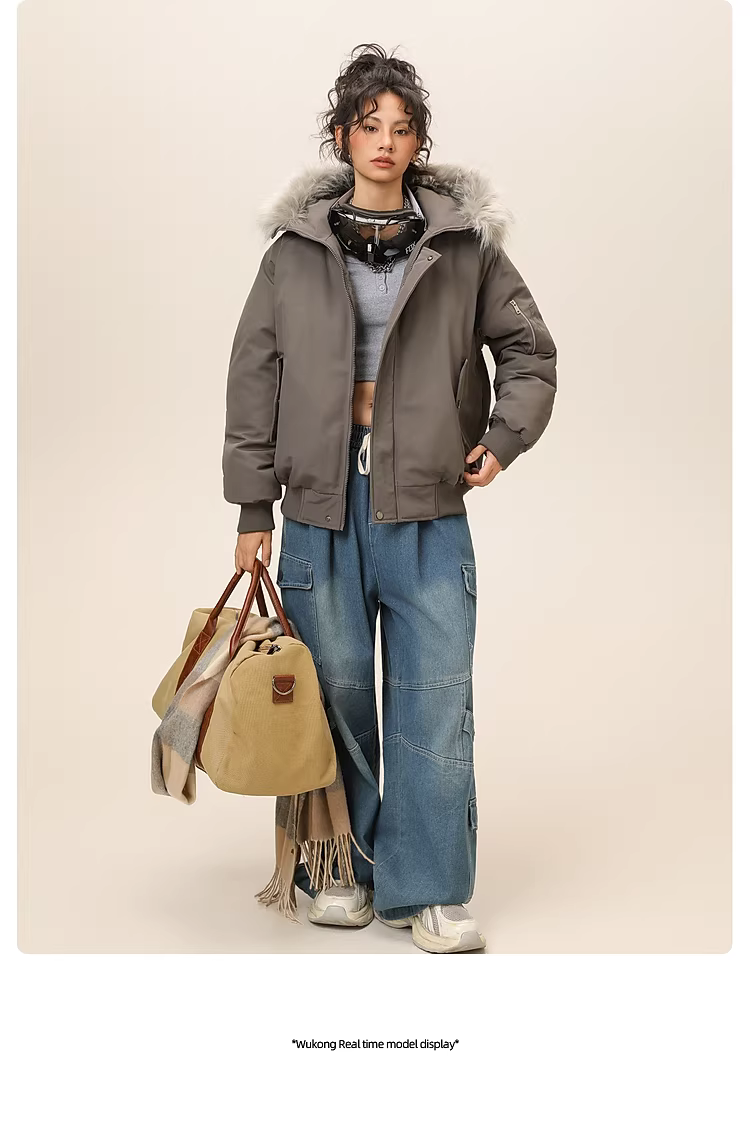 Áo khoác phao dày có mũ trùm đầu và cổ lông mùa đông của Wukong dành cho nam, kiểu dáng Mỹ, thương hiệu thời trang, áo khoác cotton ấm áp dành cho cặp đôi.