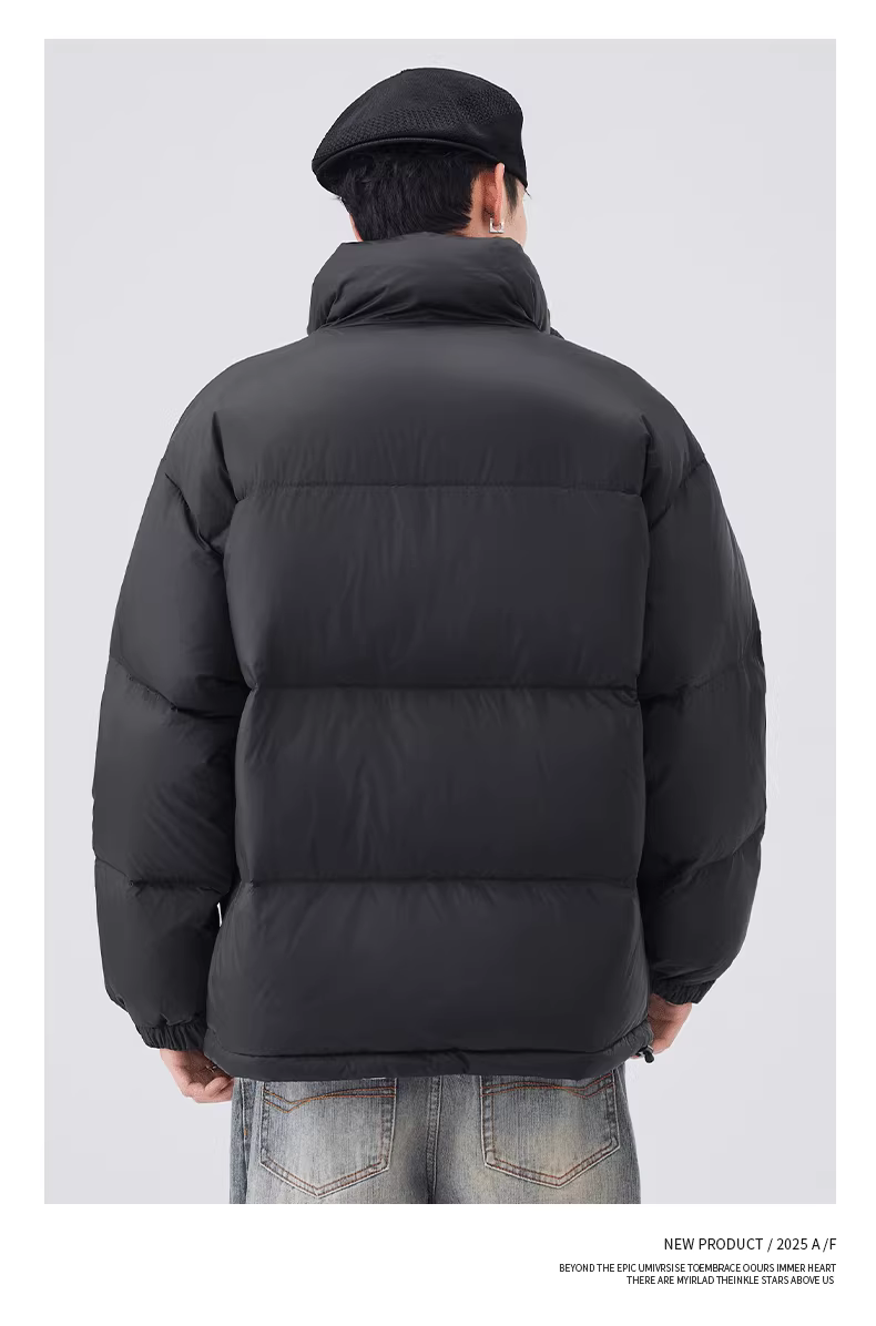 - Áo khoác phao ngắn kiểu Mỹ dày dặn mùa đông dành cho nam, có cổ đứng, làm từ 90% lông vũ trắng, giữ ấm và chống lạnh.
