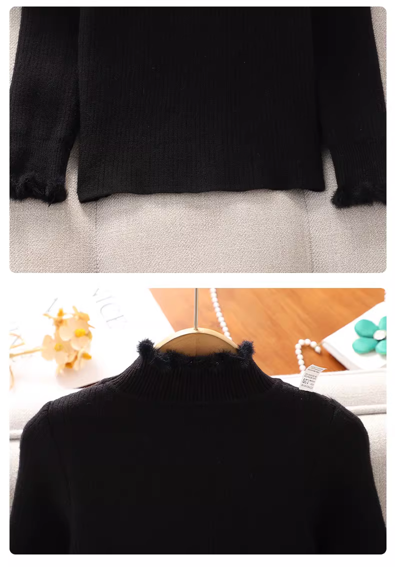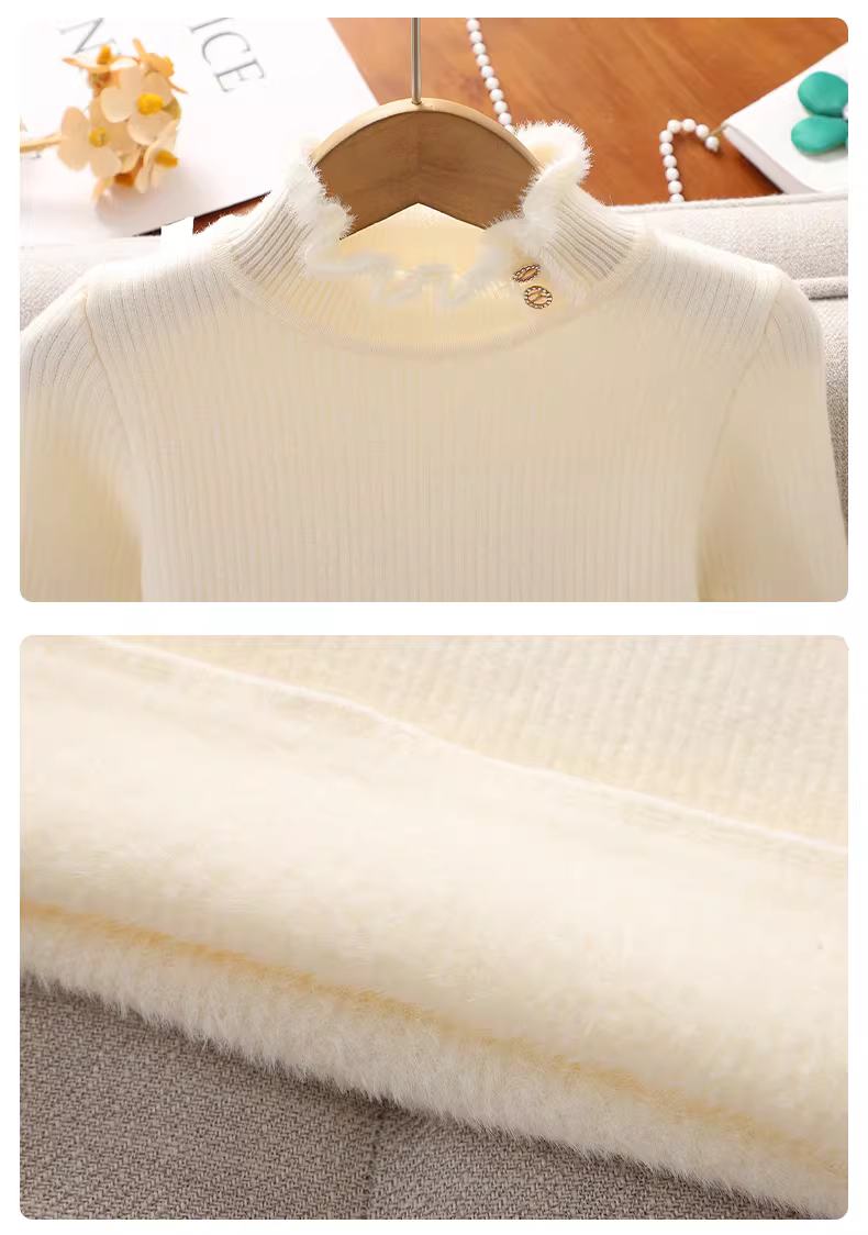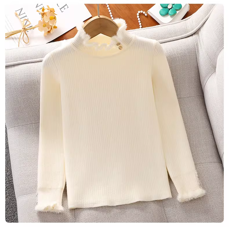 Áo len bé gái mùa đông, áo lót lông cừu nửa cổ lọ, kiểu mới thu đông 2025, màu trắng, chất liệu dệt kim dành cho bé gái lớn hơn