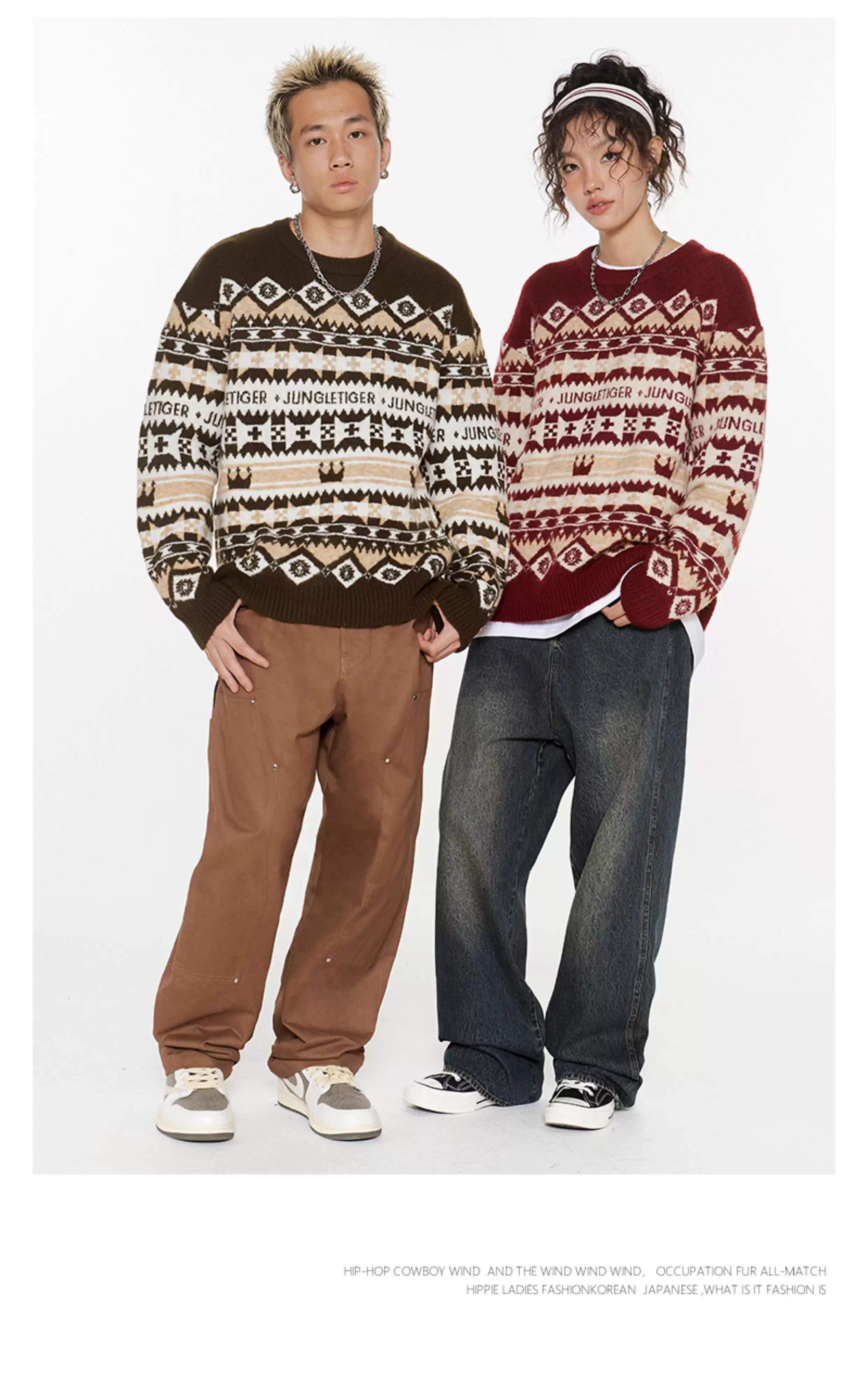 - Áo len cặp đôi họa tiết jacquard đỏ mùa thu đông 2025 phong cách dân tộc, dáng rộng, cổ tròn, chất liệu dệt kim dành cho nam và nữ