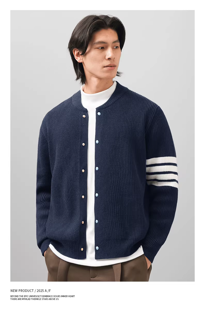 Áo len cardigan nam mùa đông có bốn sọc, kiểu dáng bóng chày cao cấp, áo khoác dệt kim rộng rãi và giản dị