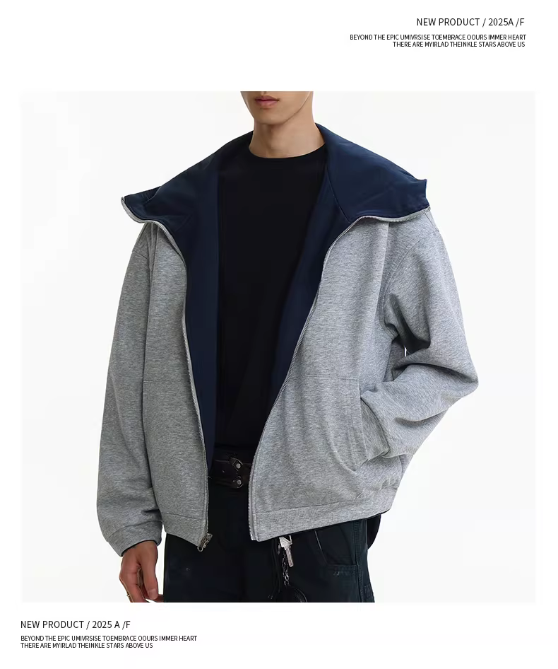 - Áo len cardigan ngắn hạng nặng 460G dành cho nam, phong cách đường phố cao cấp của Mỹ mùa thu, áo mặc hai mặt rộng rãi, áo khoác có mũ màu xám