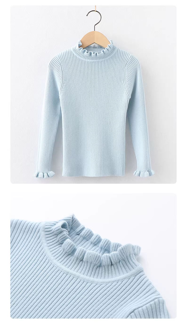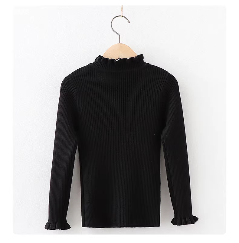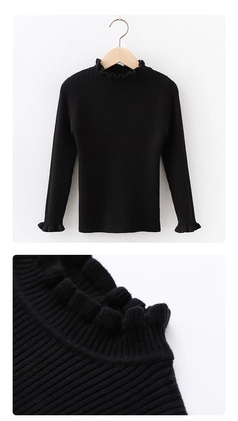 Áo len cổ lọ nửa cao cho bé gái, kiểu mới mùa đông 2025, lót lông cừu, viền bèo nhún, áo len mặc trong cho trẻ em.