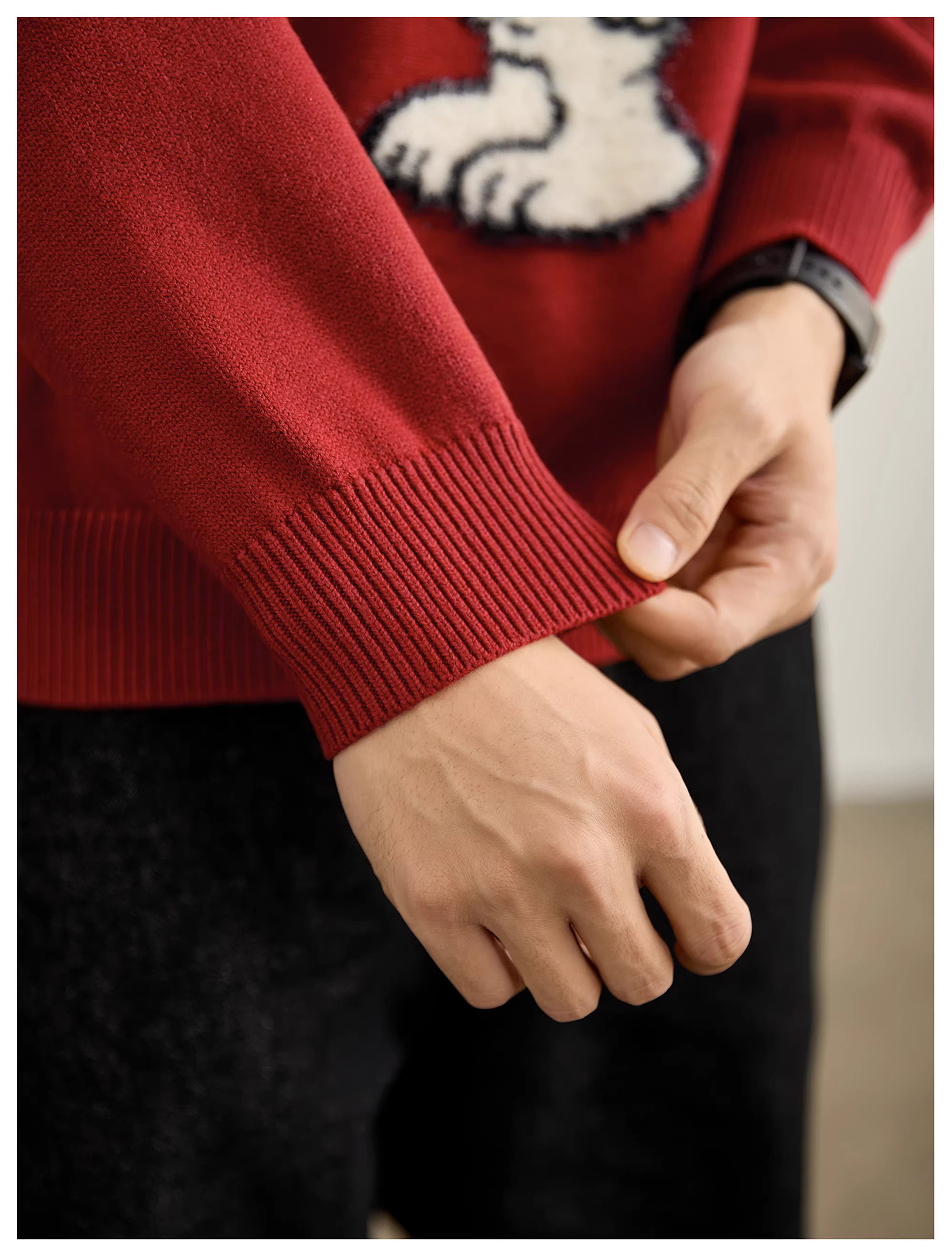 Áo len cổ tròn màu đỏ lễ hội LUUD, dễ thương và đáng yêu, thêu hình chó 3D bằng chất liệu nhung mềm mại dành cho nam