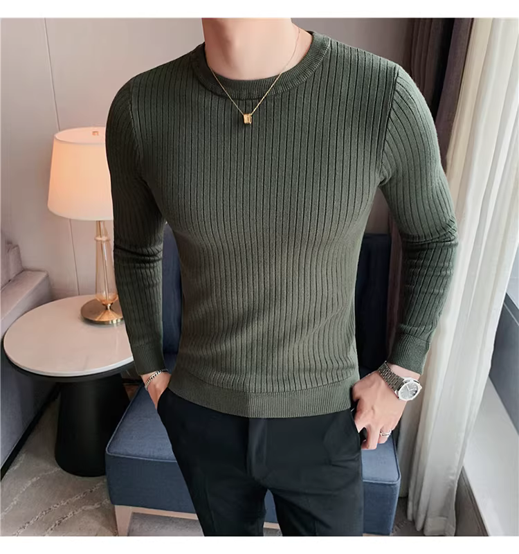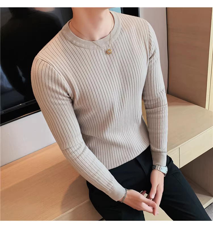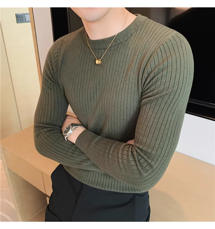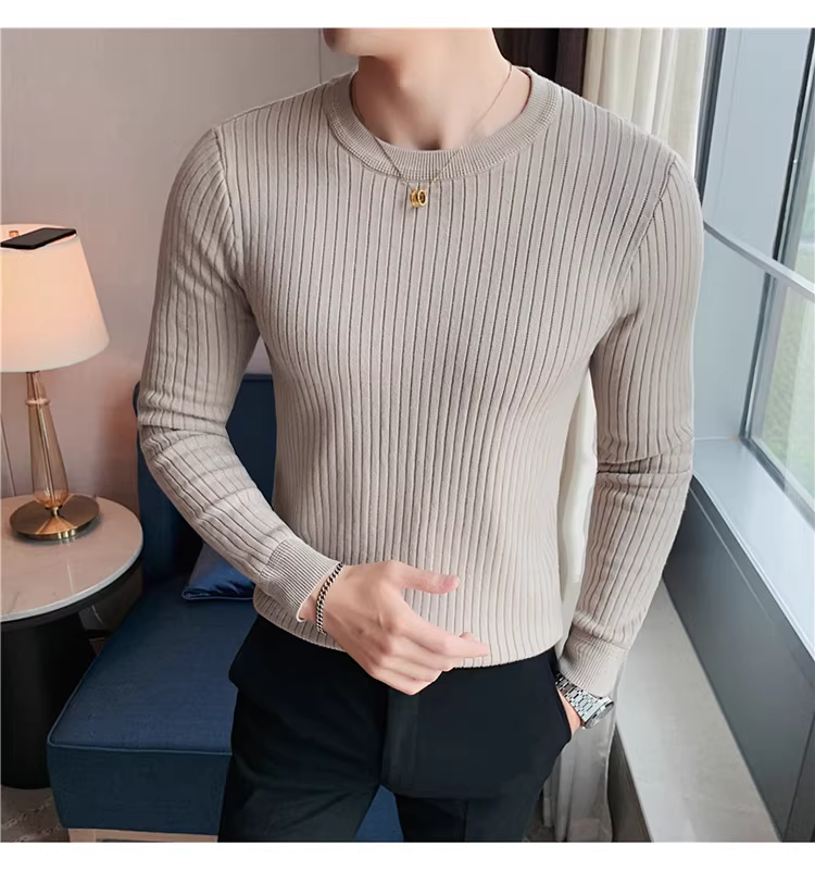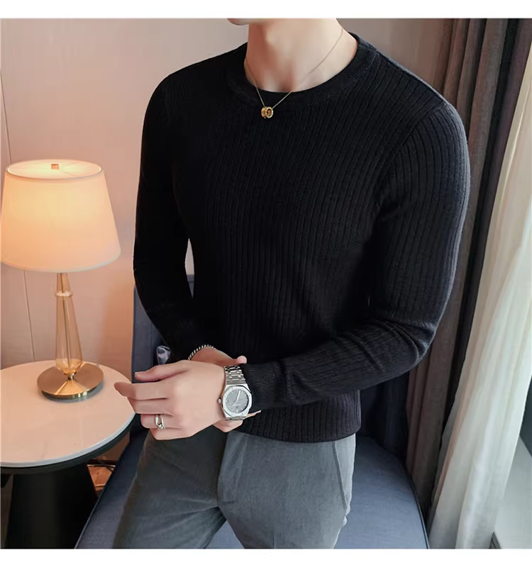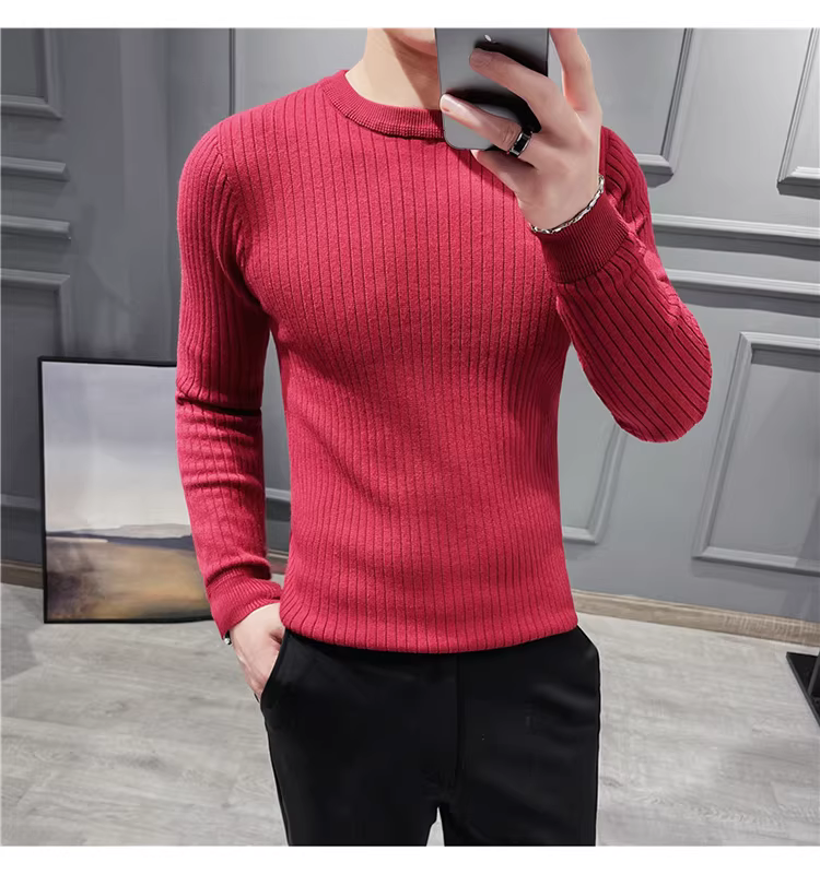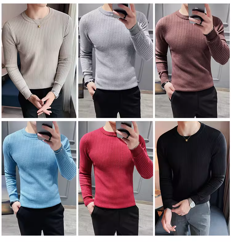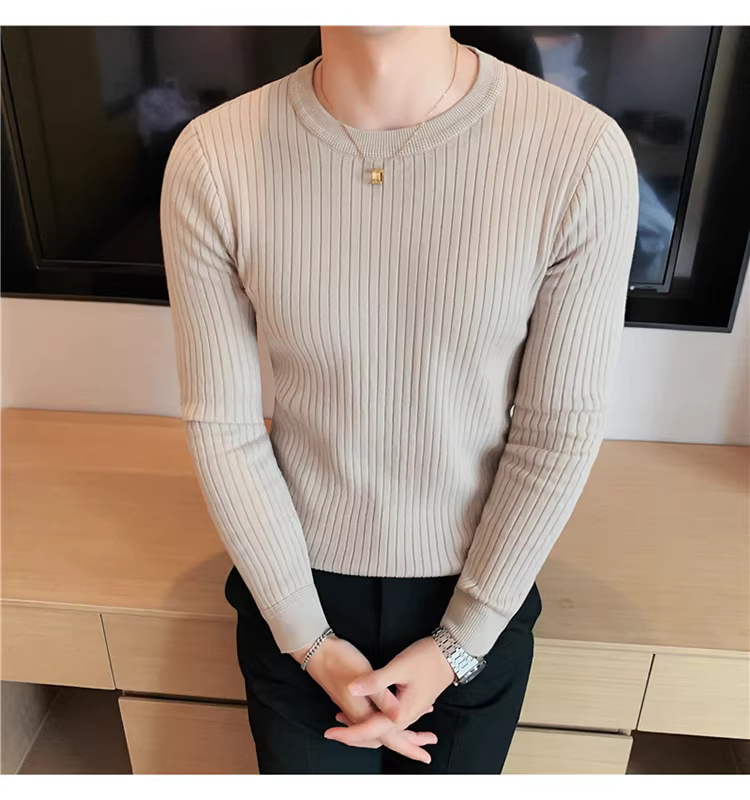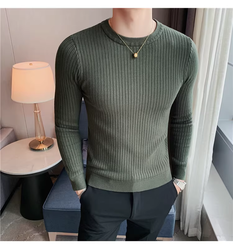 - Áo len cổ tròn nam, áo len dệt kim sọc dày dặn phong cách Hàn Quốc, áo sơ mi dài tay đa năng, hợp thời trang, kiểu dáng đơn giản