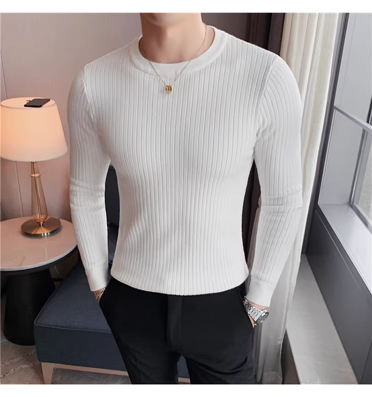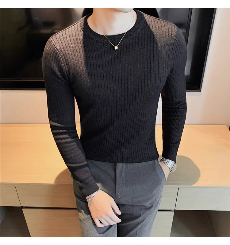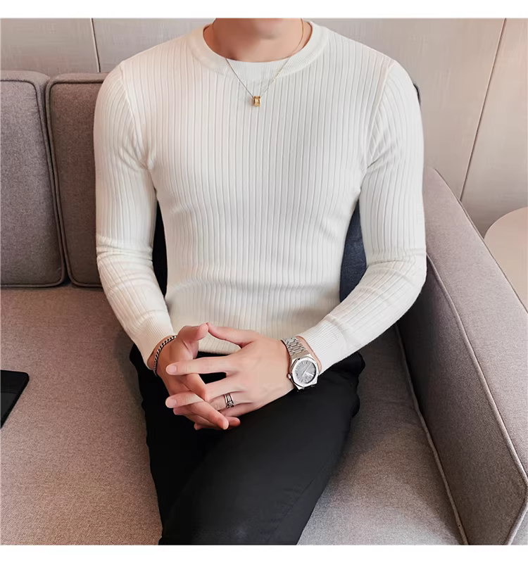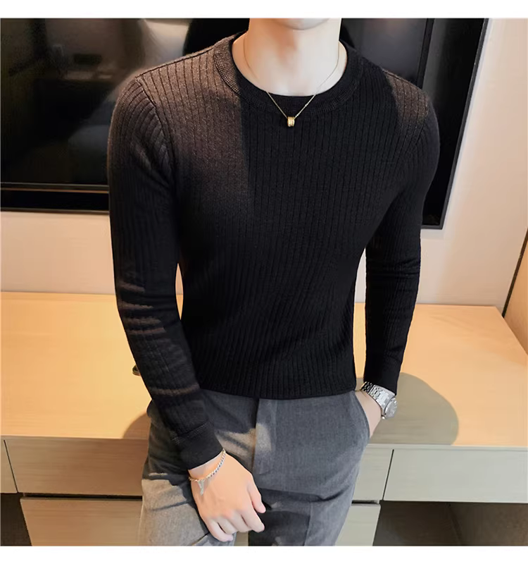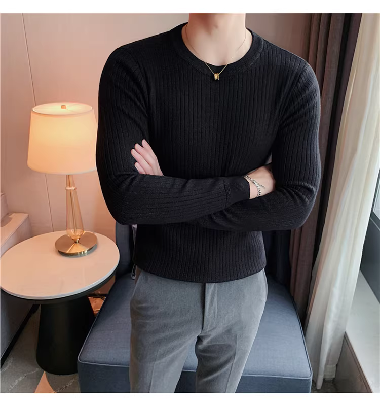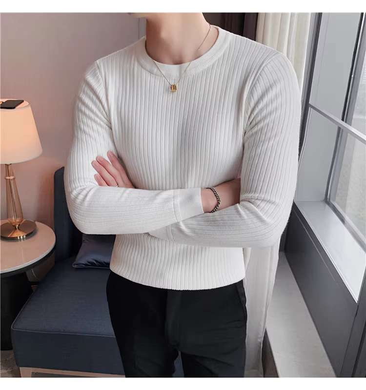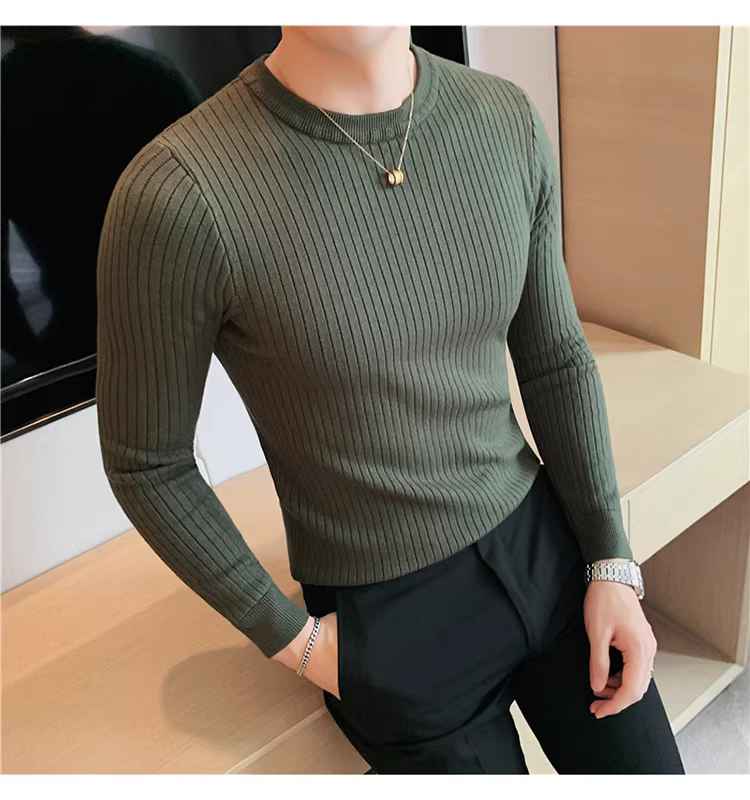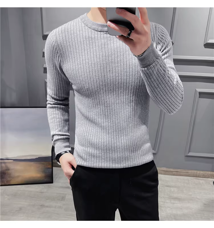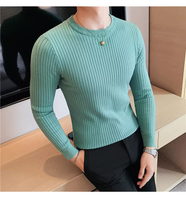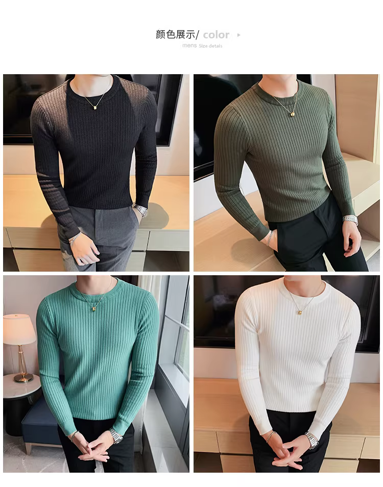 - Áo len cổ tròn nam, áo len dệt kim sọc dày dặn phong cách Hàn Quốc, áo sơ mi dài tay đa năng, hợp thời trang, kiểu dáng đơn giản