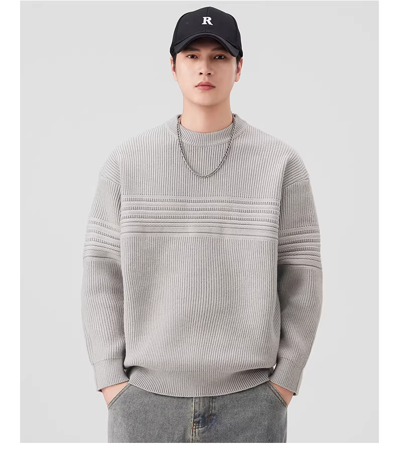 Áo len cổ tròn sọc dọc OMZM dành cho nam, mùa thu đông, chất liệu dệt kim dày 8 pound, có họa tiết, áo thun mặc bên trong.