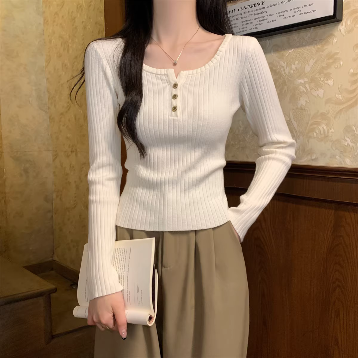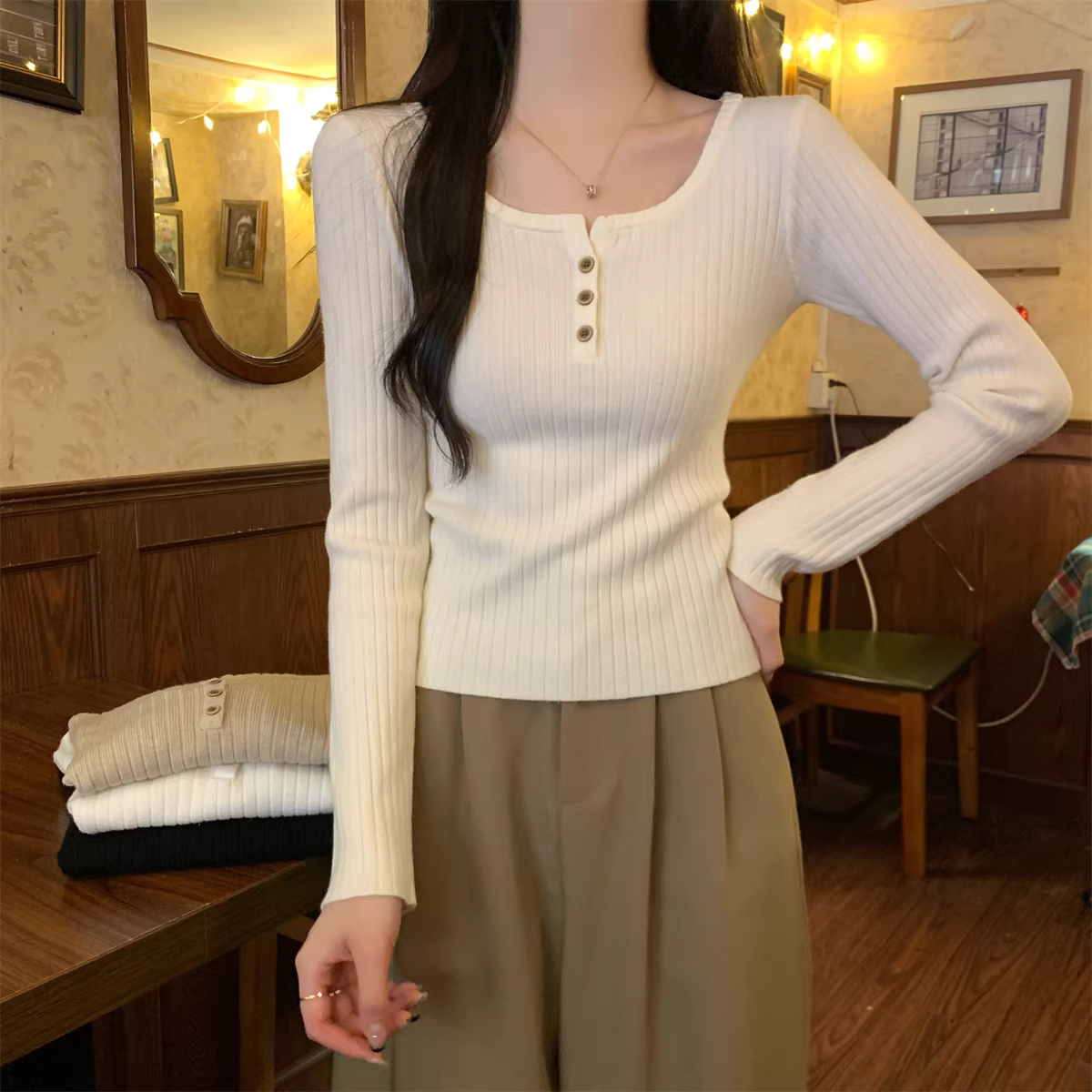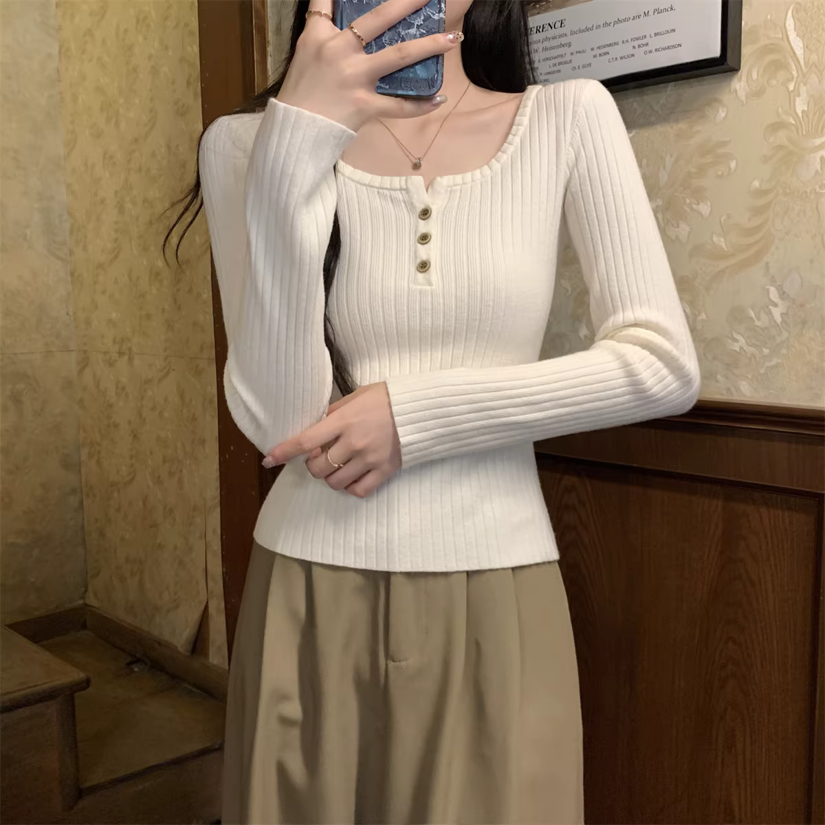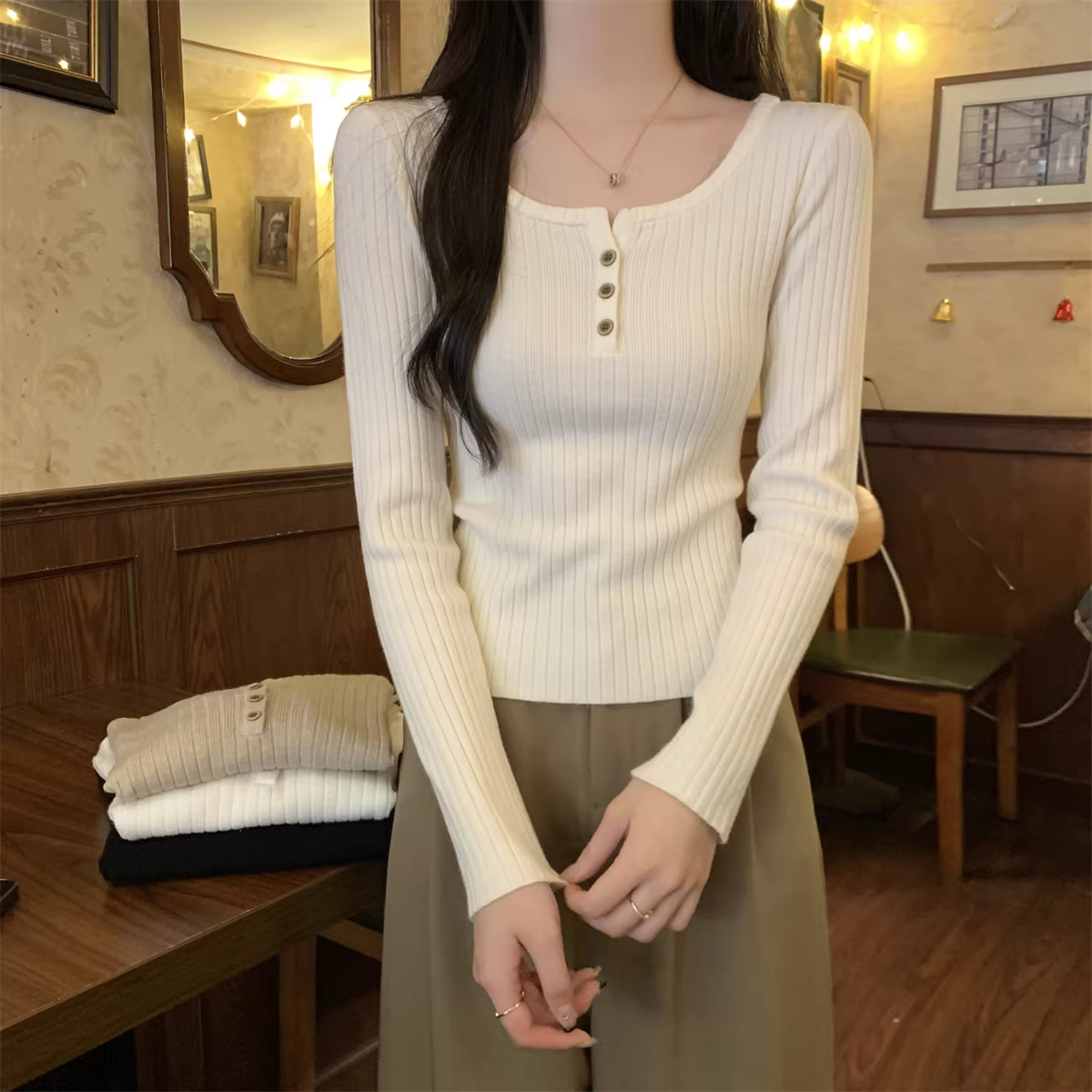 - Áo len cổ vuông tay dài La Chapelle dành cho nữ, thiết kế mới thu đông 2025, kiểu ôm sát, áo lót trong.