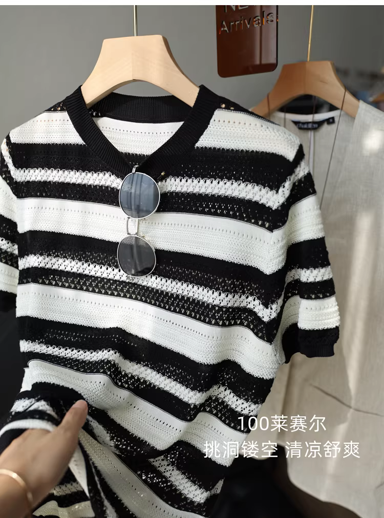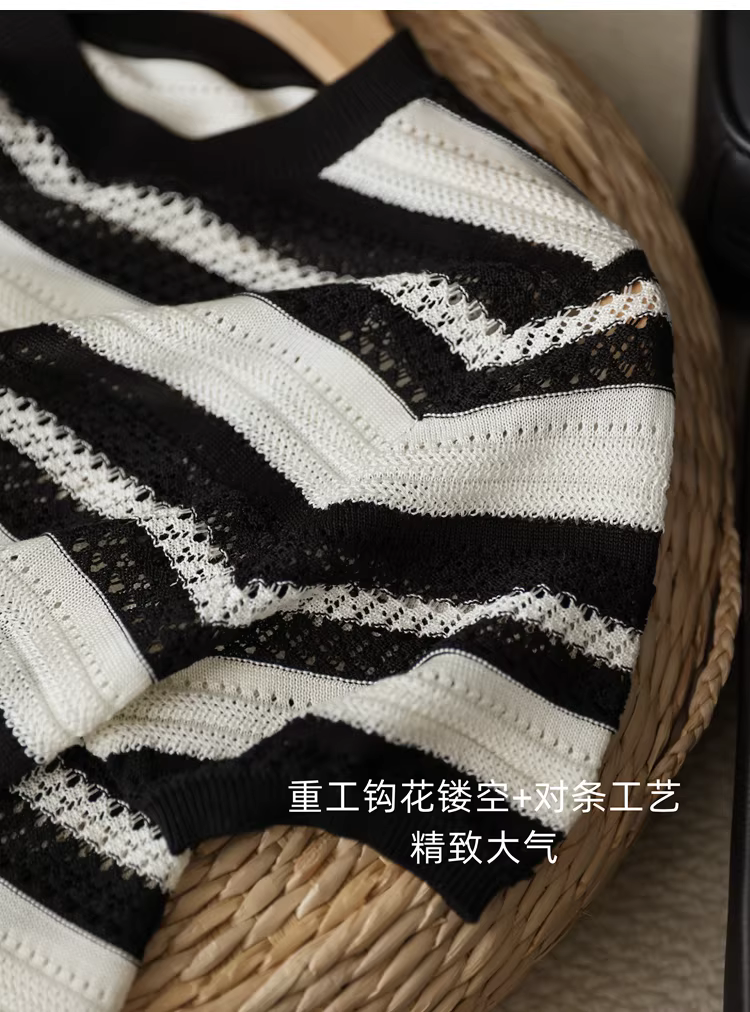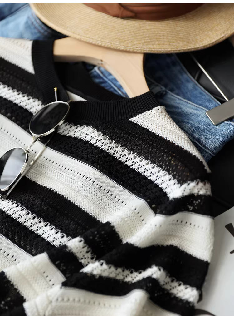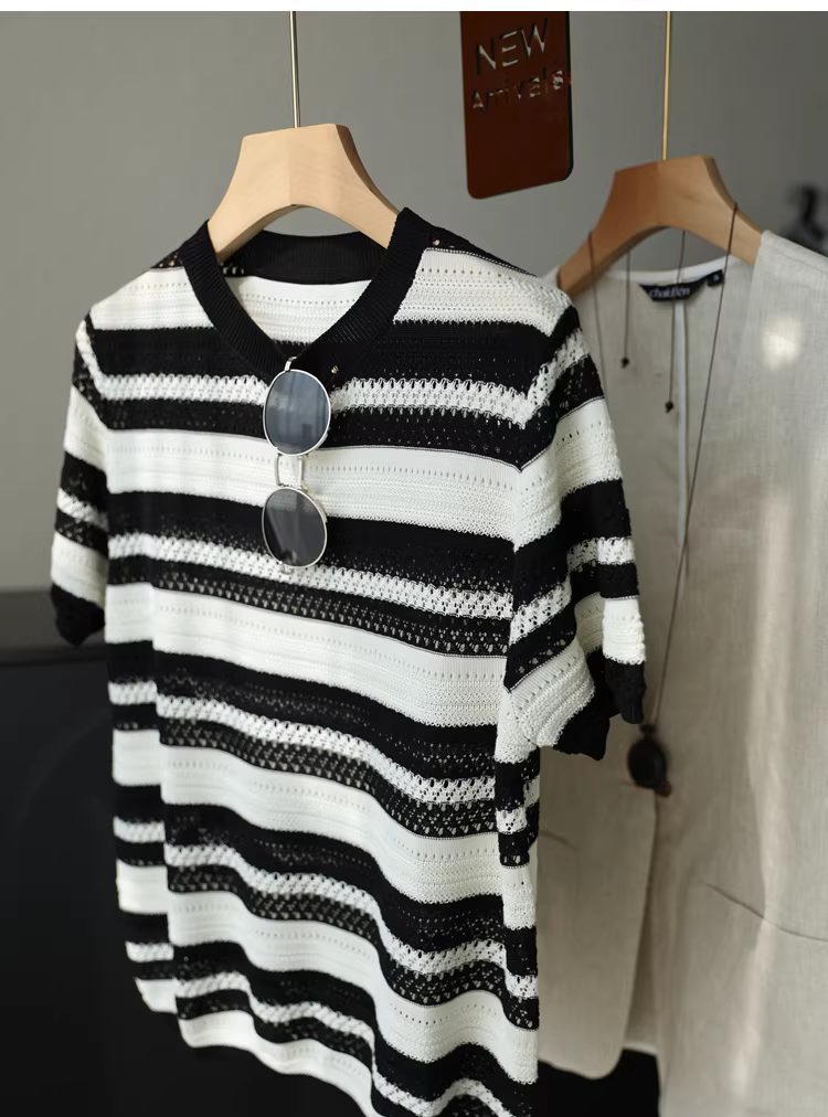 Áo len đan móc nặng 100% Lyocell có sọc đen trắng, cổ tròn, tay ngắn, áo dáng rộng cho nữ, hàng mới về mùa hè.