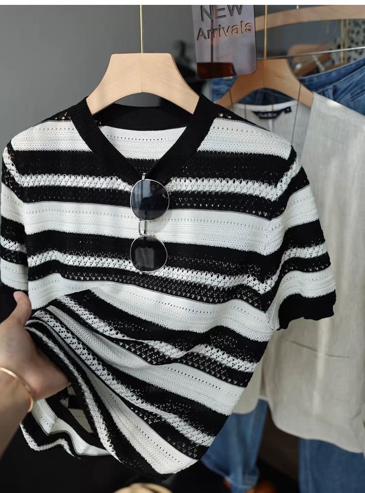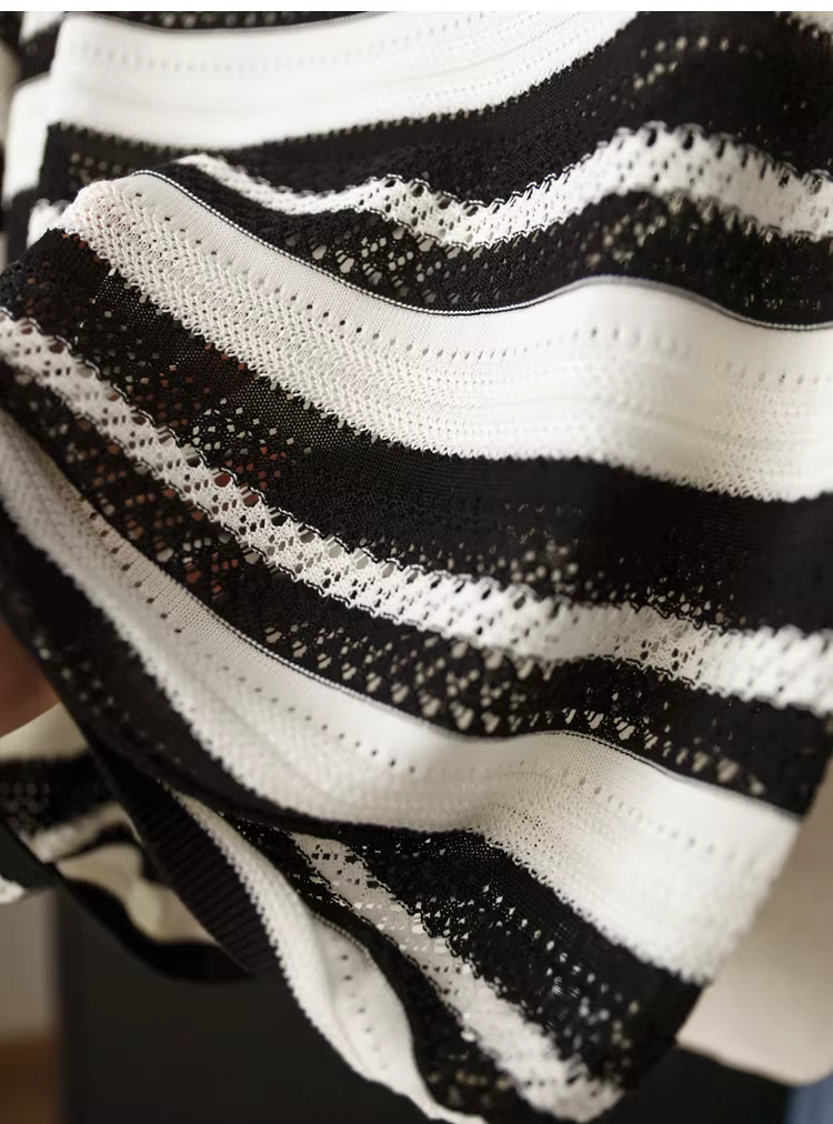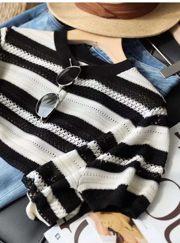 - Áo len đan móc nặng 100% Lyocell có sọc đen trắng, cổ tròn, tay ngắn, áo dáng rộng cho nữ, hàng mới về mùa hè.