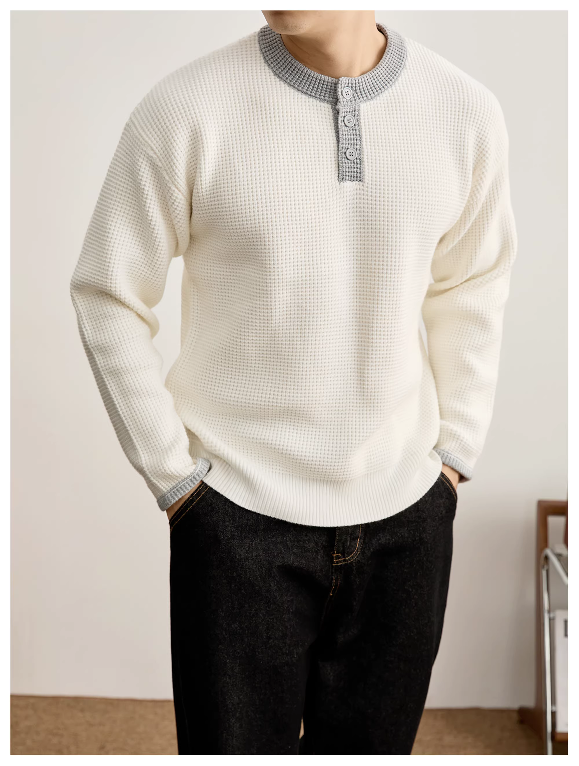 - Áo len dệt kim cổ Henry phối màu, chất liệu waffle, có lỗ cho ngón tay và thiết kế bảo vệ lòng bàn tay dành cho nam