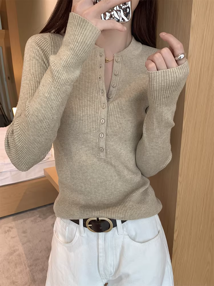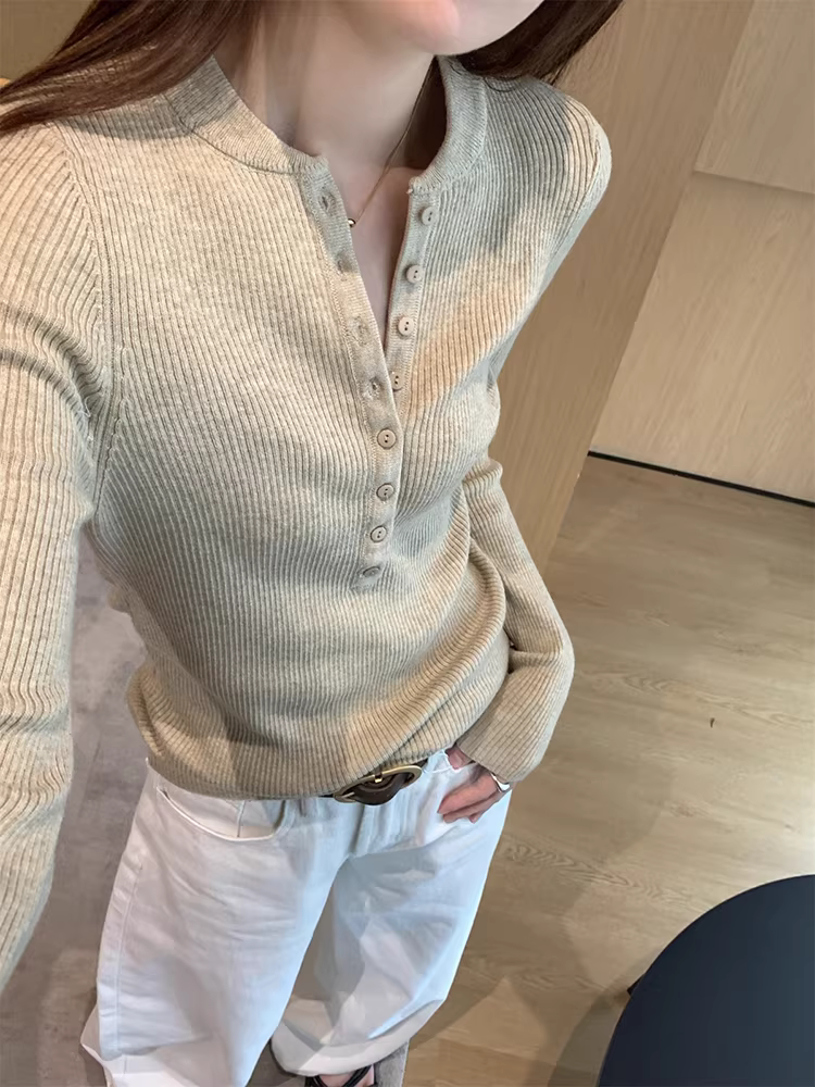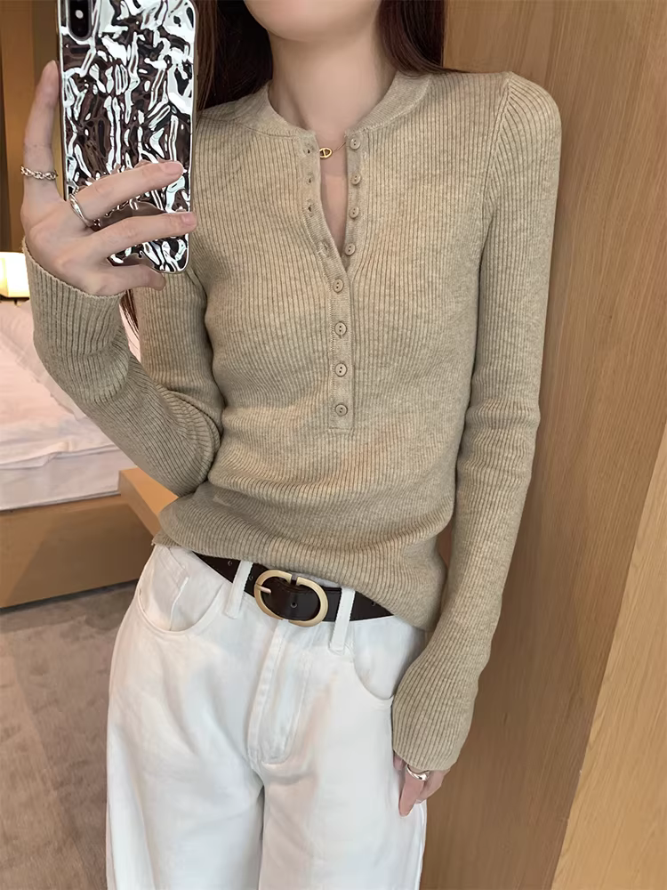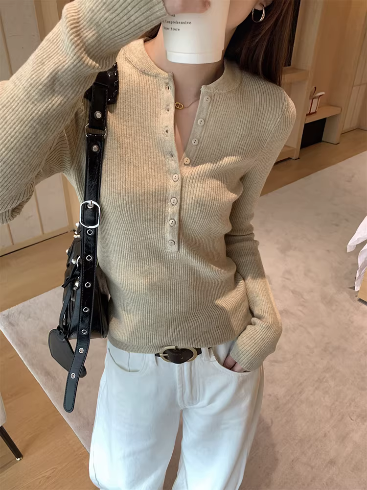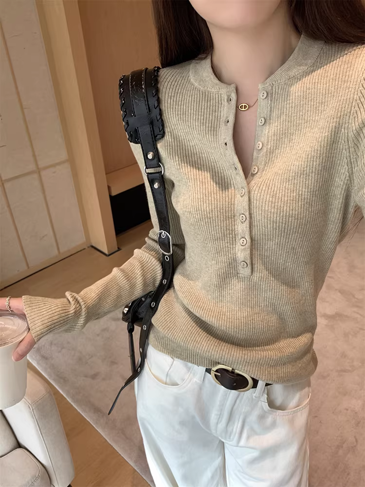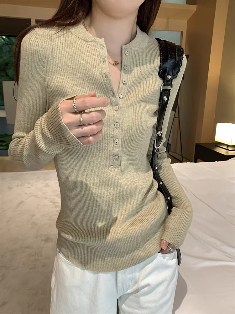 - Áo len dệt kim cổ nửa mở La Chapelle dành cho nữ, mẫu mới thu đông 2025, ôm dáng, mặc lót bên trong