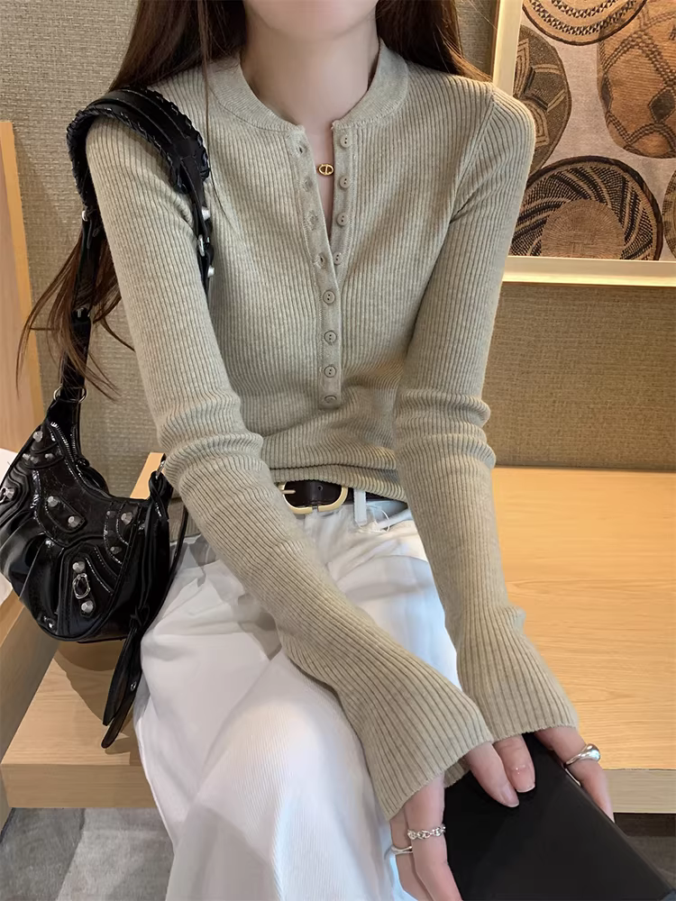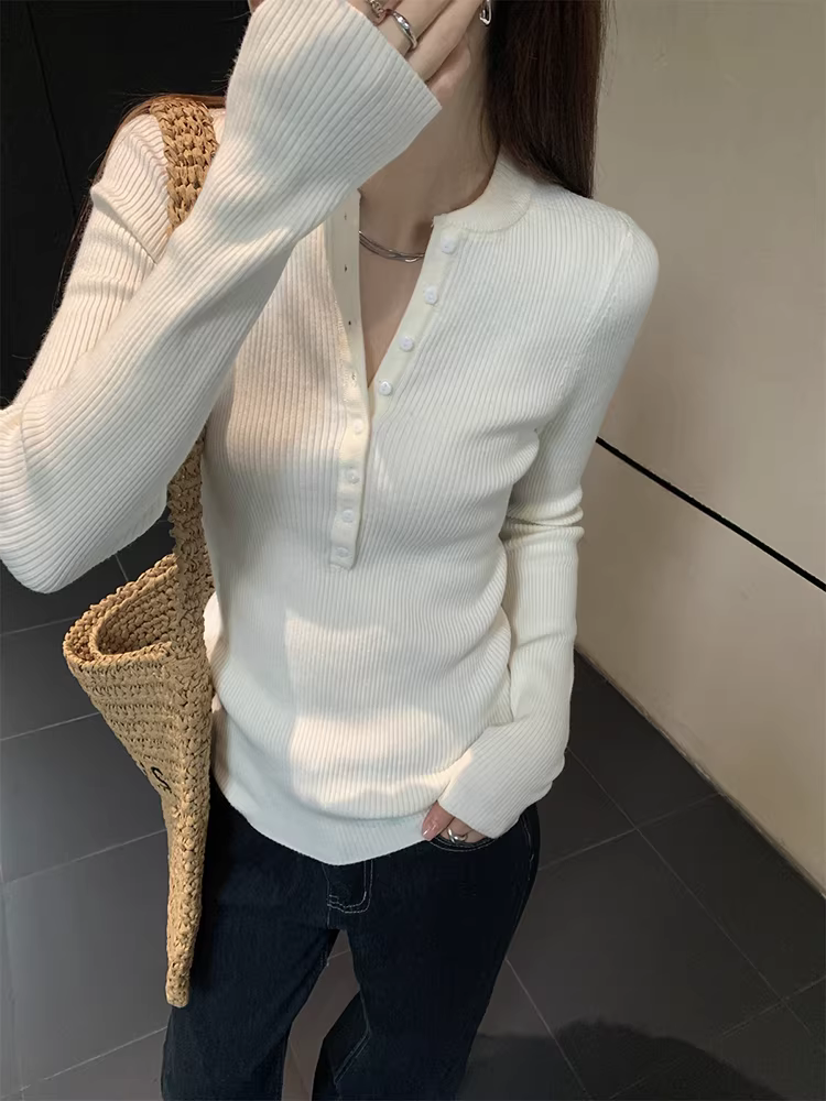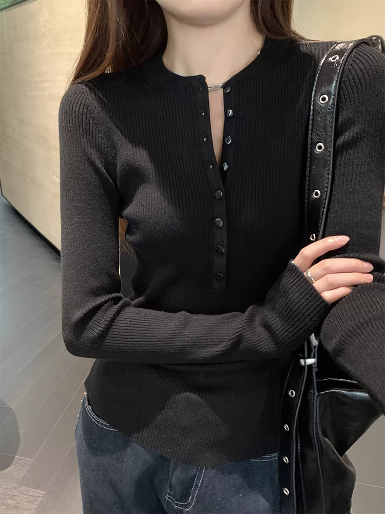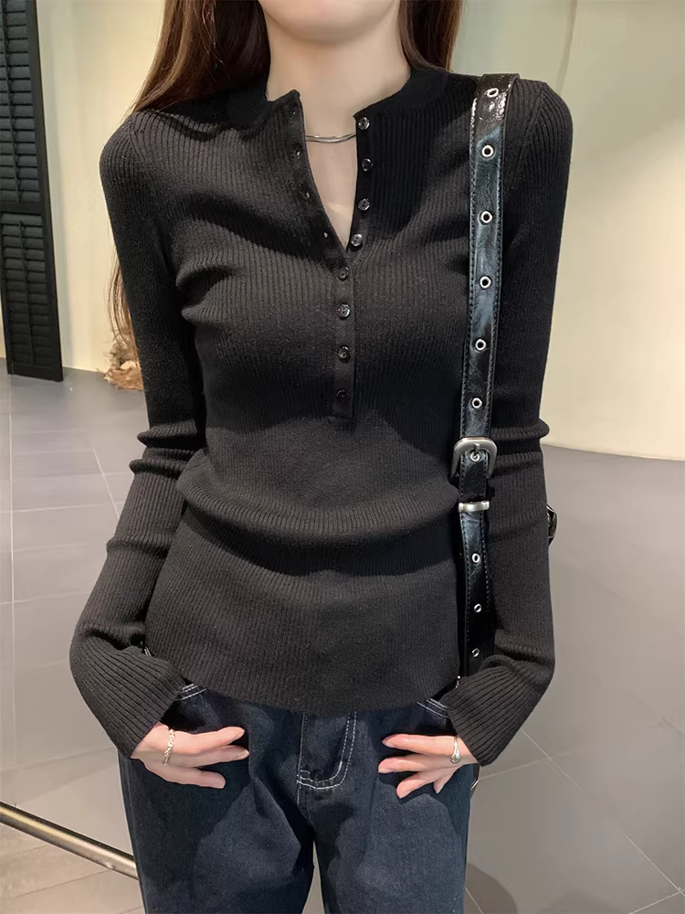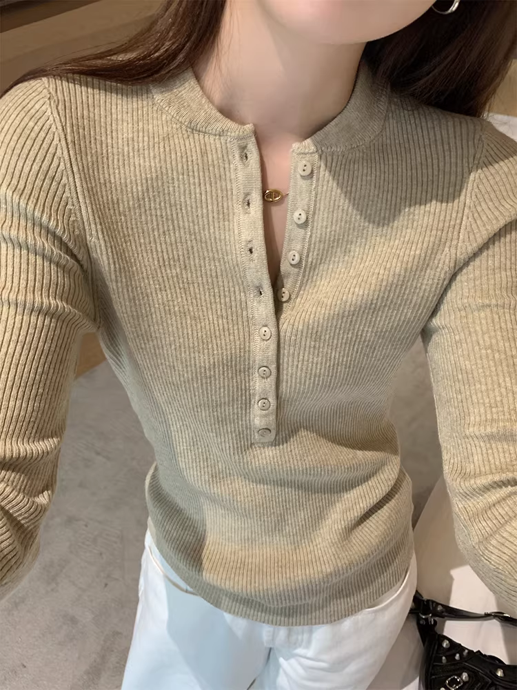 Áo len dệt kim cổ nửa mở La Chapelle dành cho nữ, mẫu mới thu đông 2025, ôm dáng, mặc lót bên trong