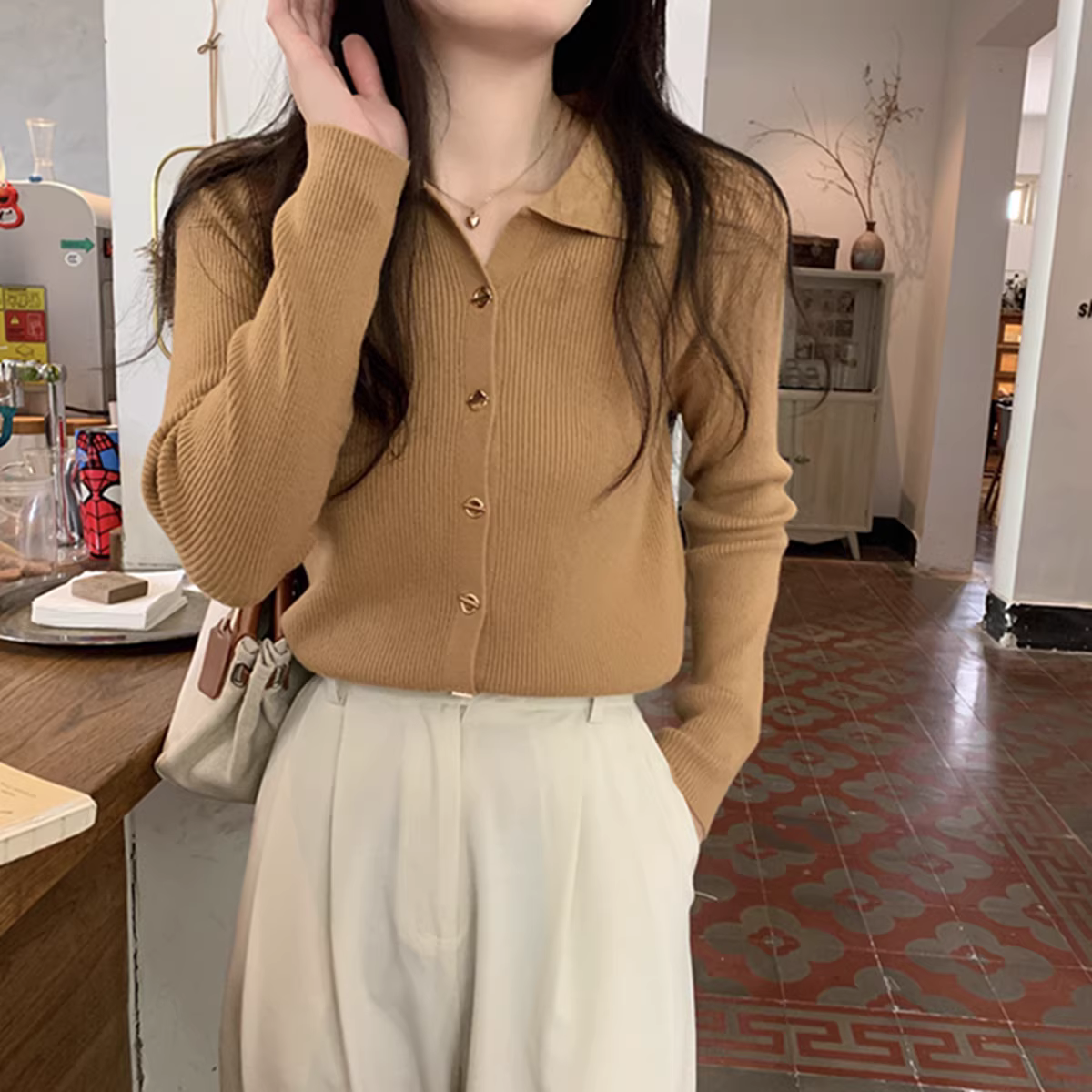 Áo len dệt kim cổ polo màu sáng La Chapelle tay dài dành cho nữ, kiểu dáng ôm sát, mùa thu 2025, áo khoác cardigan mặc trong