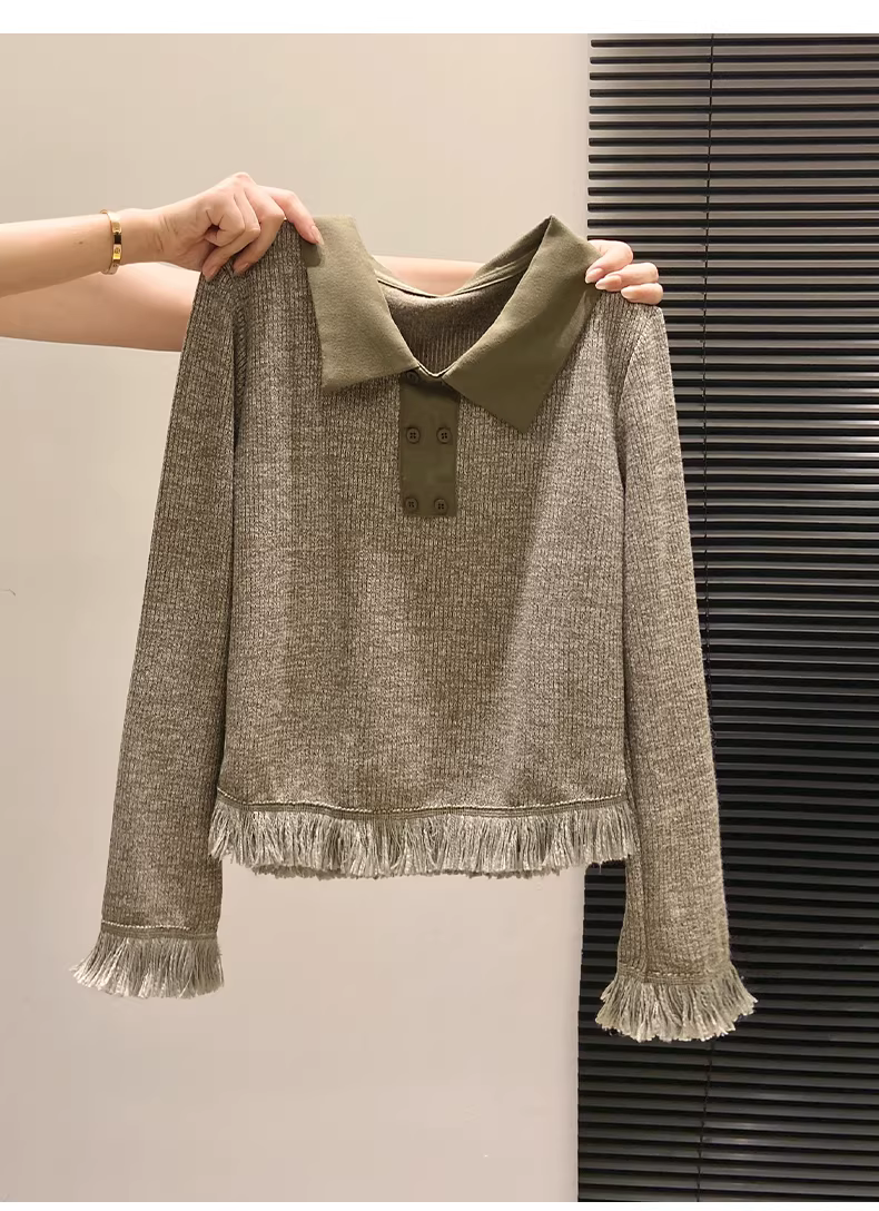Áo len dệt kim cổ polo màu xanh La Chapelle dành cho nữ, thiết kế nhỏ nhắn, kiểu tua rua, mới mùa thu đông 2025