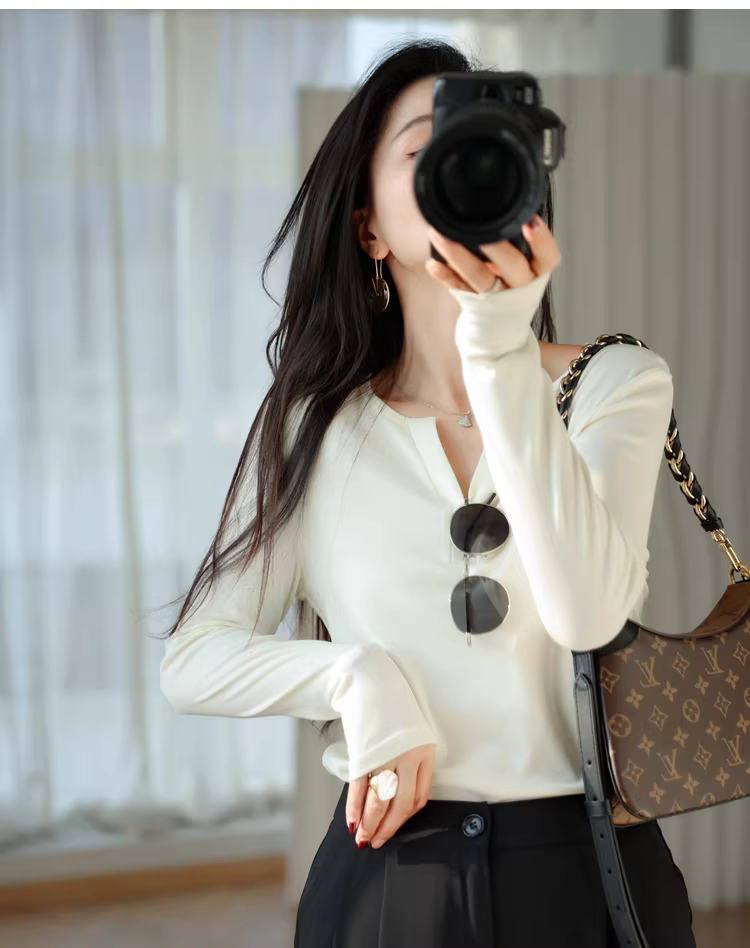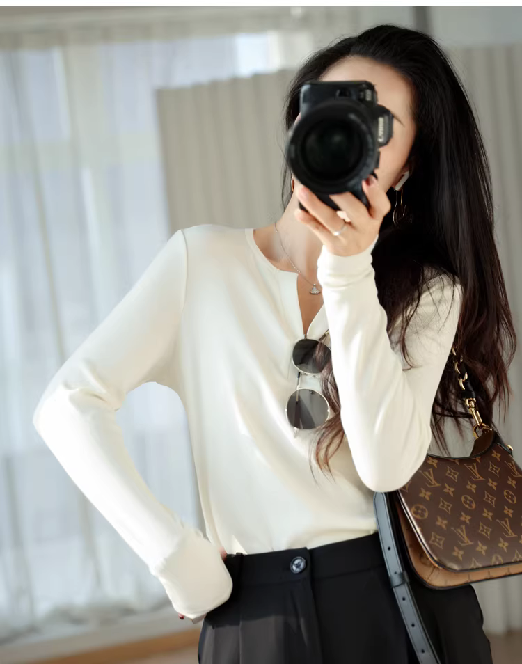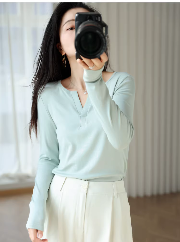 Áo len dệt kim cổ V dáng ôm, chất liệu len Tencel mềm mại, co giãn tốt, tạo cảm giác thoải mái như không mặc, màu trơn, thích hợp làm áo lót cho nữ mùa thu.