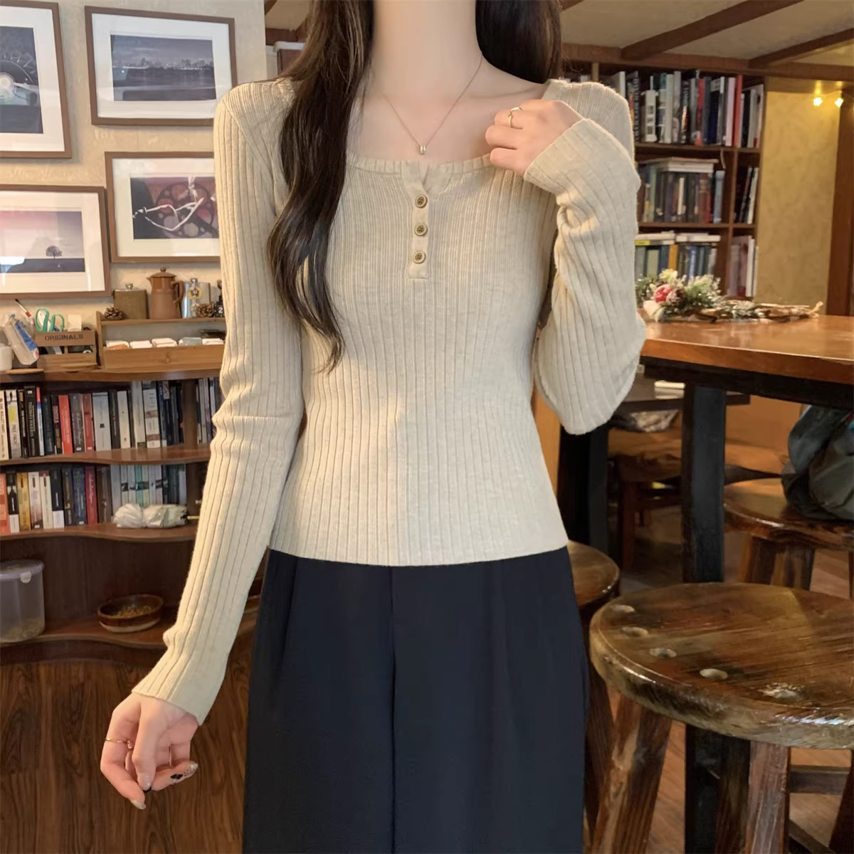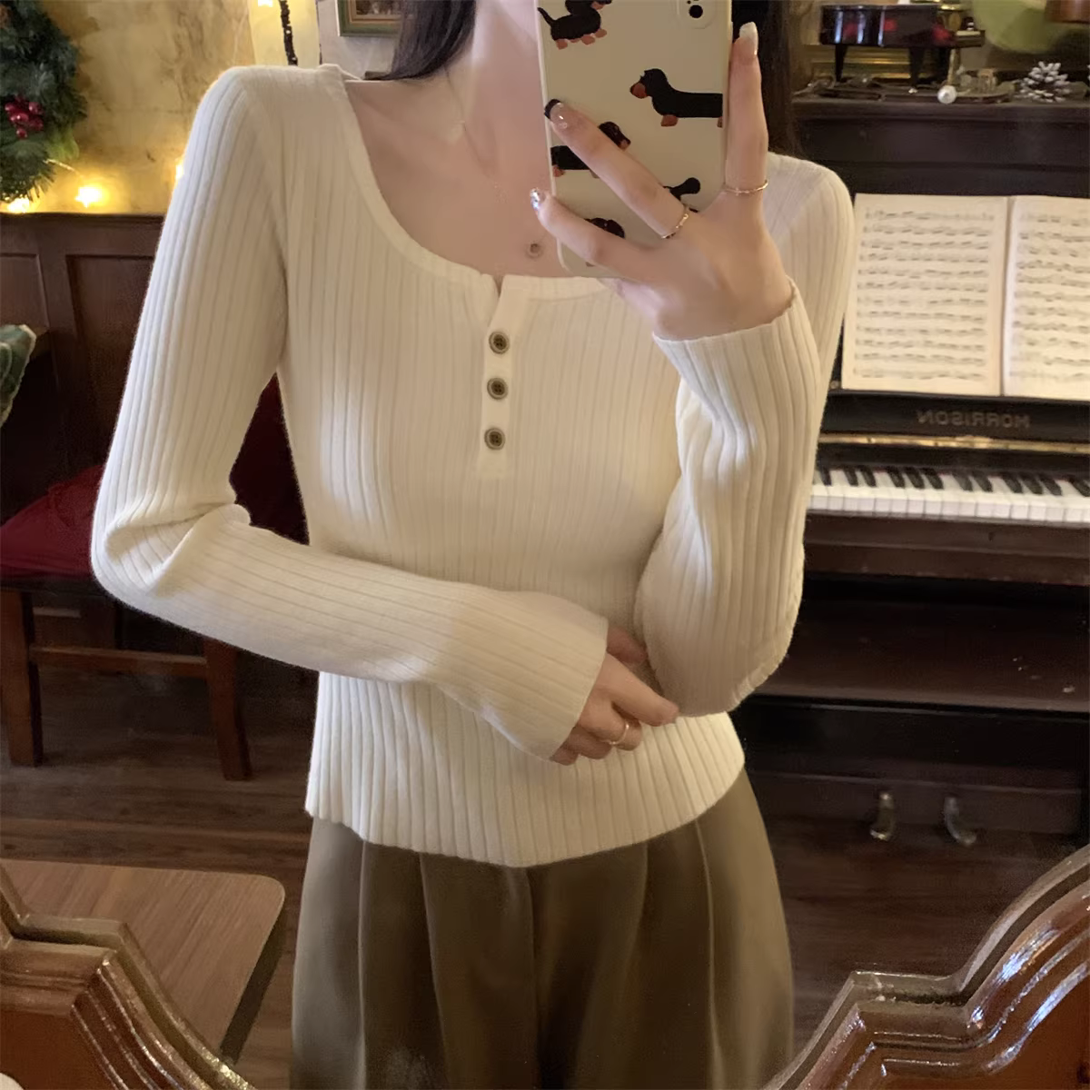 Áo len dệt kim cổ vuông tay dài màu đen La Chapelle dành cho nữ, áo lót ôm sát kiểu mới mùa thu đông 2025.