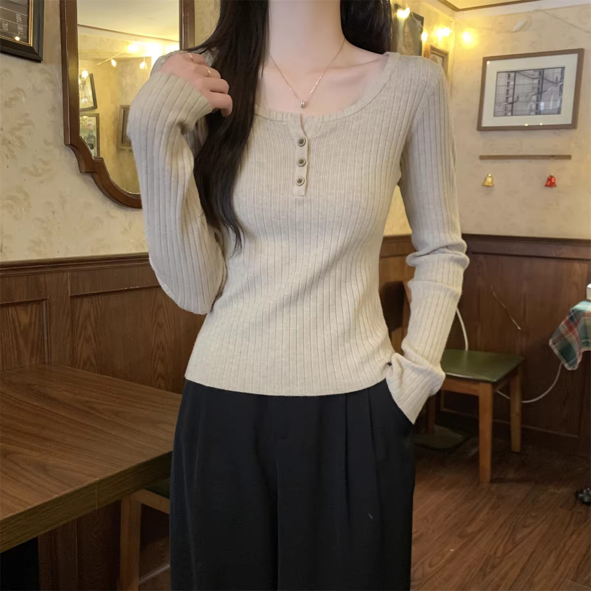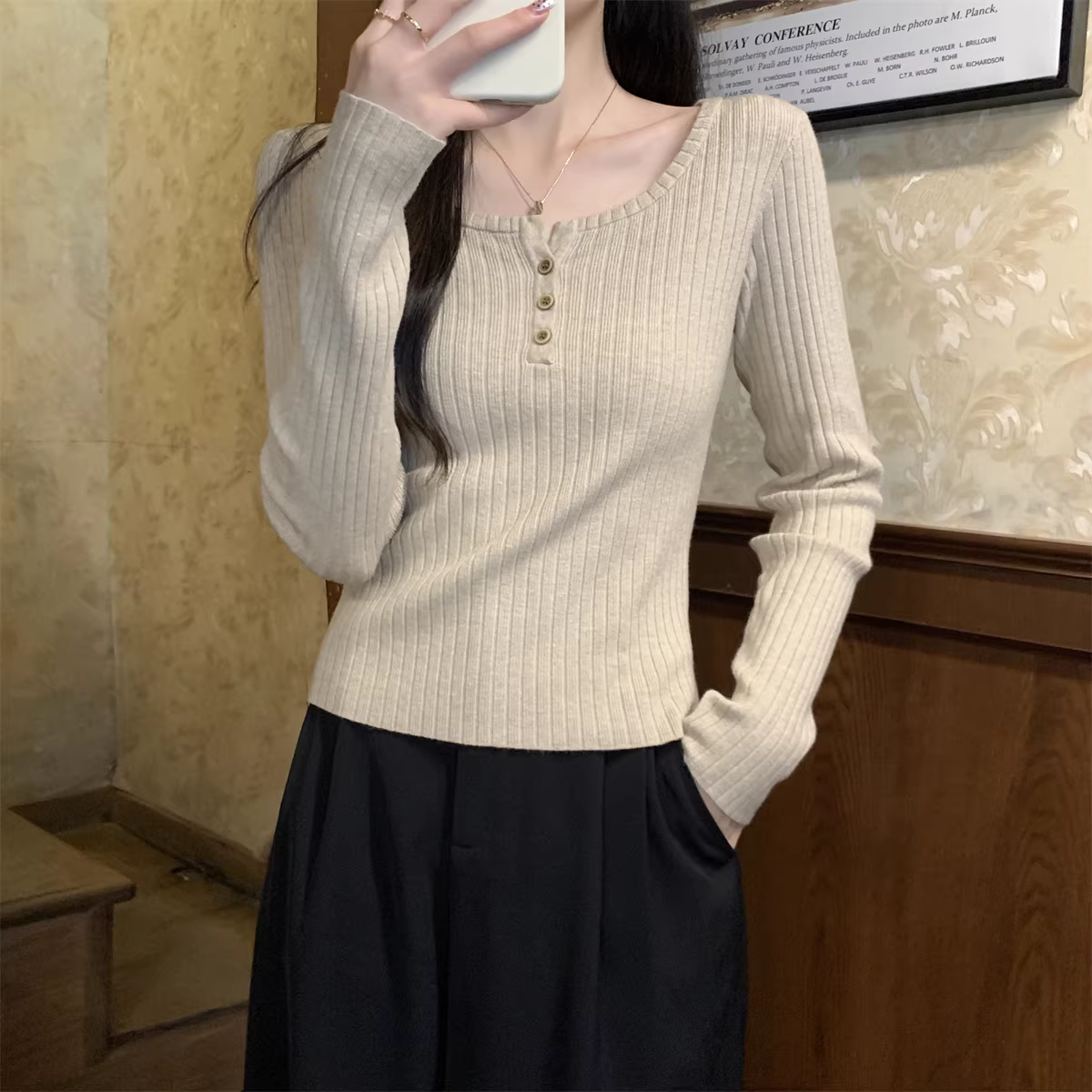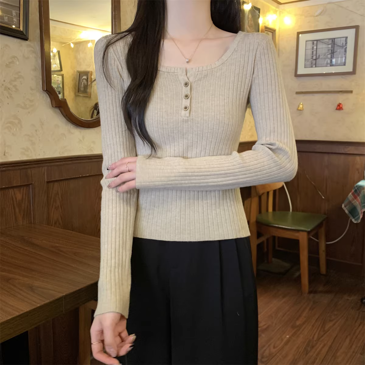 - Áo len dệt kim cổ vuông tay dài màu đen La Chapelle dành cho nữ, áo lót ôm sát kiểu mới mùa thu đông 2025.