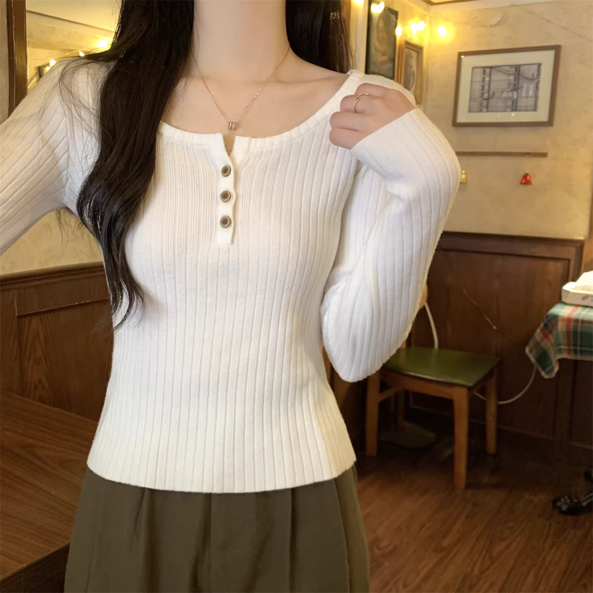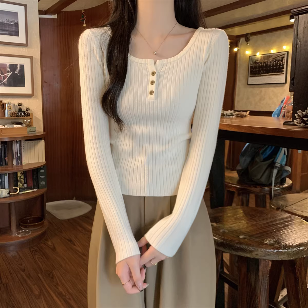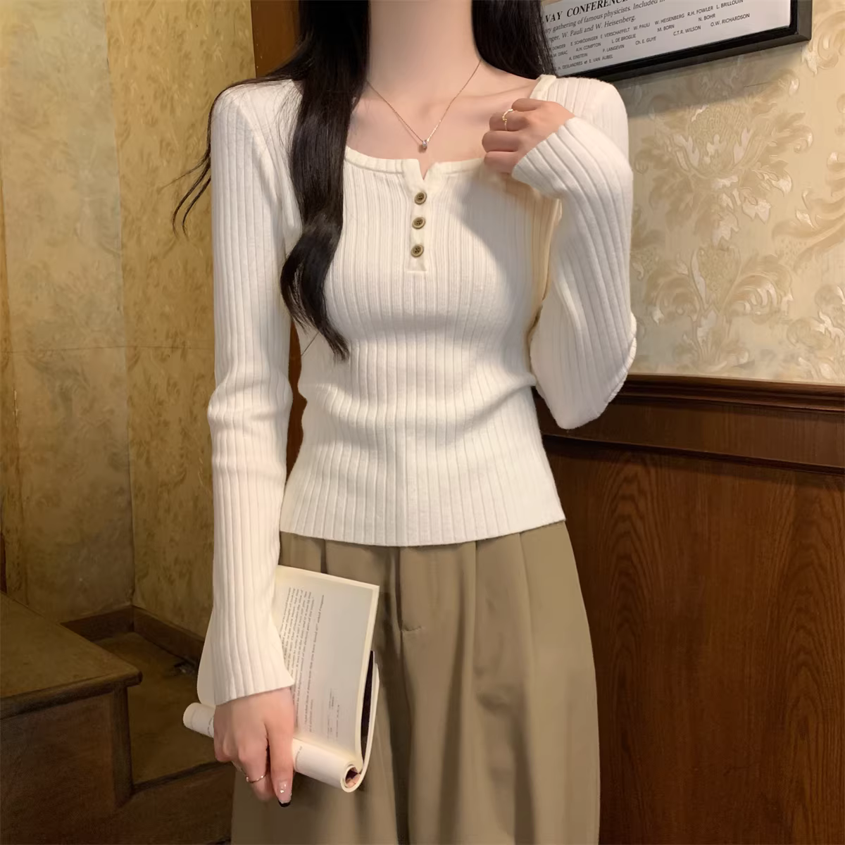 - Áo len dệt kim cổ vuông tay dài màu đen La Chapelle dành cho nữ, áo lót ôm sát kiểu mới mùa thu đông 2025.