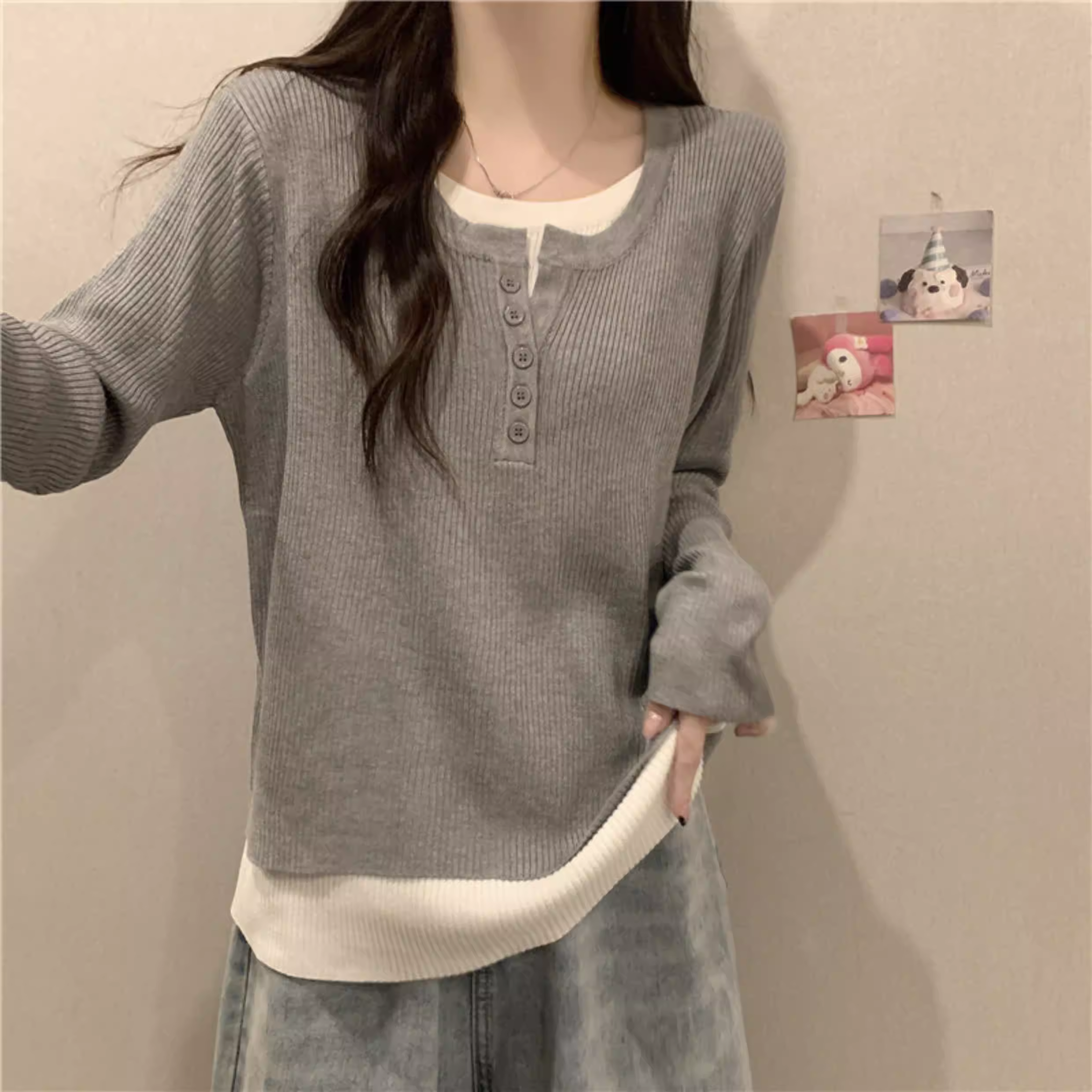 Áo len dệt kim giả hai lớp tay dài La Chapelle dành cho nữ, mẫu mới thu đông 2025, màu xám, kiểu rộng, mặc lót bên trong
