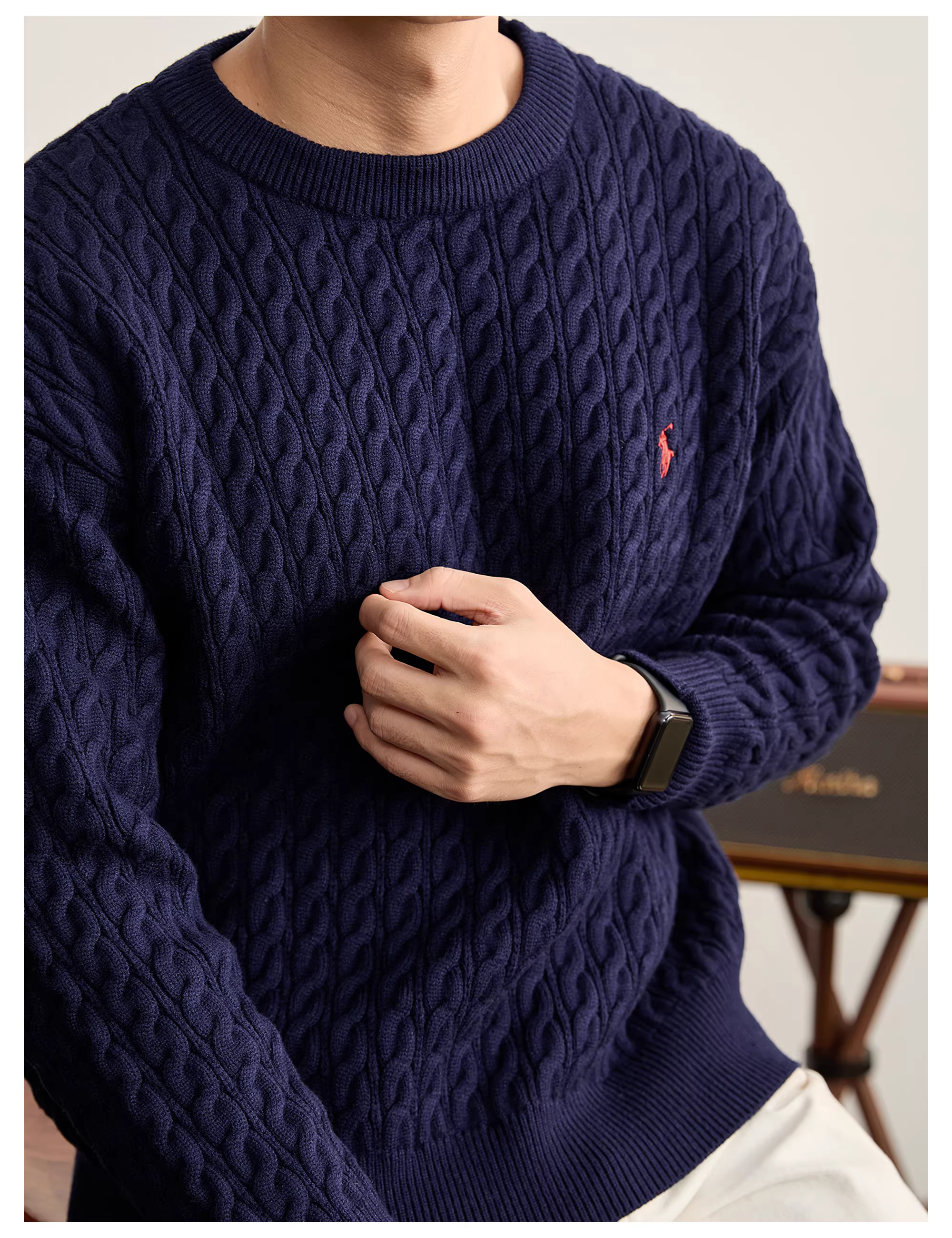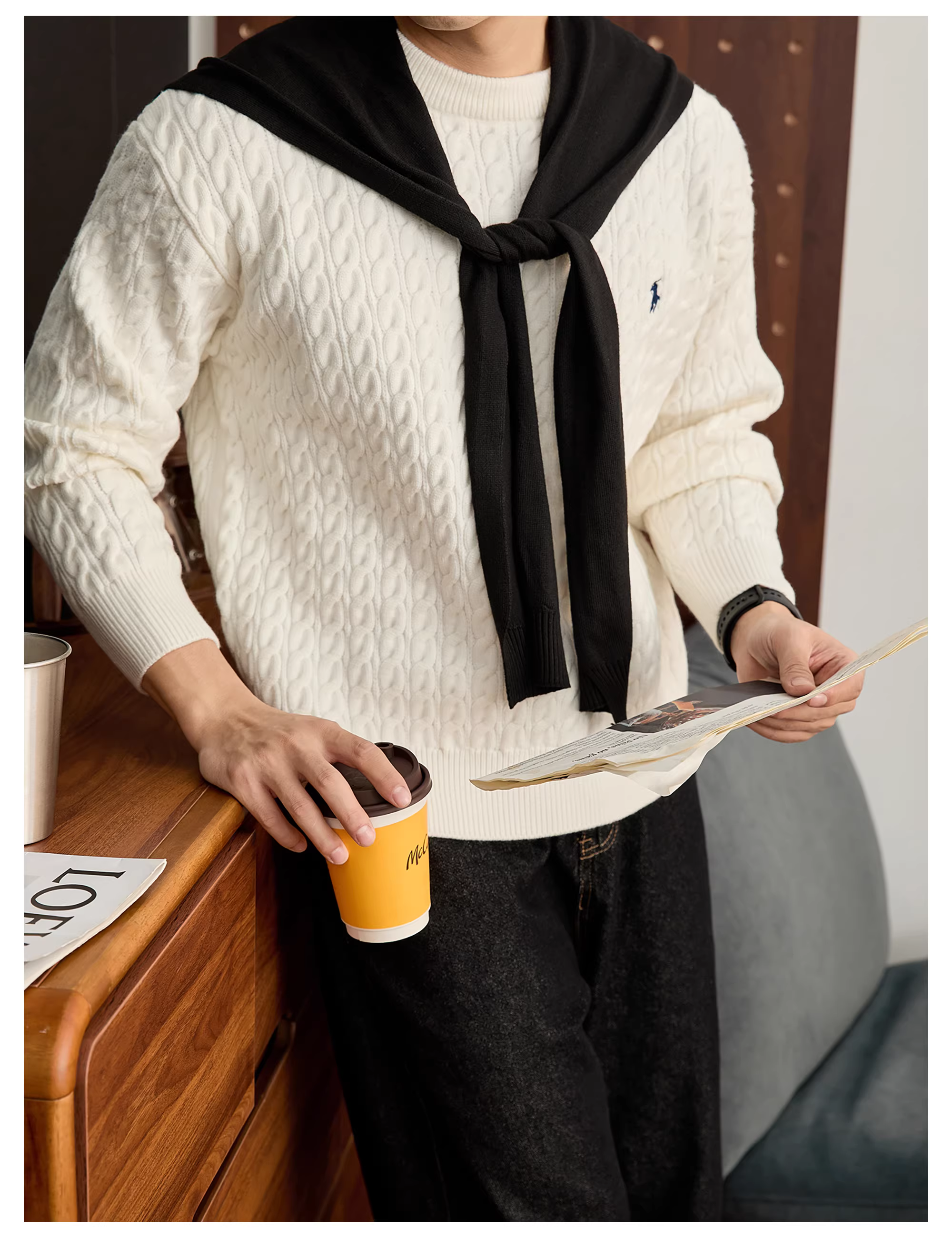 Áo len dệt kim kiểu cáp LUUD Modal Core-spun, thêu họa tiết hiệp sĩ, chống xù, cổ tròn dành cho nam mùa đông