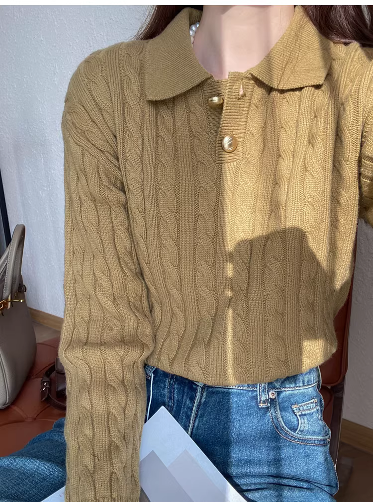 Áo len dệt kim kiểu cổ Polo, nút vàng nhỏ phong cách retro, chất liệu len dày 400g, giữ ấm, kiểu dáng lười dành cho nữ mùa thu đông