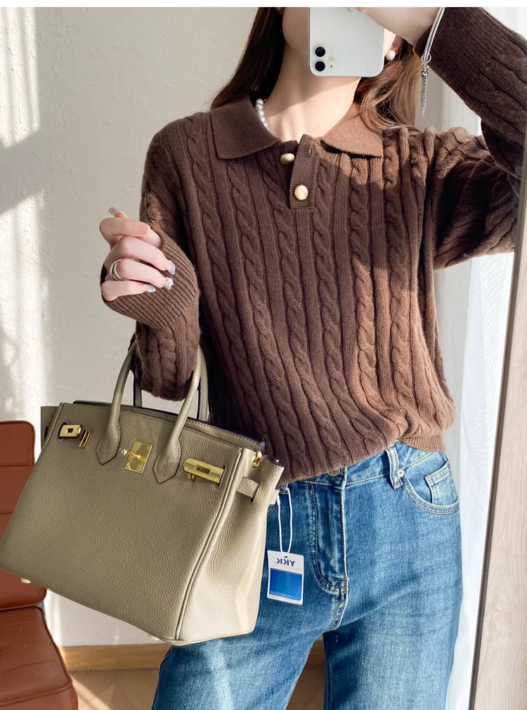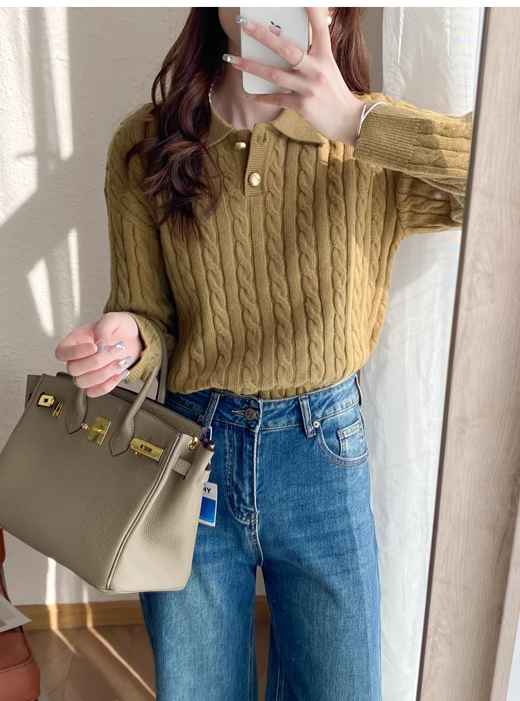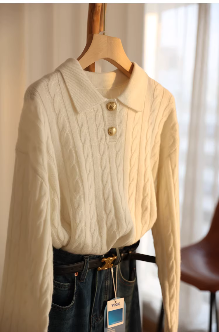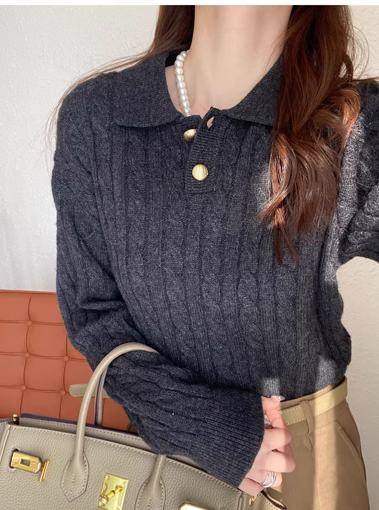 - Áo len dệt kim kiểu cổ Polo, nút vàng nhỏ phong cách retro, chất liệu len dày 400g, giữ ấm, kiểu dáng lười dành cho nữ mùa thu đông