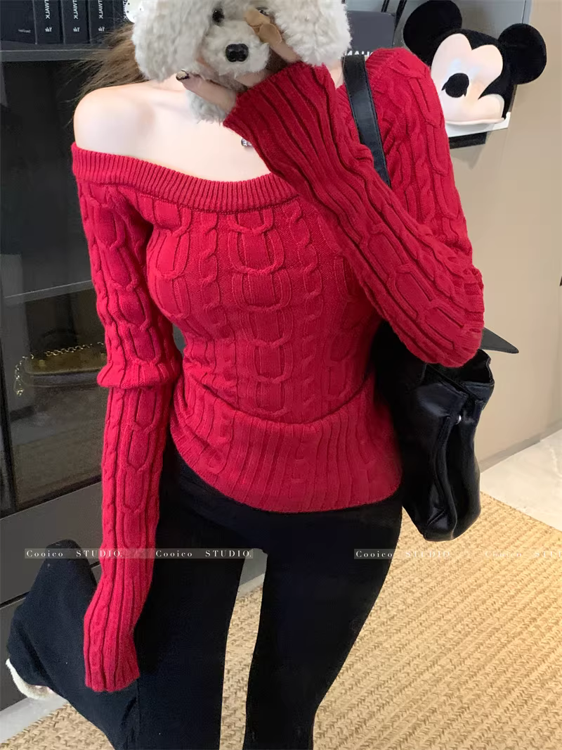 Áo len dệt kim màu trắng dành cho nữ, quần áo nữ mùa thu đông, áo len dệt kim, áo sơ mi dài tay trễ vai.