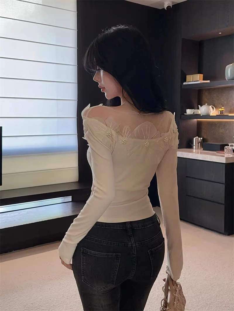Áo len dệt kim màu trắng nhạt dành cho nữ, áo sơ mi dài tay mùa xuân thu có phối lưới, áo mỏng độc đáo và đẹp mắt.