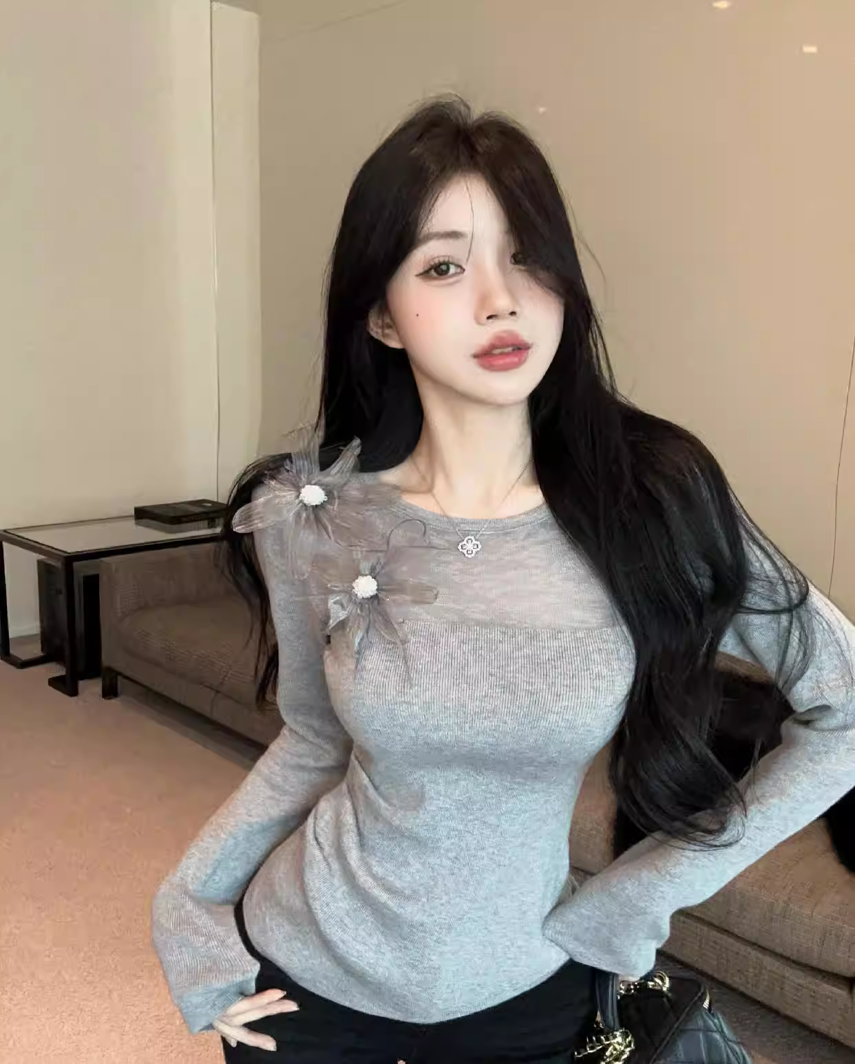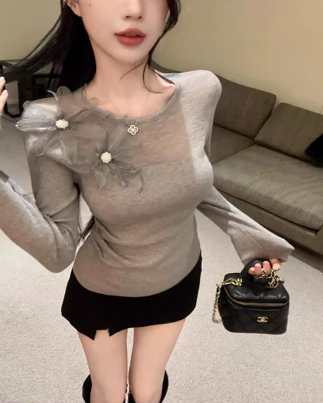 Áo len dệt kim màu xám dành cho nữ, áo sơ mi dài tay mùa xuân thu, áo len có phối lưới mỏng, áo kiểu dáng thời trang và trưởng thành.