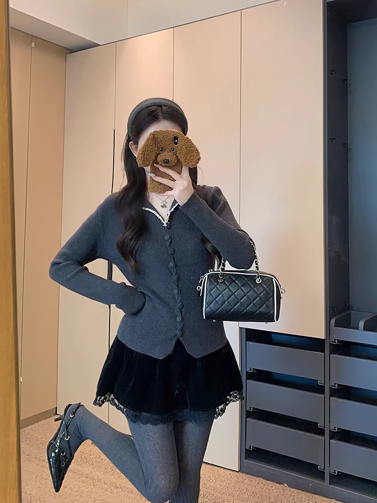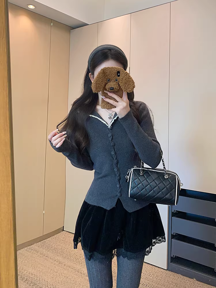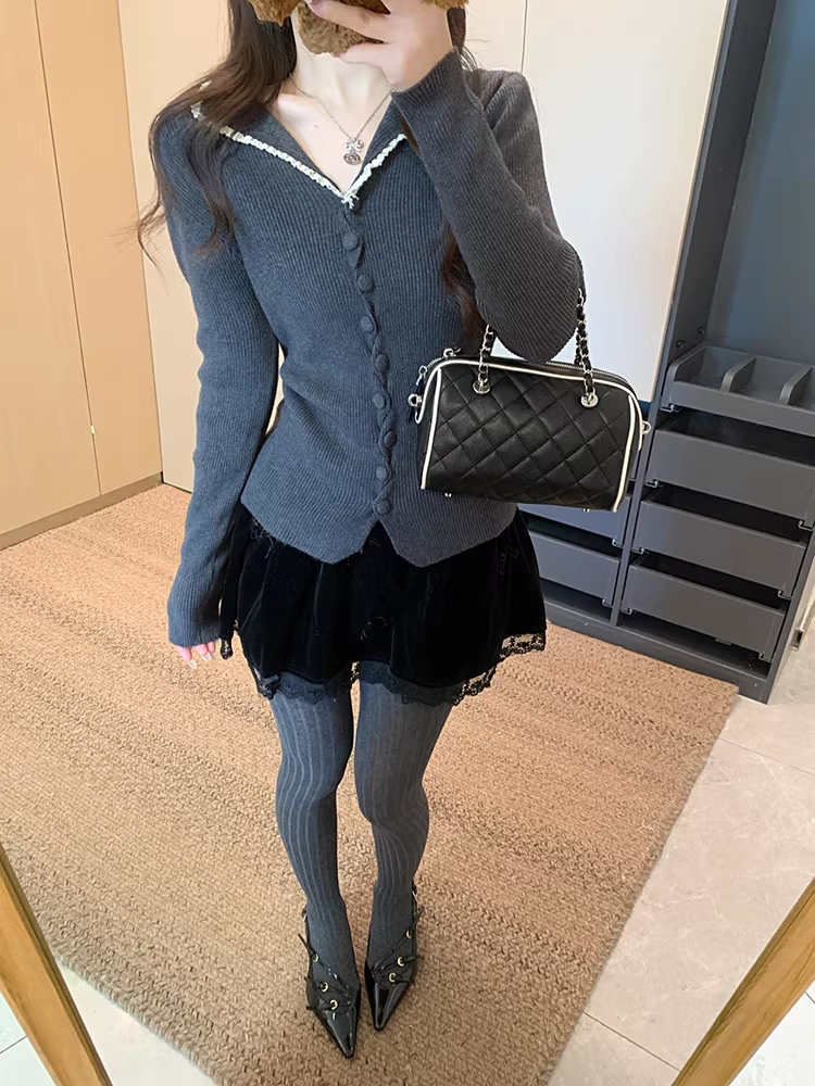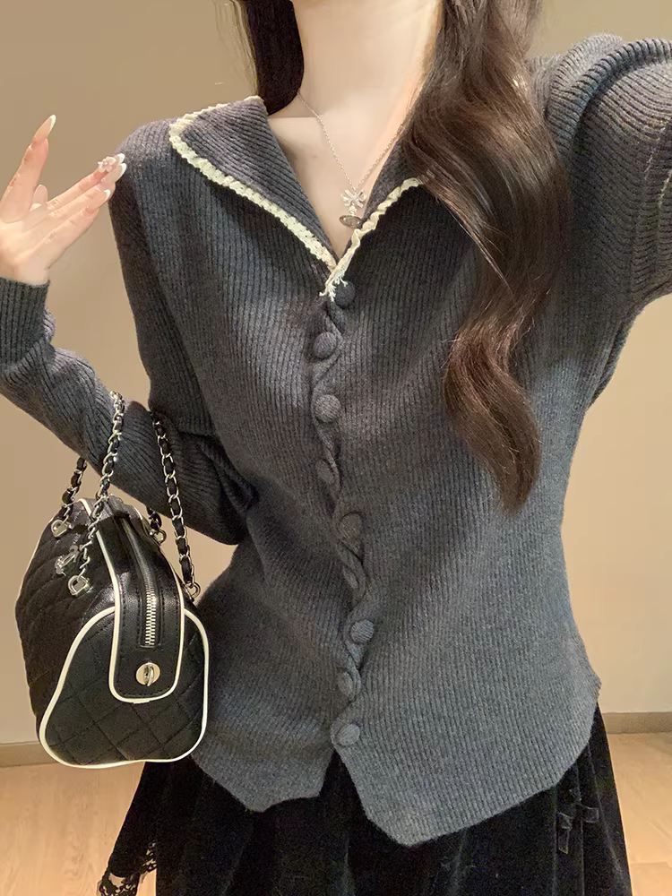 Áo len dệt kim màu xám La Chapelle dành cho nữ, mẫu mới thu đông 2025, kiểu dáng thắt eo, tôn dáng.