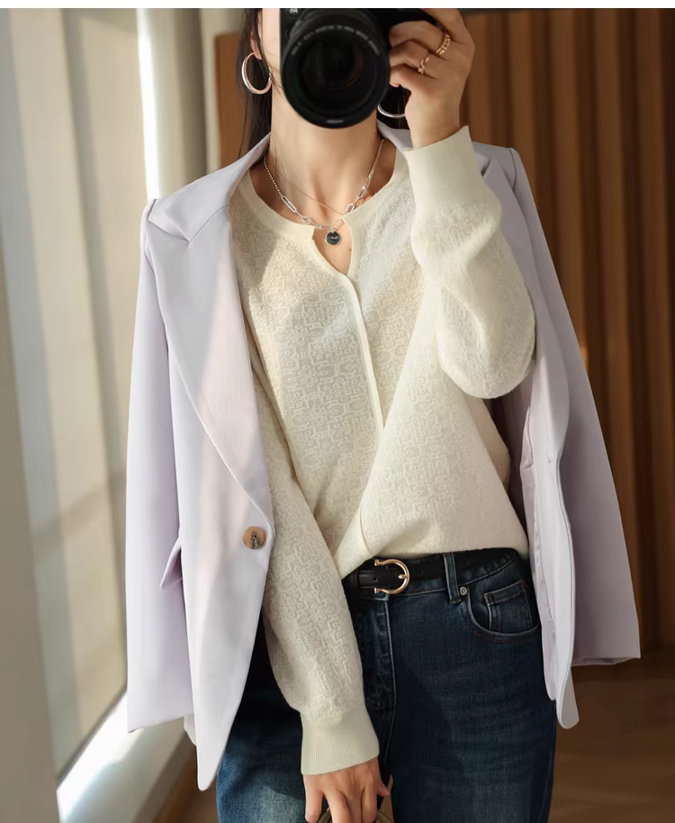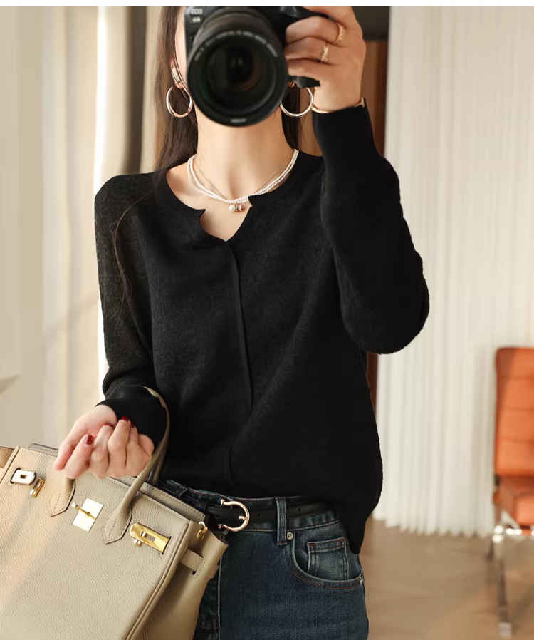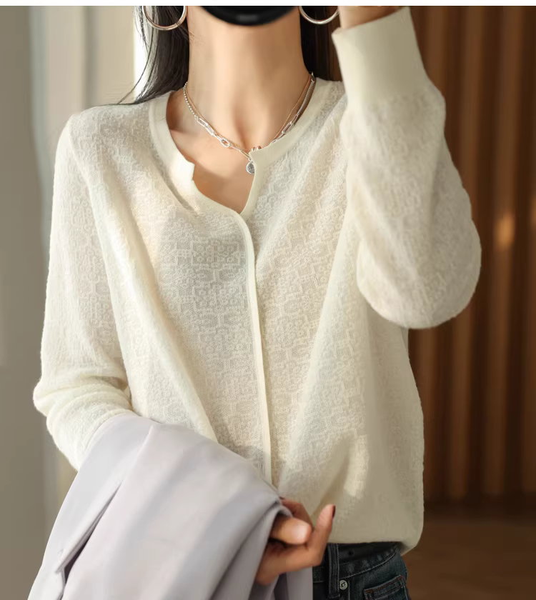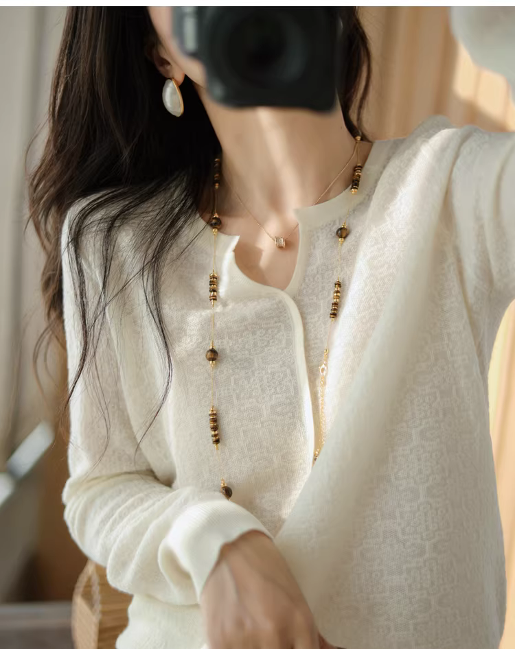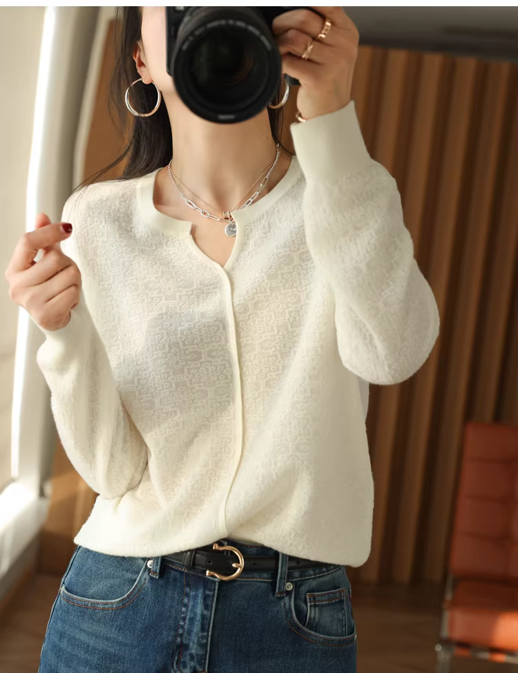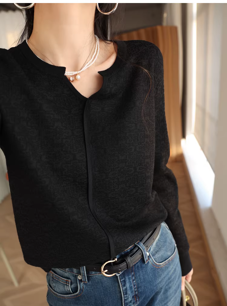- Áo len len phong cách Trung Quốc mới ren jacquard cổ chữ V dệt kim dài tay áo thun mỏng dành cho nữ đầu xuân