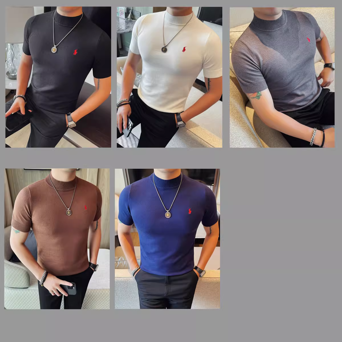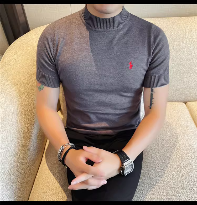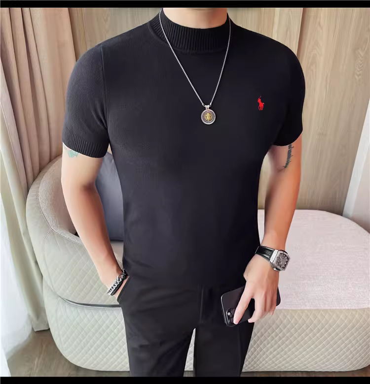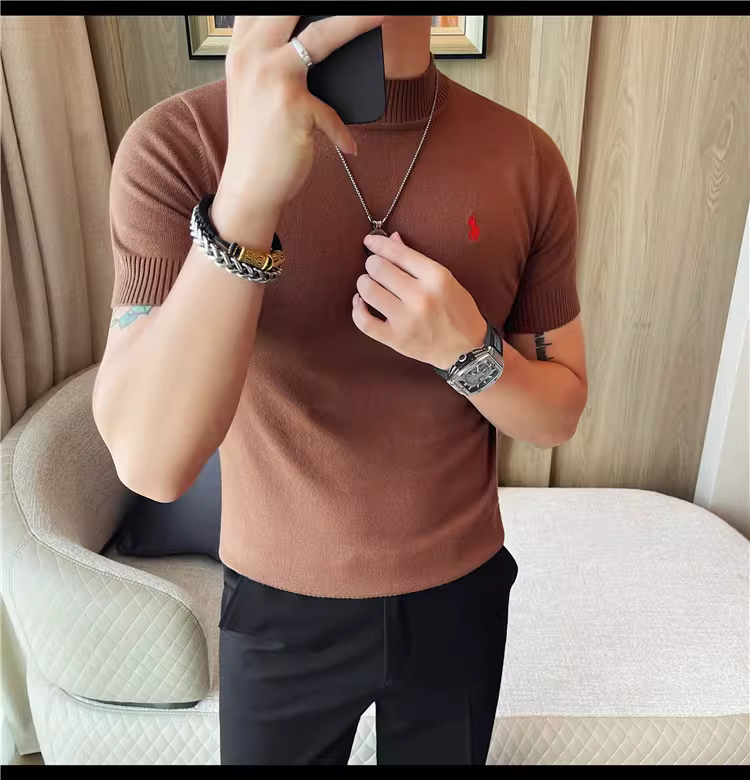 - Áo len nam cổ lọ nửa cao tay ngắn, kiểu mới thu đông 2025, thiết kế thêu cao cấp, kiểu dáng ôm sát cổ trung, chất liệu dệt kim