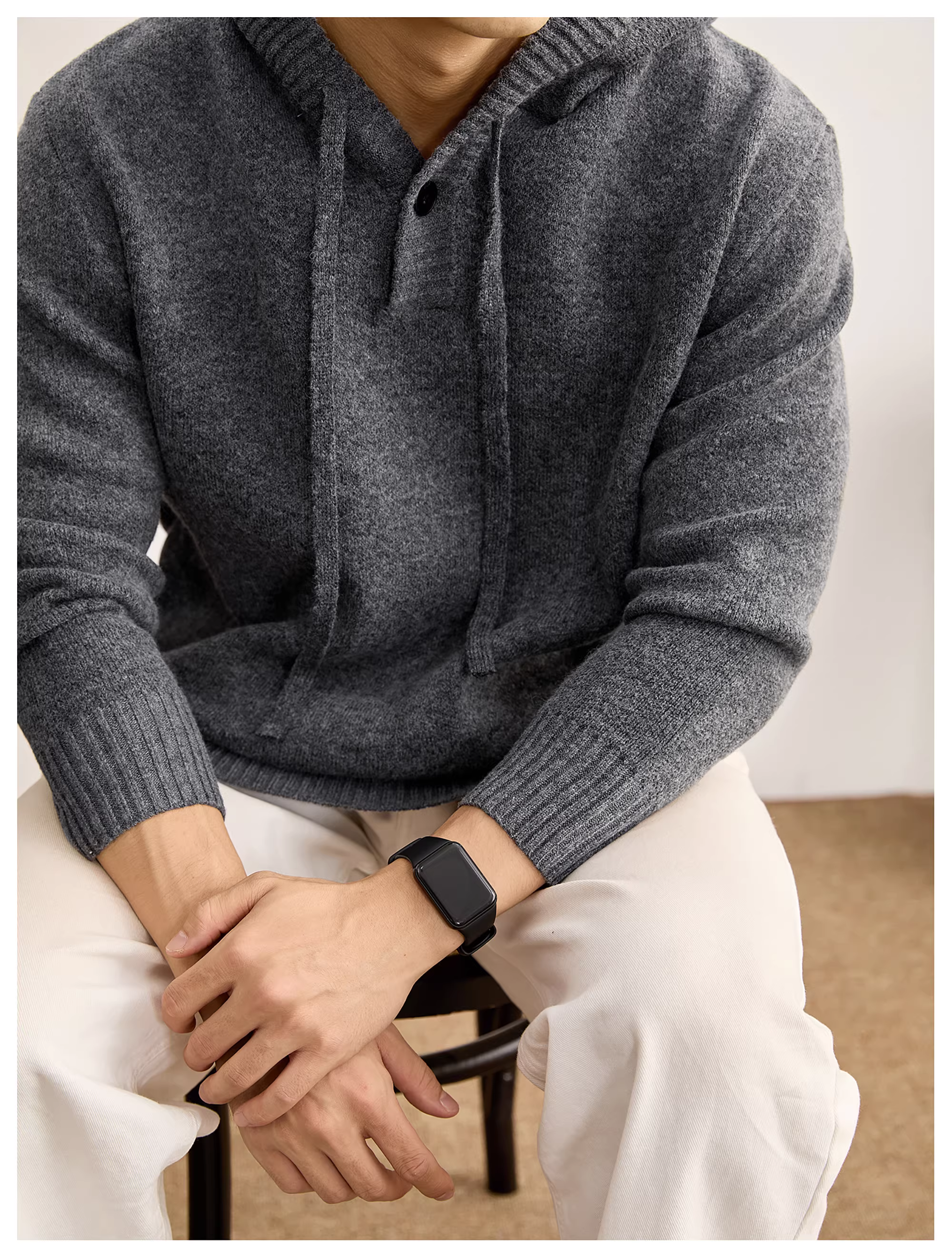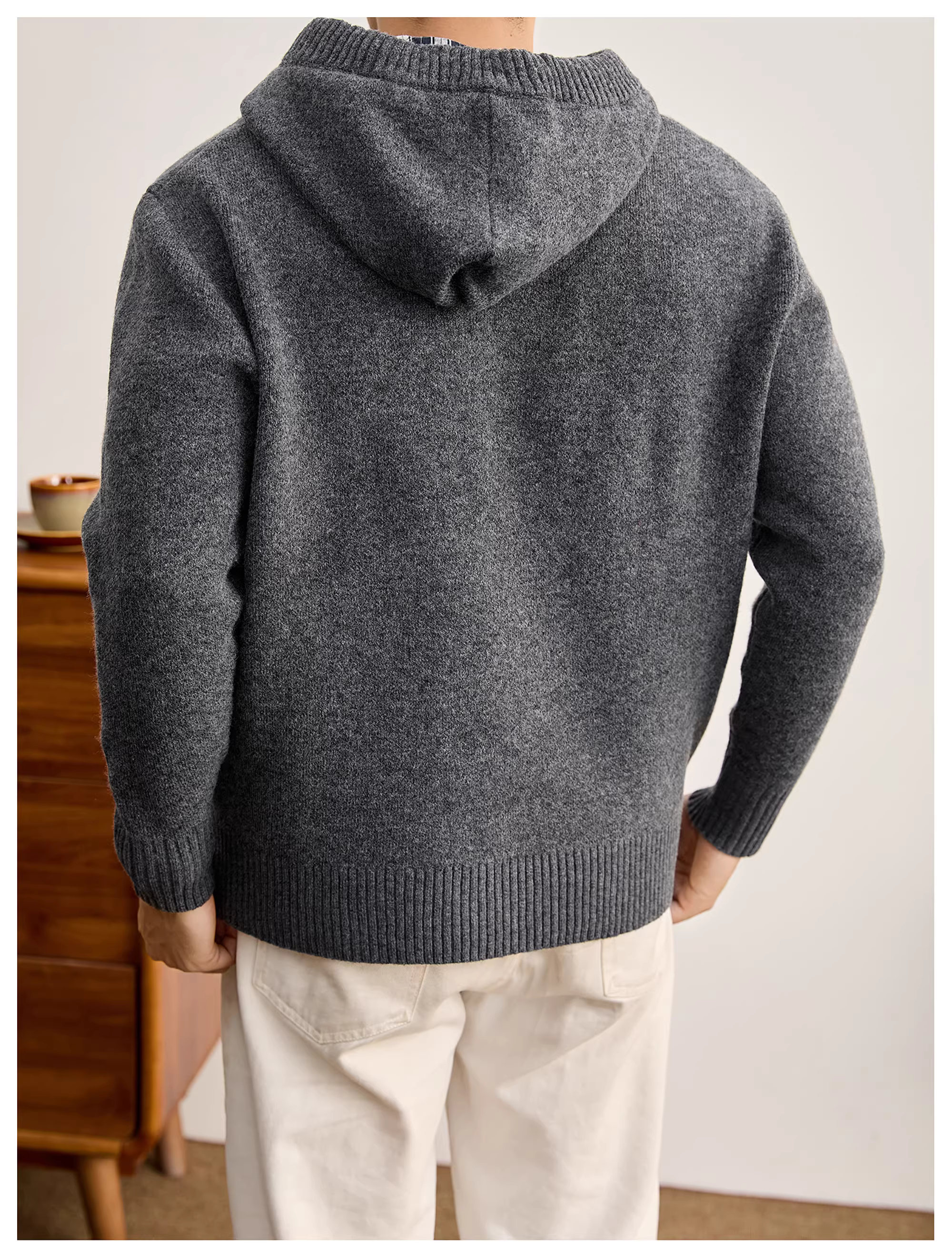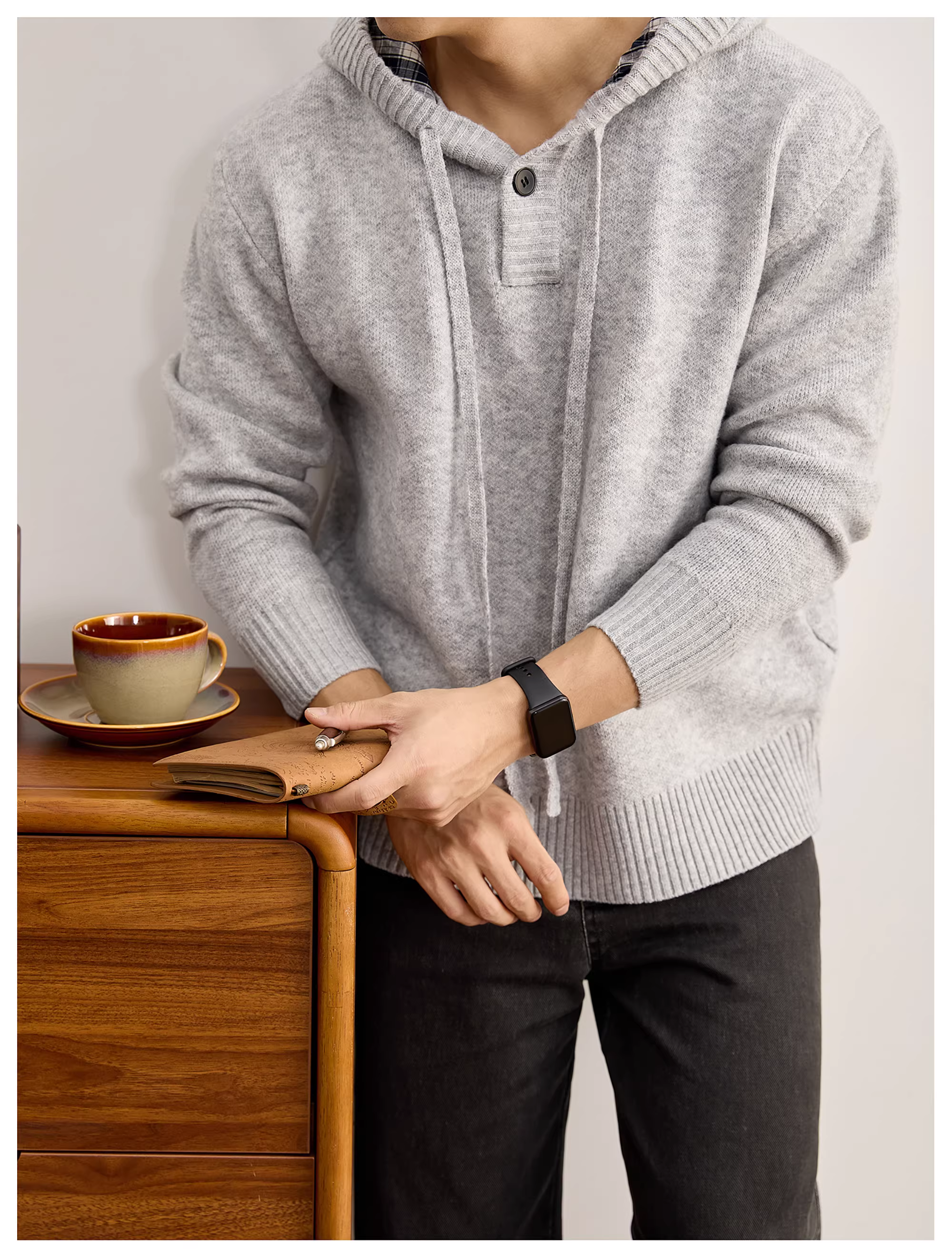 - Áo len nam có mũ trùm đầu, kiểu dáng lười biếng LUUD, chất liệu len cừu pha, có dây rút, họa tiết kẻ caro, phối vải, lót bên trong.