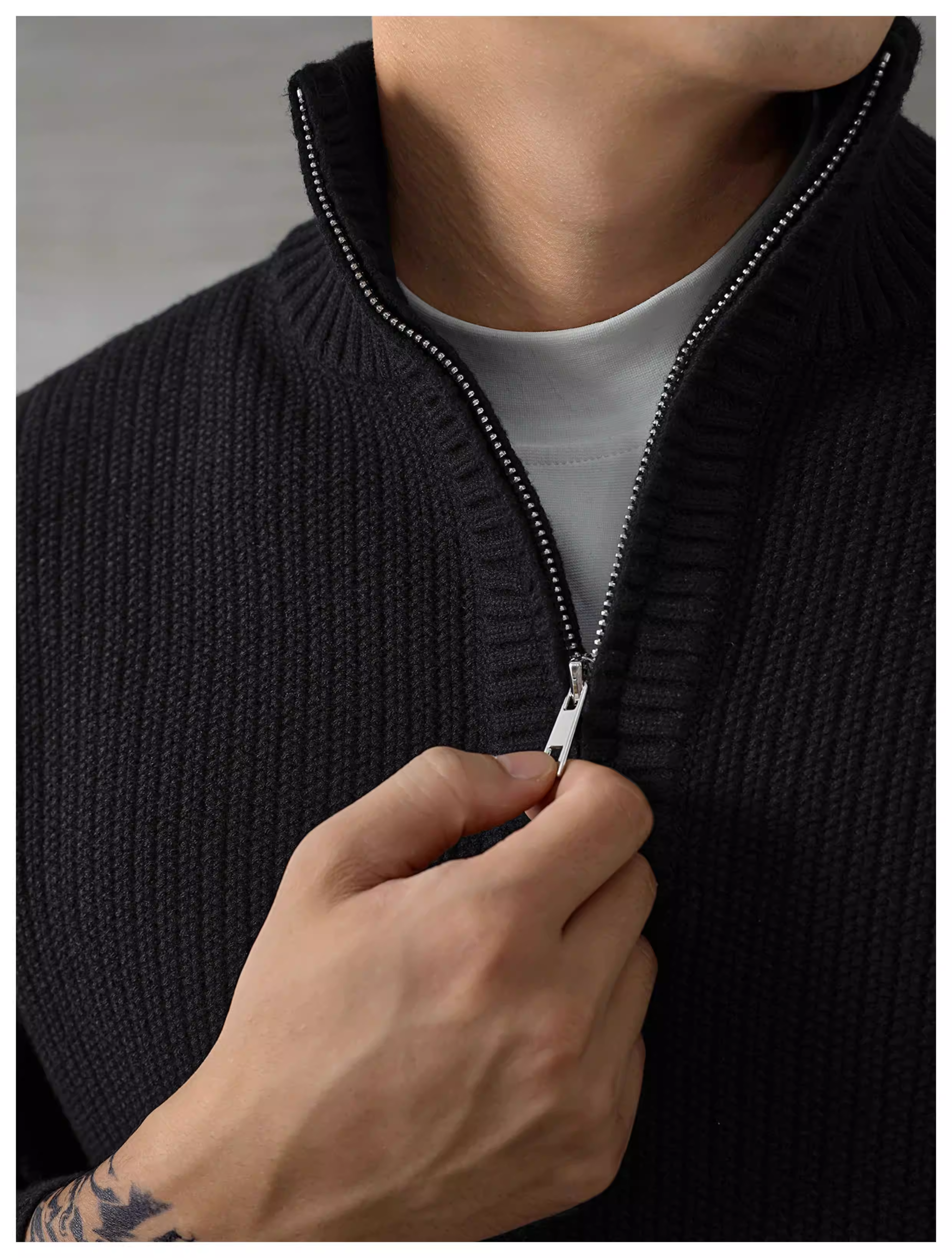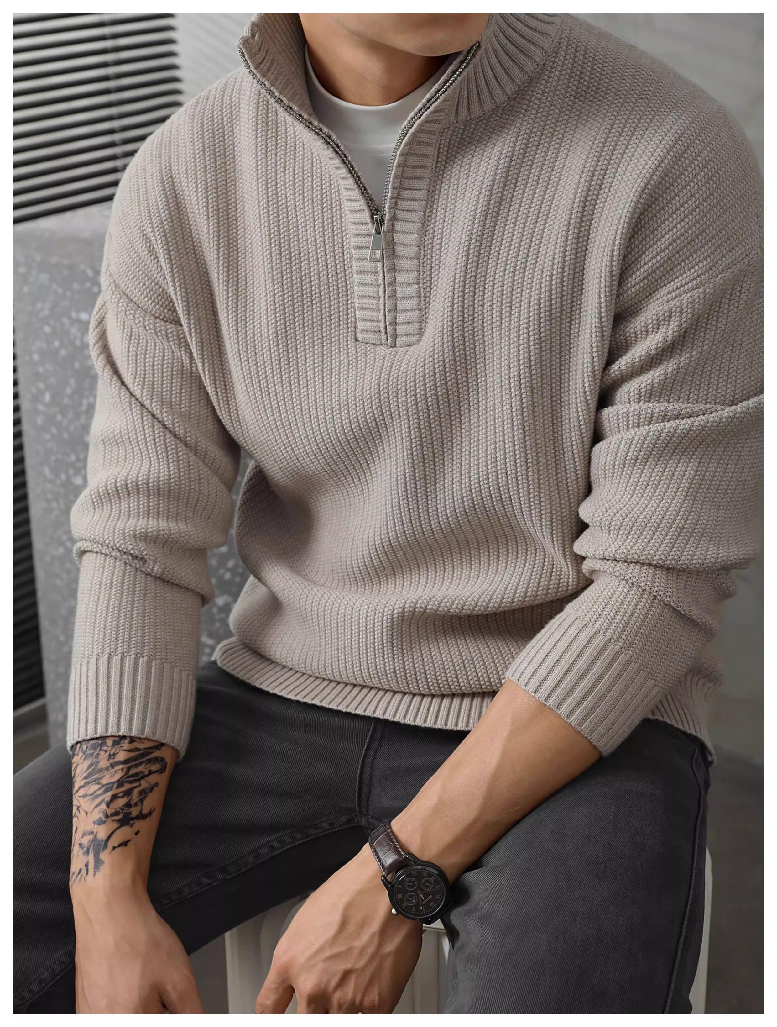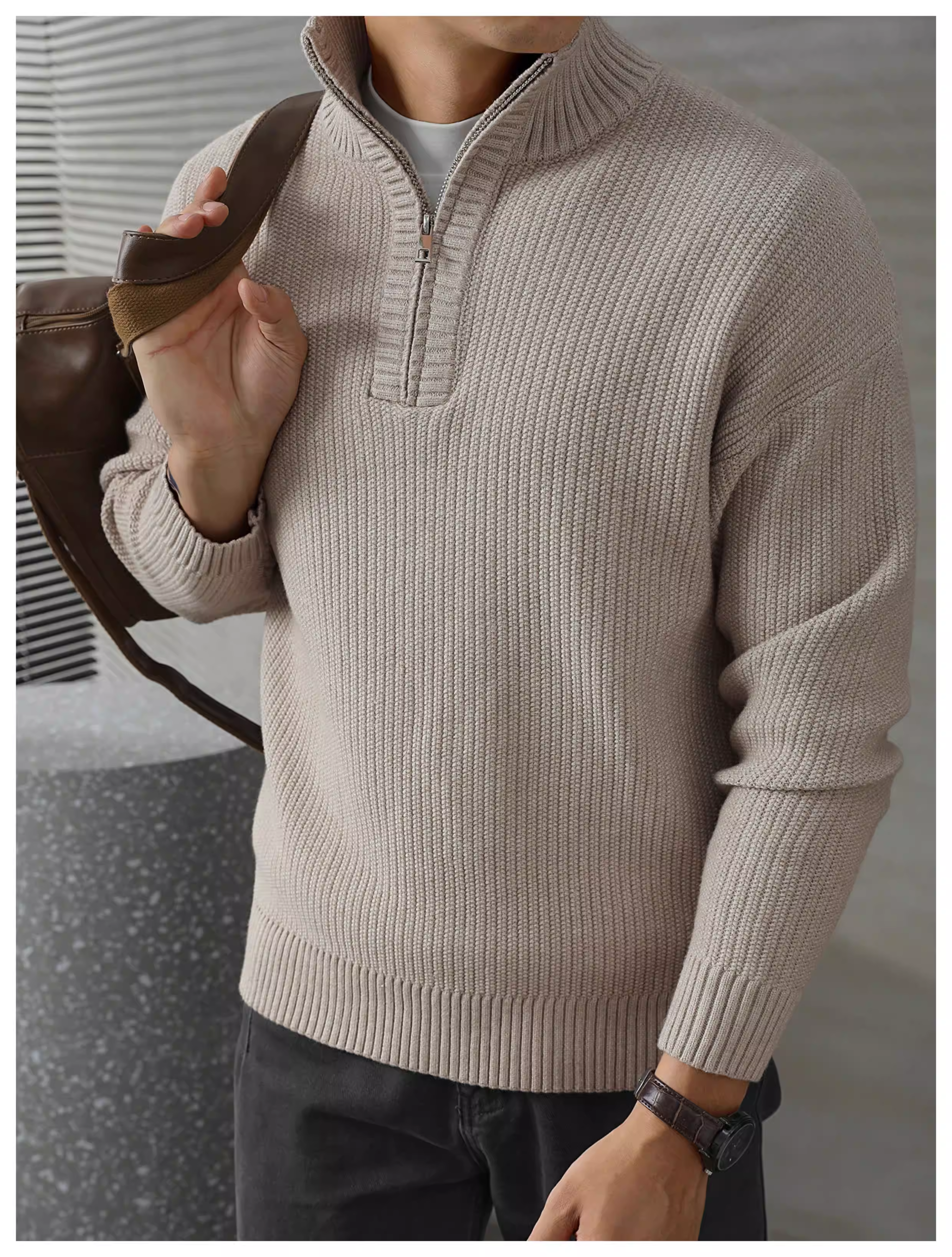 - Áo len nam cổ nửa cao kiểu dáng đô thị màu nâu LUUD, chất liệu dệt jacquard, kiểu dáng nửa khóa kéo