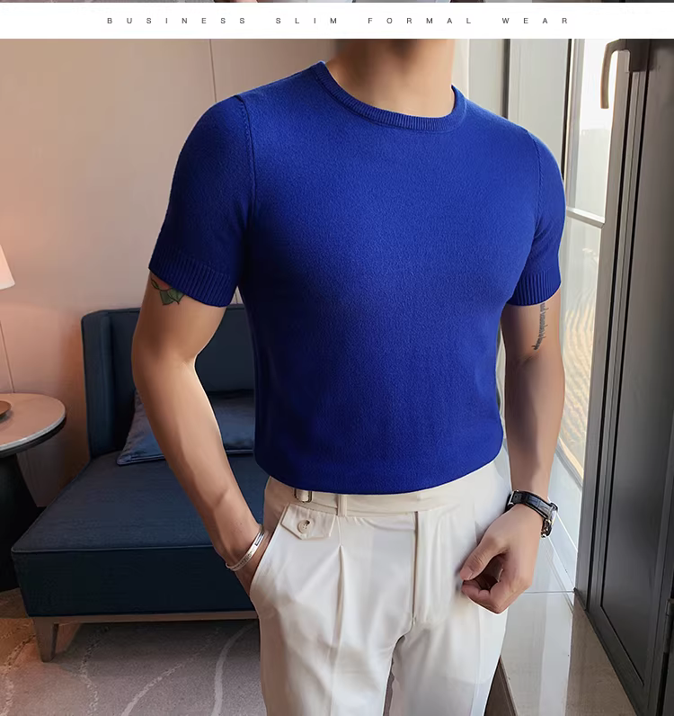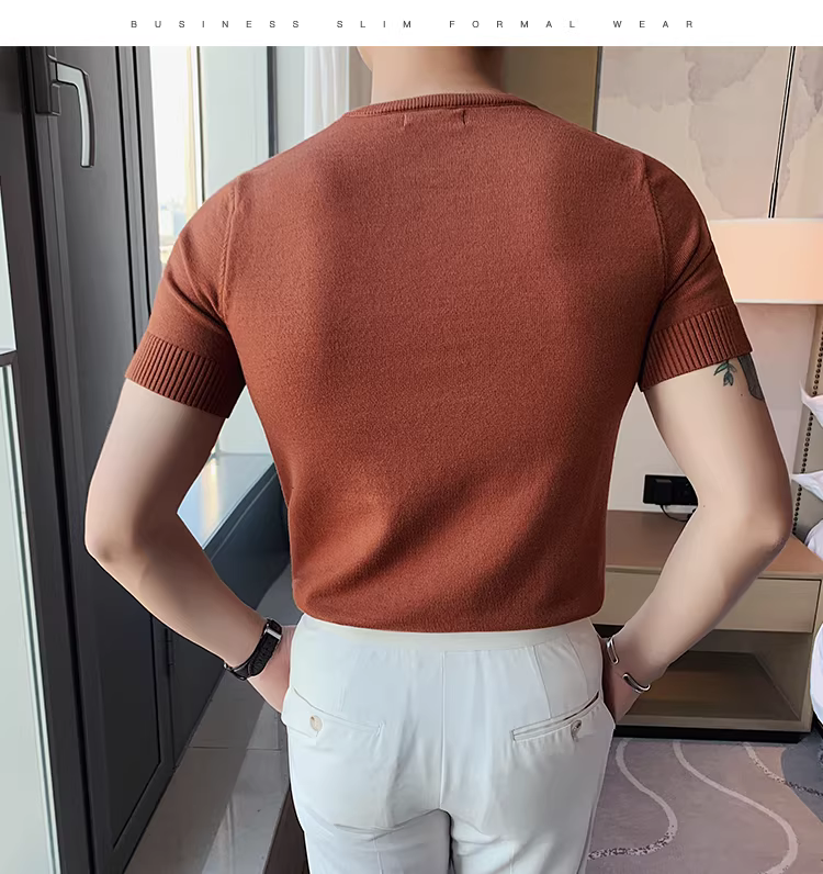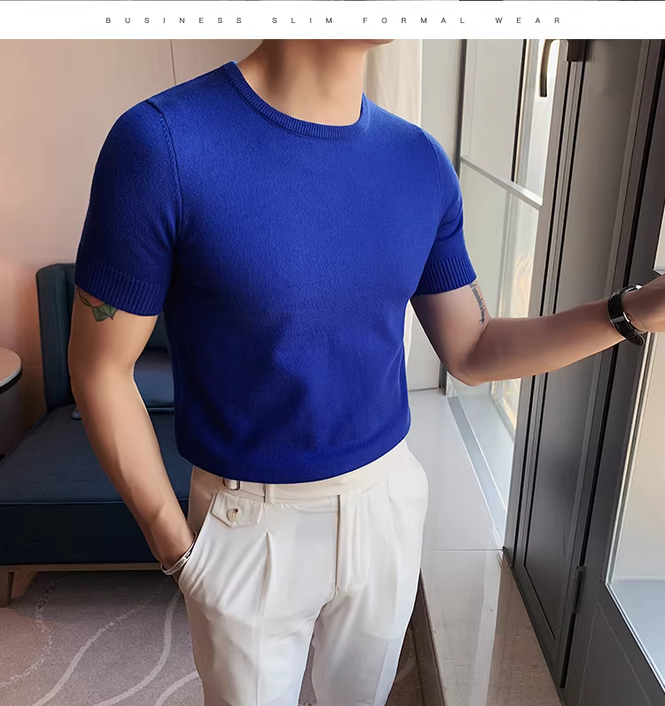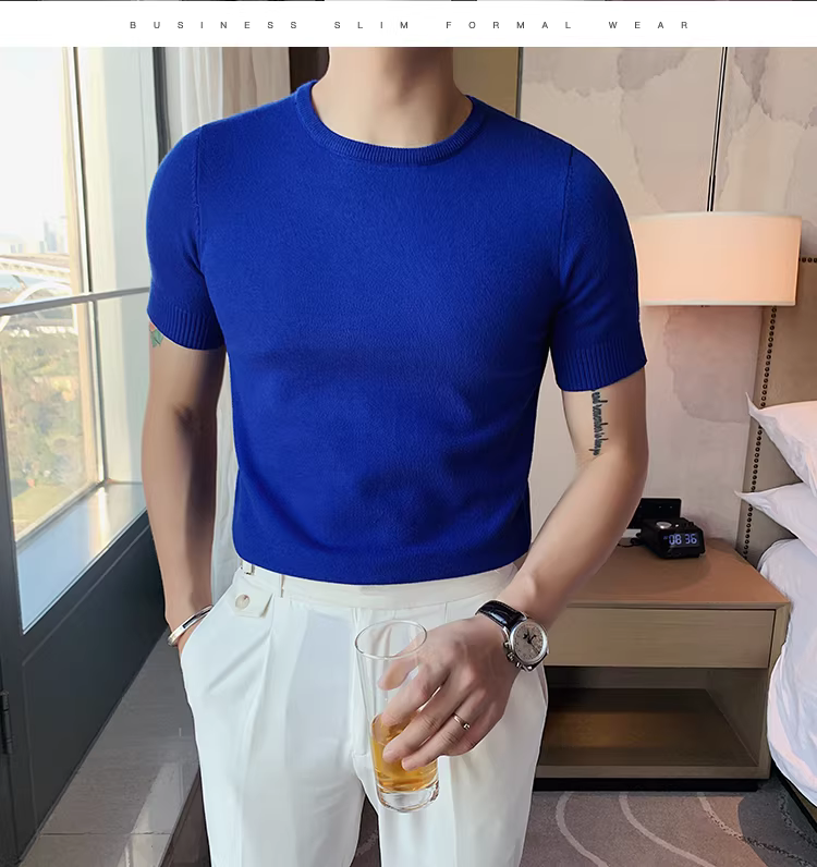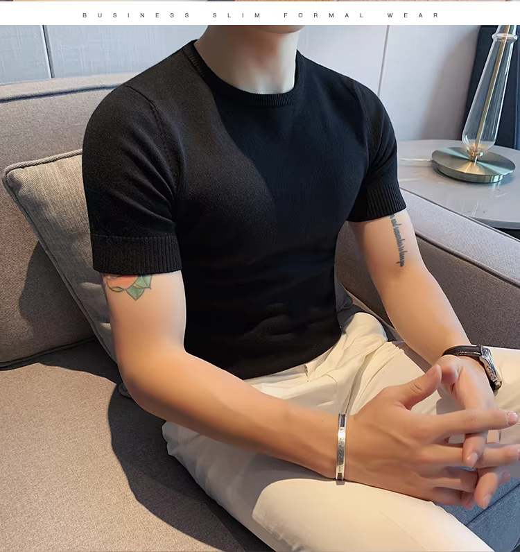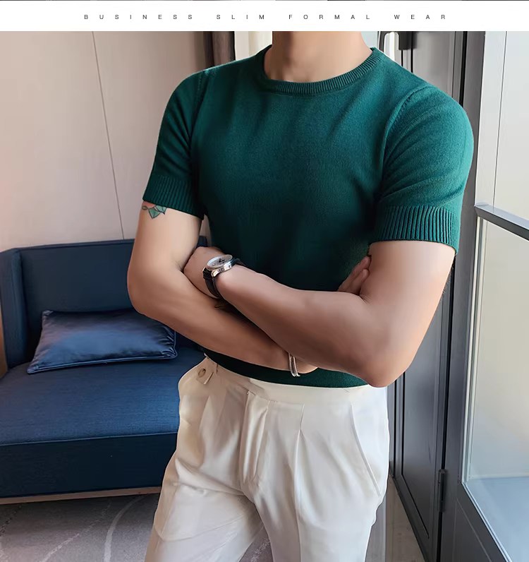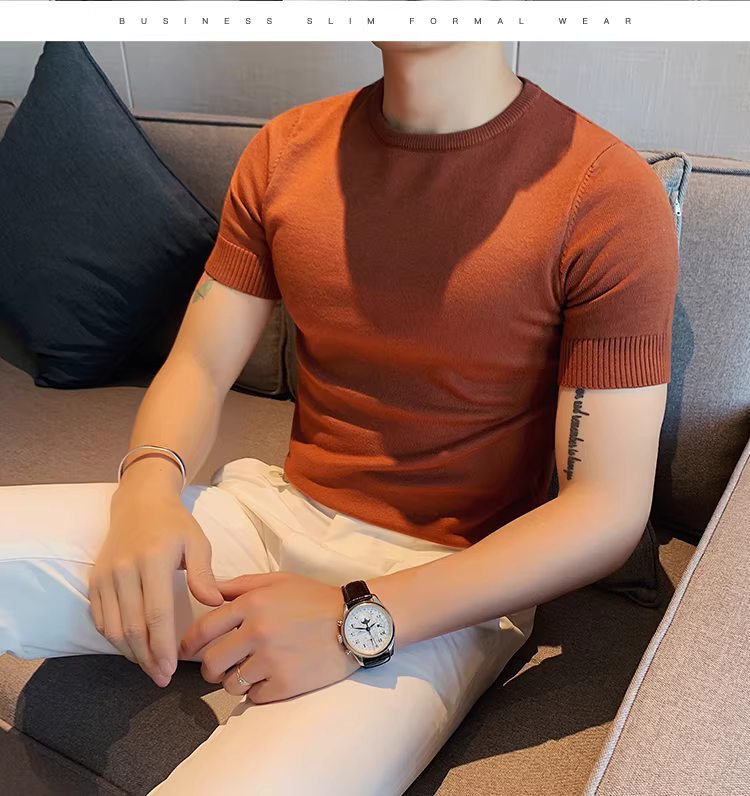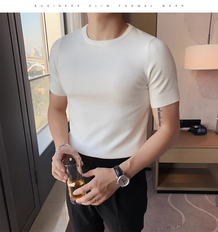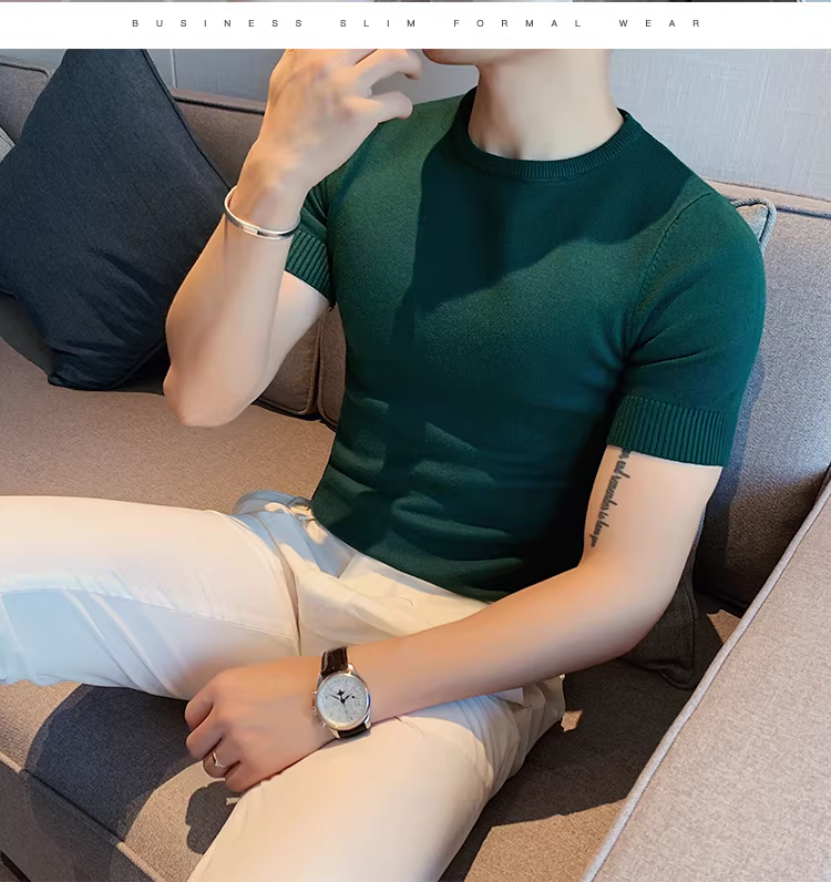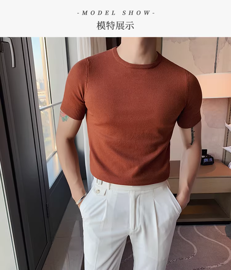 Áo len nam cổ tròn tay ngắn kiểu xuân thu, ôm body, phong cách Hàn Quốc thời thượng, chất liệu len đá mát, áo thun nửa tay mặc lót