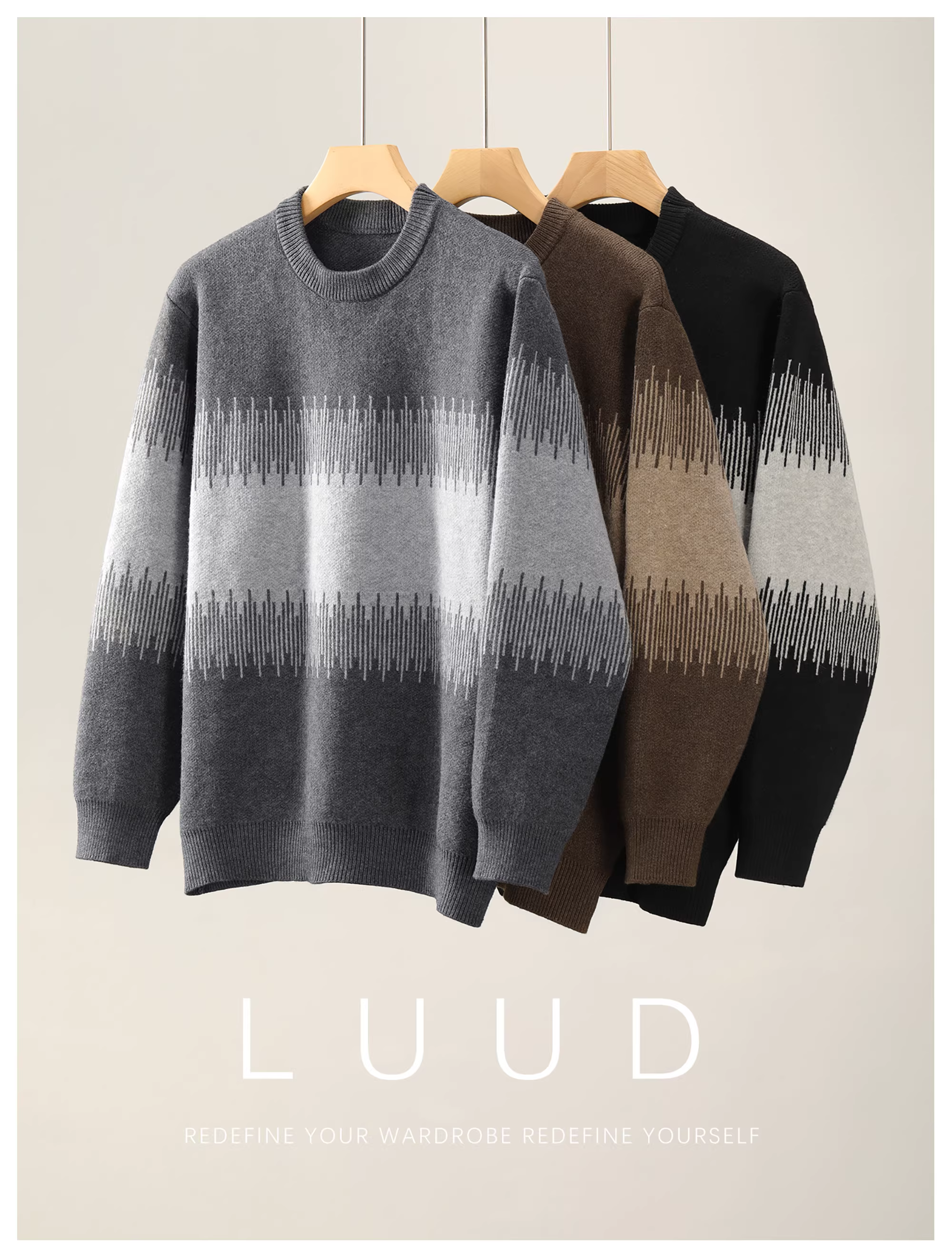 Áo len nam LUUD mùa đông dày dặn 750g, cổ tròn, tay dài, chất liệu dệt kim phối màu thời trang, kiểu dáng hiện đại.