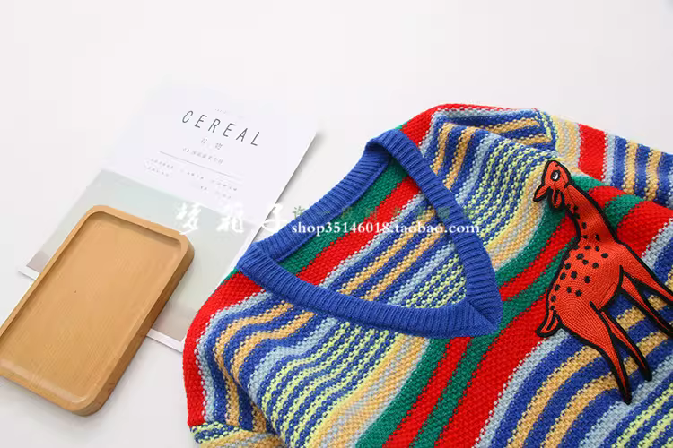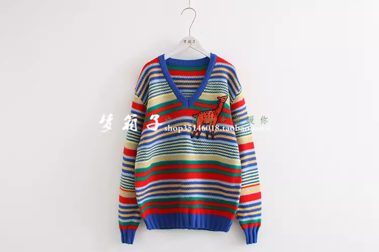 - Áo len nữ dáng rộng tay dài cổ V thêu hình hươu cao cổ Dream Box 2025 Thu mới, nhiều màu sọc