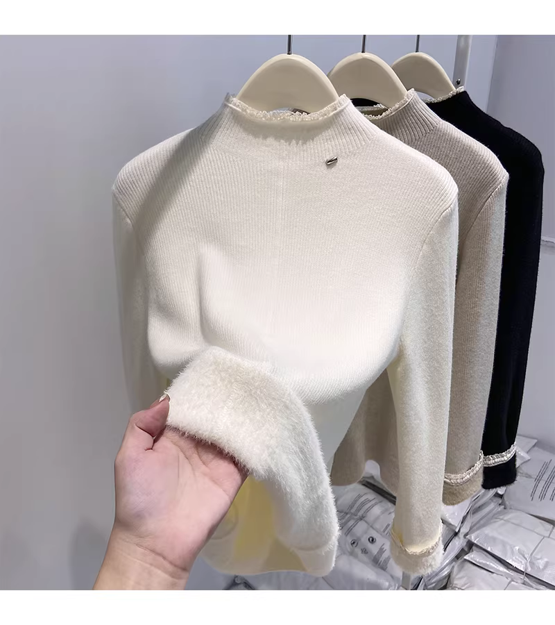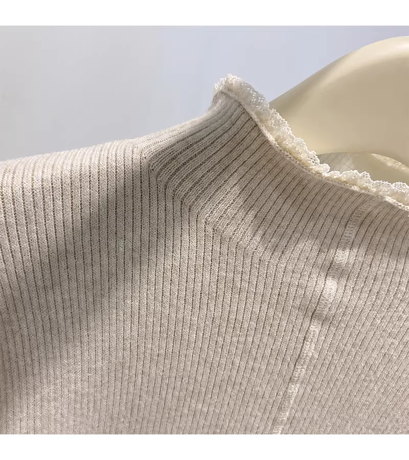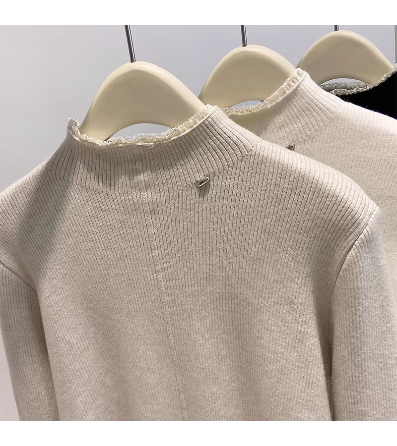 Áo len nữ La Chapelle cổ nửa cao tay dài màu đen, kiểu mới thu đông 2025, viền ren, áo lót