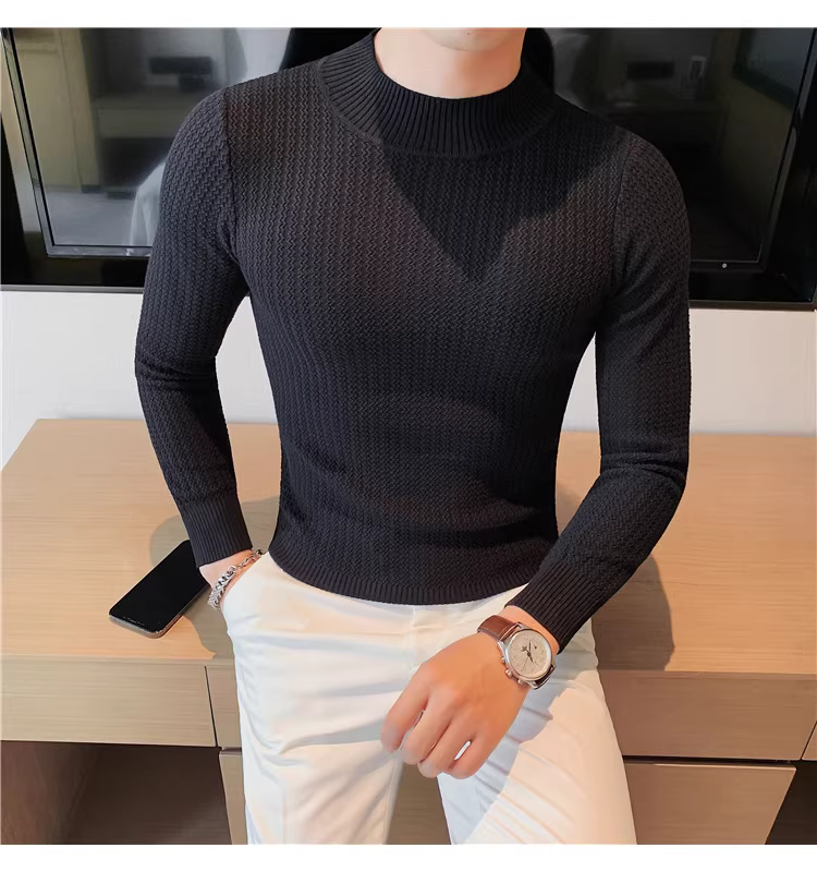 Áo len nửa cổ lọ dành cho nam, mùa thu đông, lót lông cừu, ôm dáng, áo sơ mi dệt kim dài tay hợp thời trang, hàng dệt kim đa năng cao cấp.