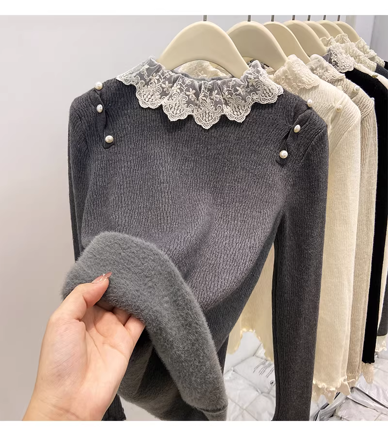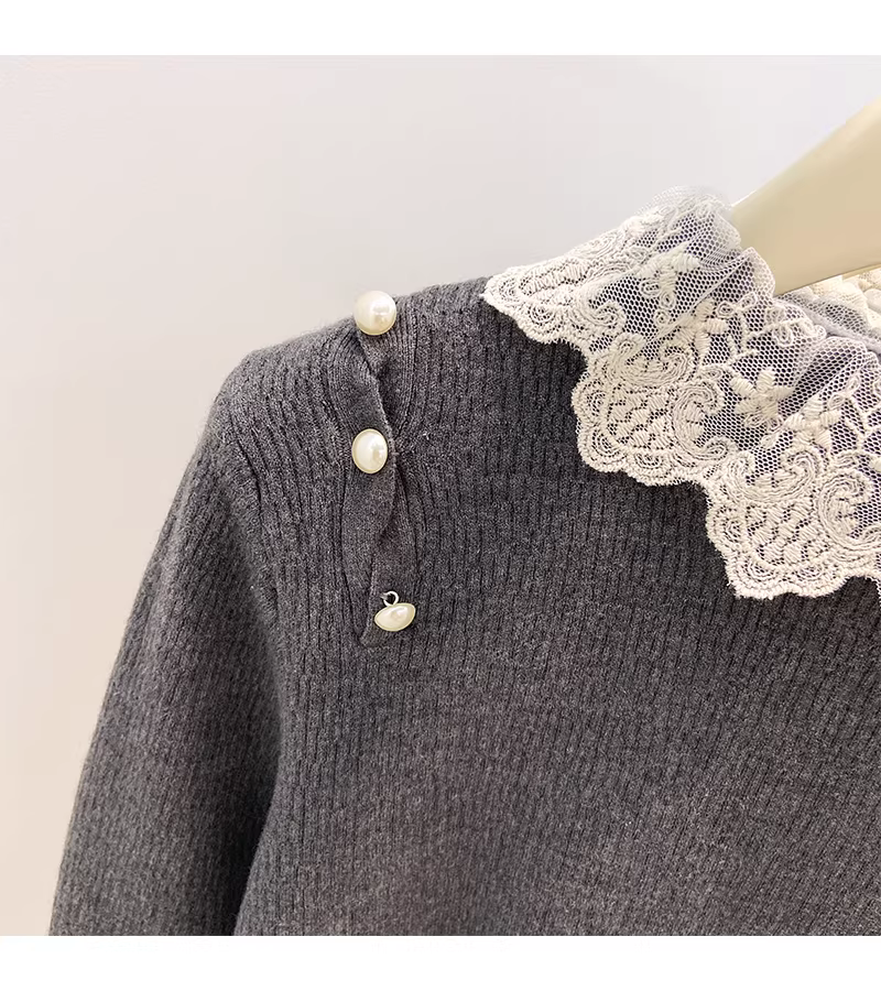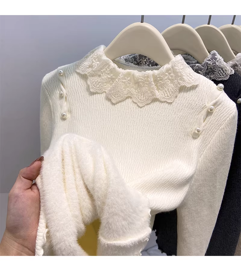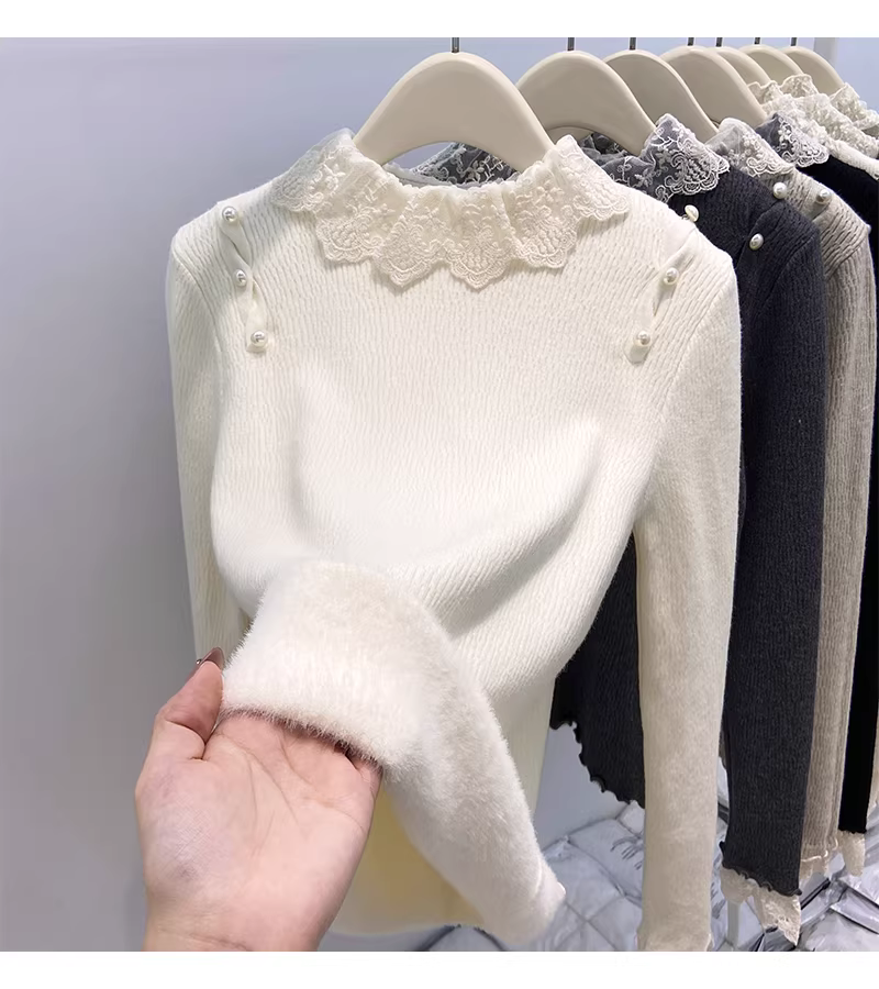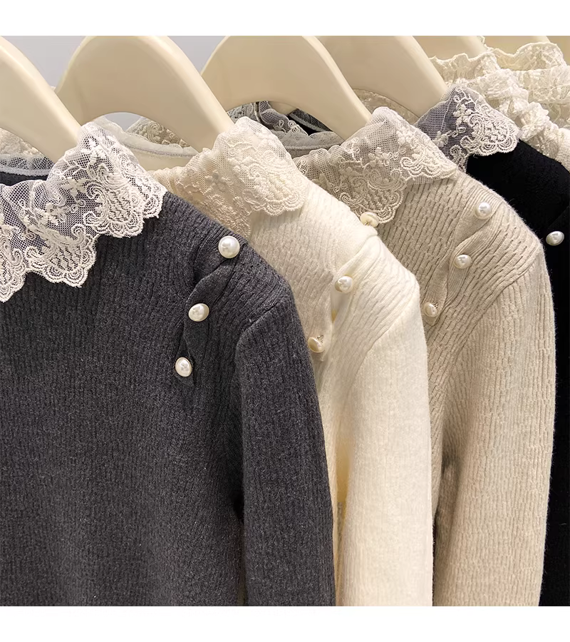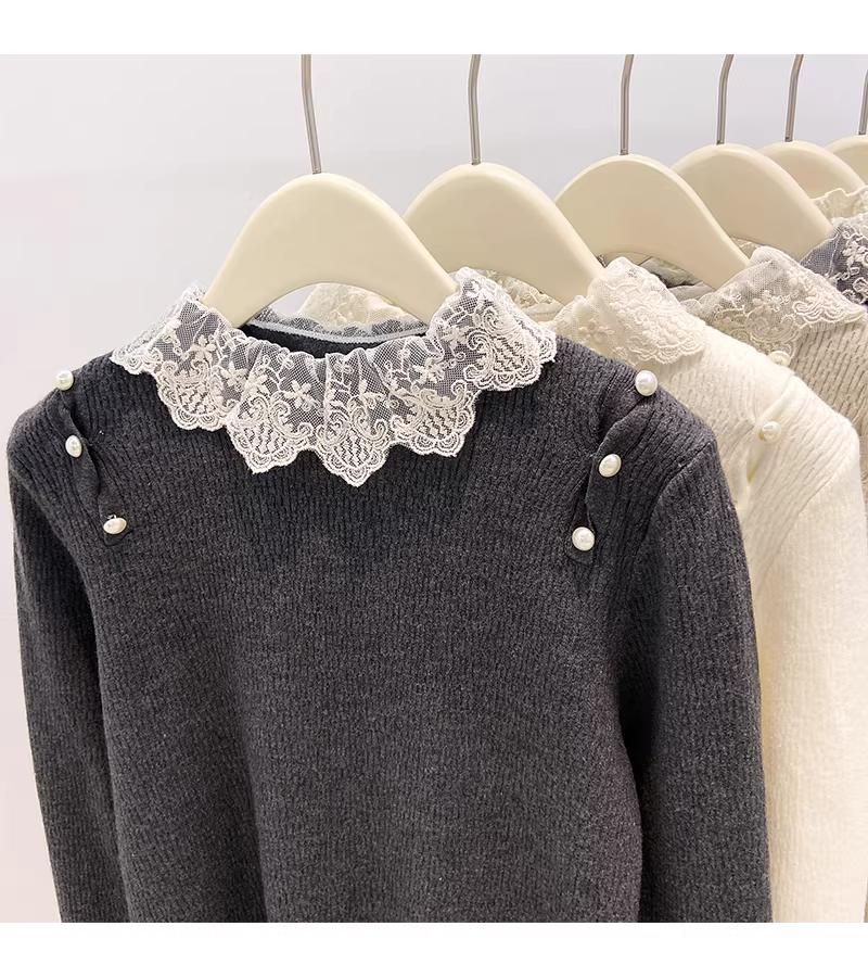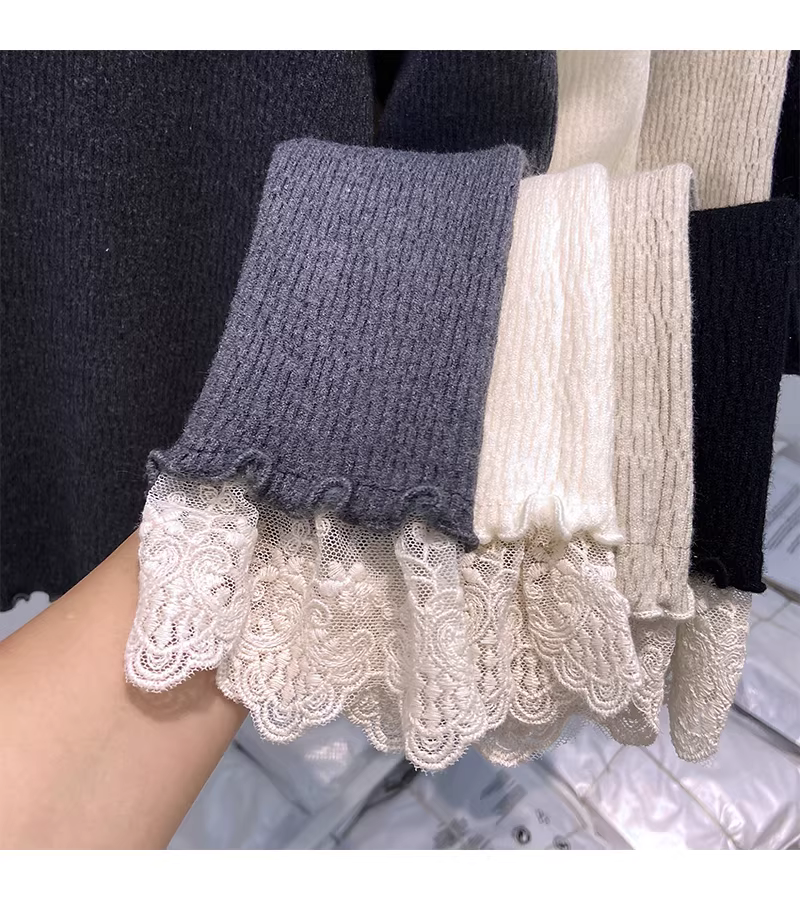 - Áo len trắng dài tay La Chapelle dành cho nữ, mẫu mới thu đông 2025, kiểu dáng thanh lịch, phối ren, mặc lót bên trong.