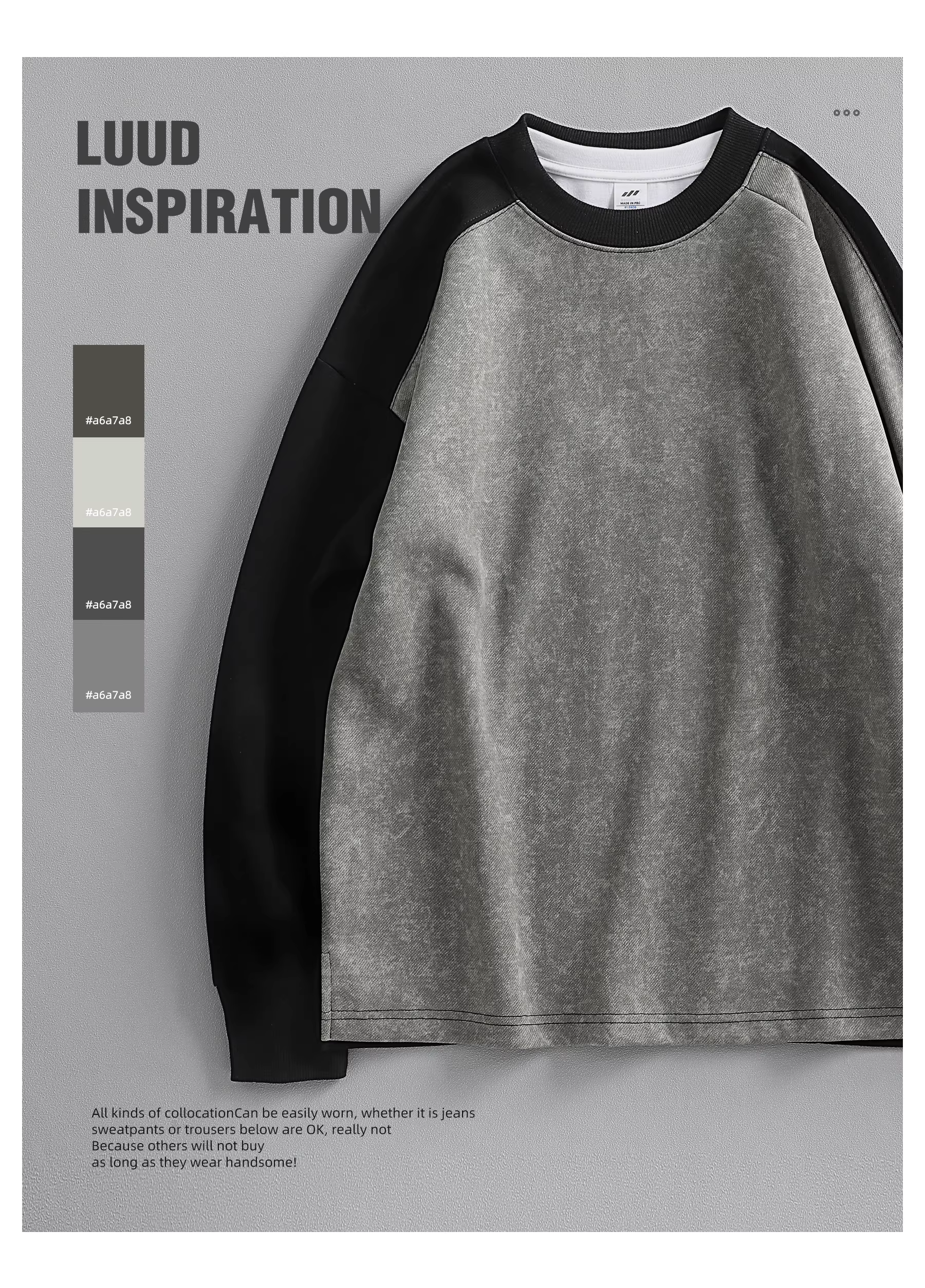 - Áo nỉ dài tay cổ tròn kiểu dáng cổ điển LUUD dành cho nam, áo kiểu dáng đơn giản, tay áo trễ vai, phong cách Nhật Bản, phối màu đơn giản