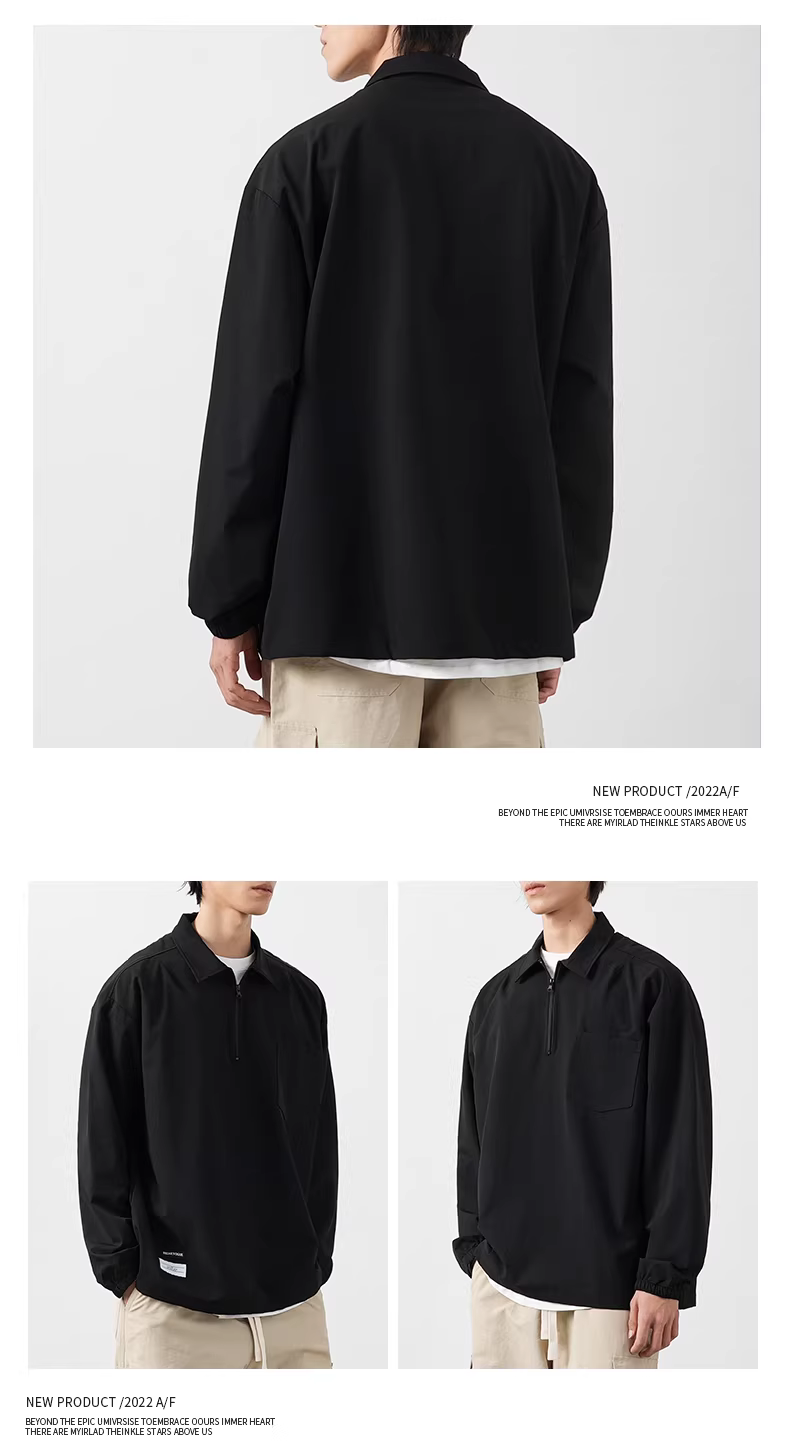 Áo polo công sở phong cách núi non tinh khiết, tay dài, nam, mùa thu, phong cách Harajuku, dáng rộng, cổ trụ, áo khoác nửa khóa kéo