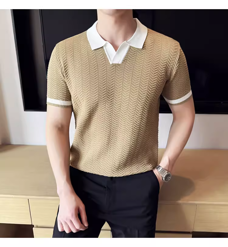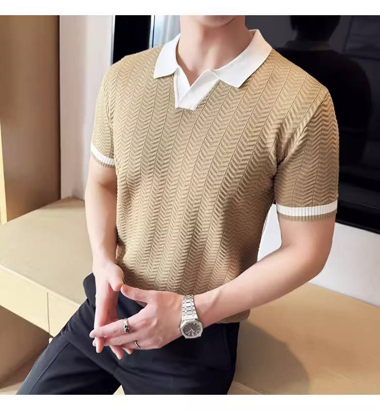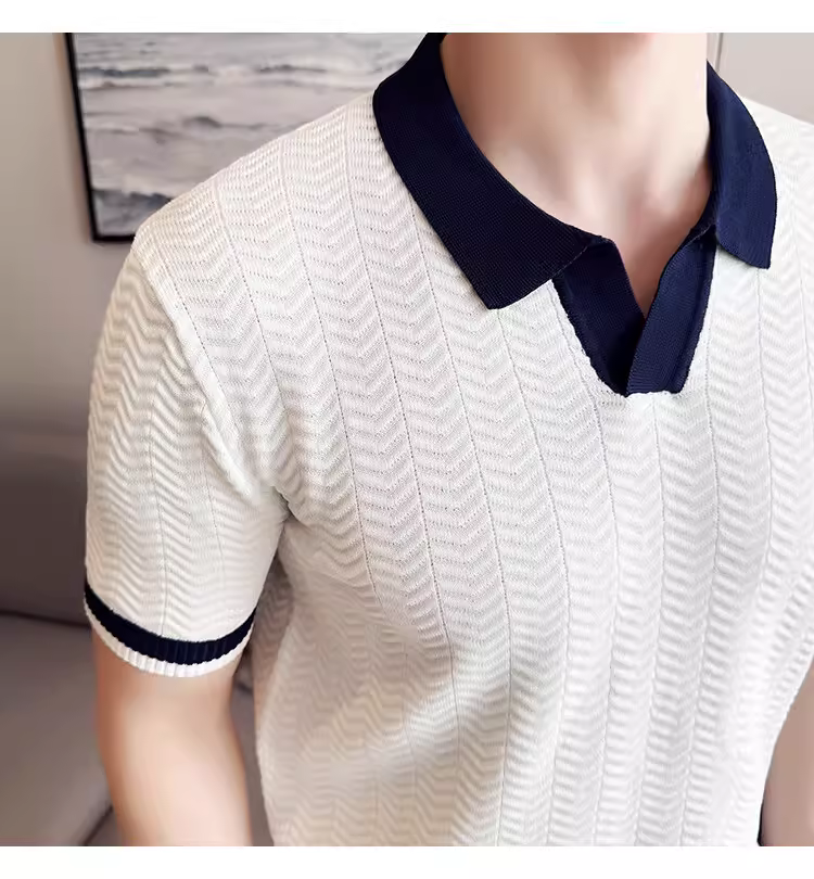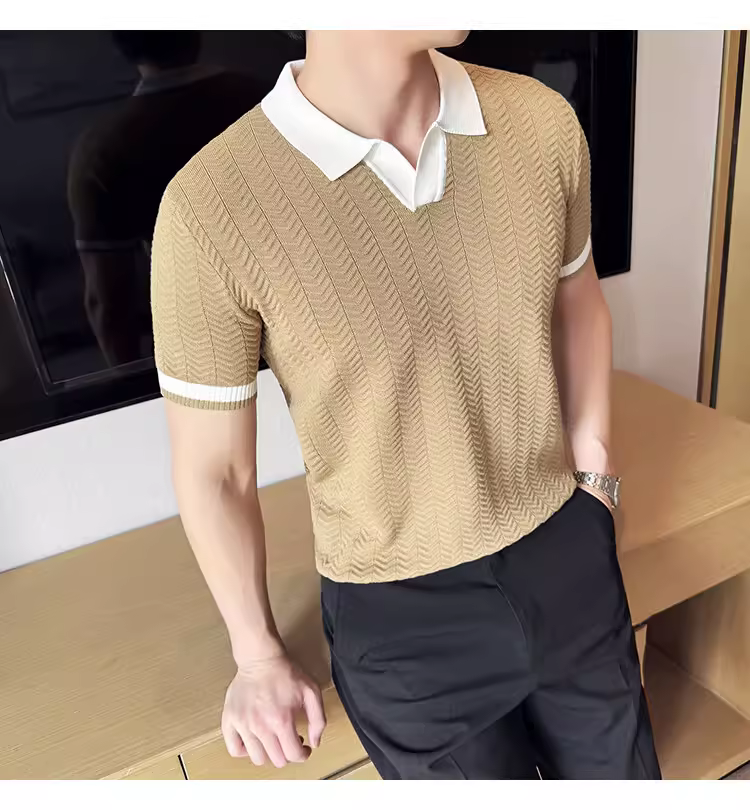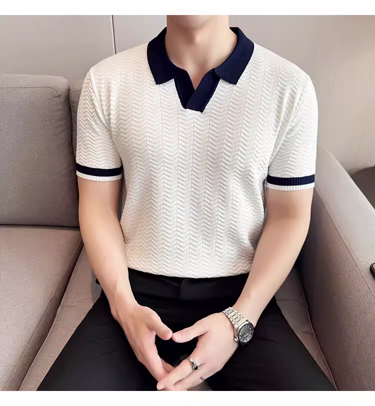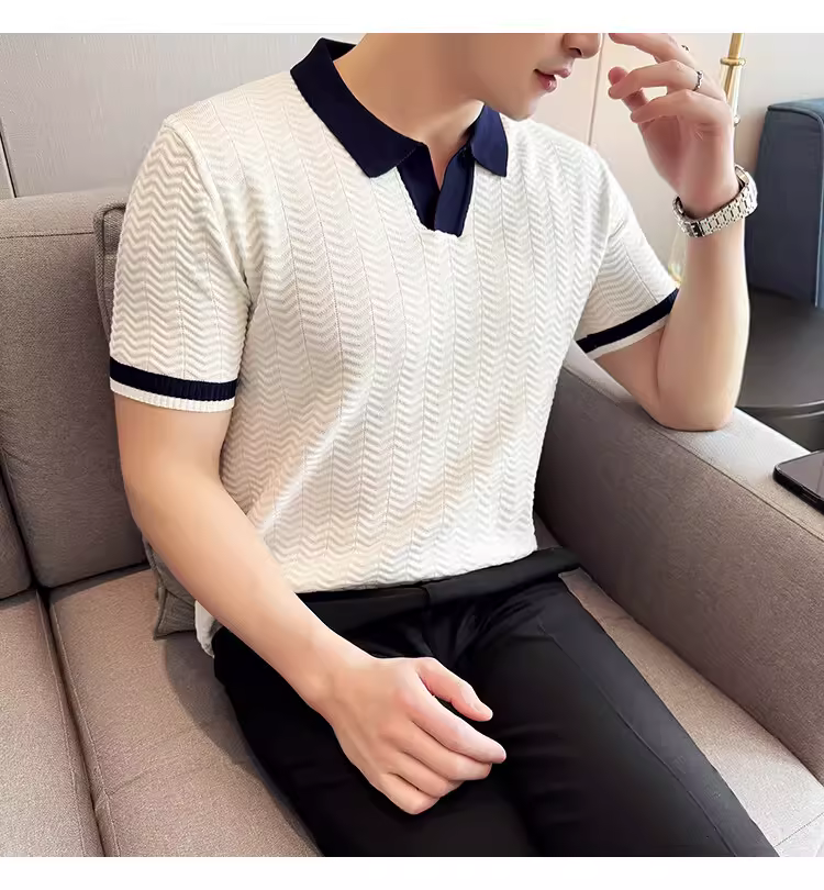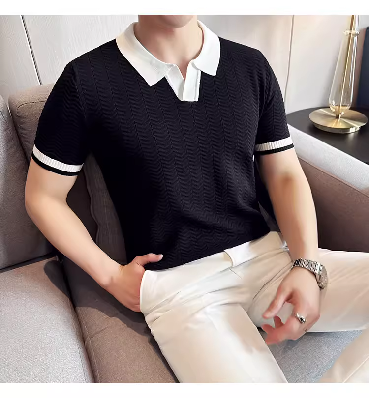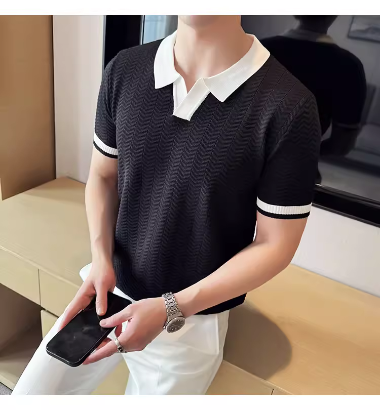 - Áo polo nam dệt kim lụa đá phối màu, tay ngắn, kiểu dáng mùa hè mới, áo thun cao cấp thời thượng ôm dáng co giãn