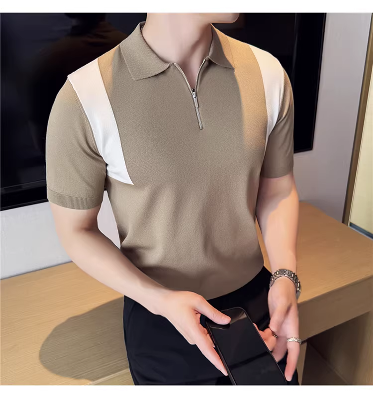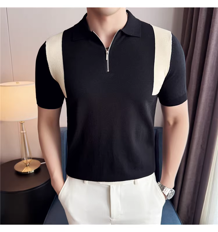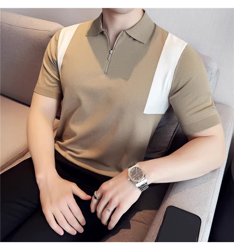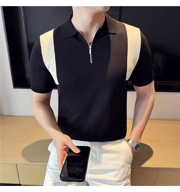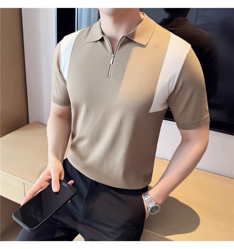 Áo Polo nam tay ngắn chất liệu lụa đá dệt kim phối màu, kiểu dáng mỏng nhẹ mùa hè, thời trang mới 2025, cổ áo kiểu dáng lịch lãm