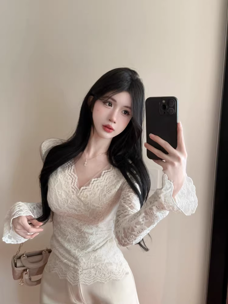 Áo ren cổ chữ V màu trắng dành cho nữ, thích hợp cho mùa xuân, mùa thu và mùa đông, lớp áo dài tay có thiết kế khoét lỗ và đường viền cổ siêu thấp.