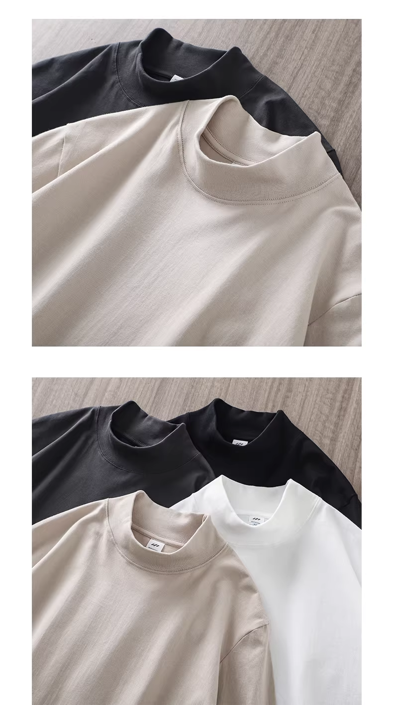 Áo sơ mi cổ cao nửa cổ kiểu Nhật Bản 280G dành cho nam, áo len cotton nguyên chất, dáng rộng cho mùa thu đông, áo thun dài tay màu trơn.