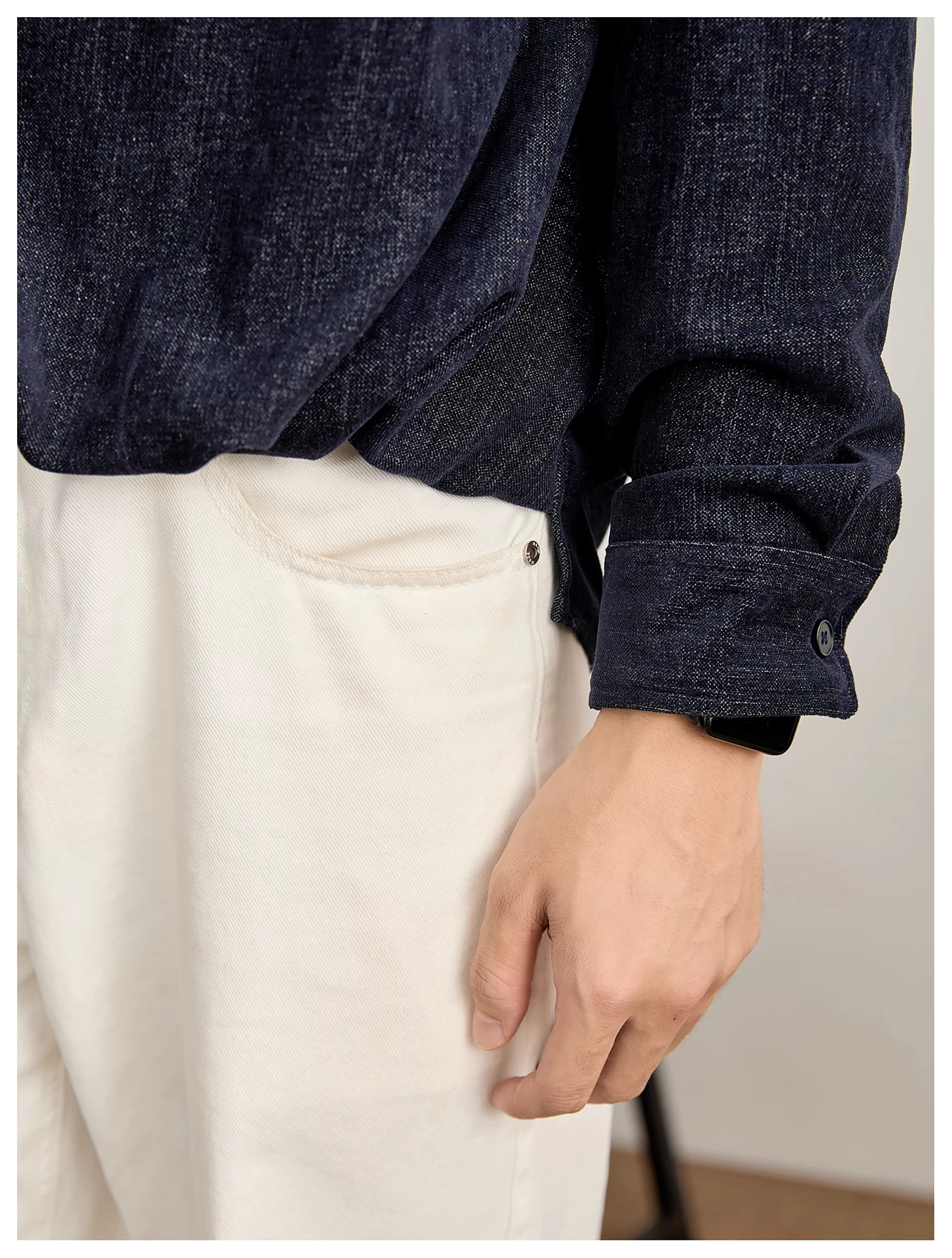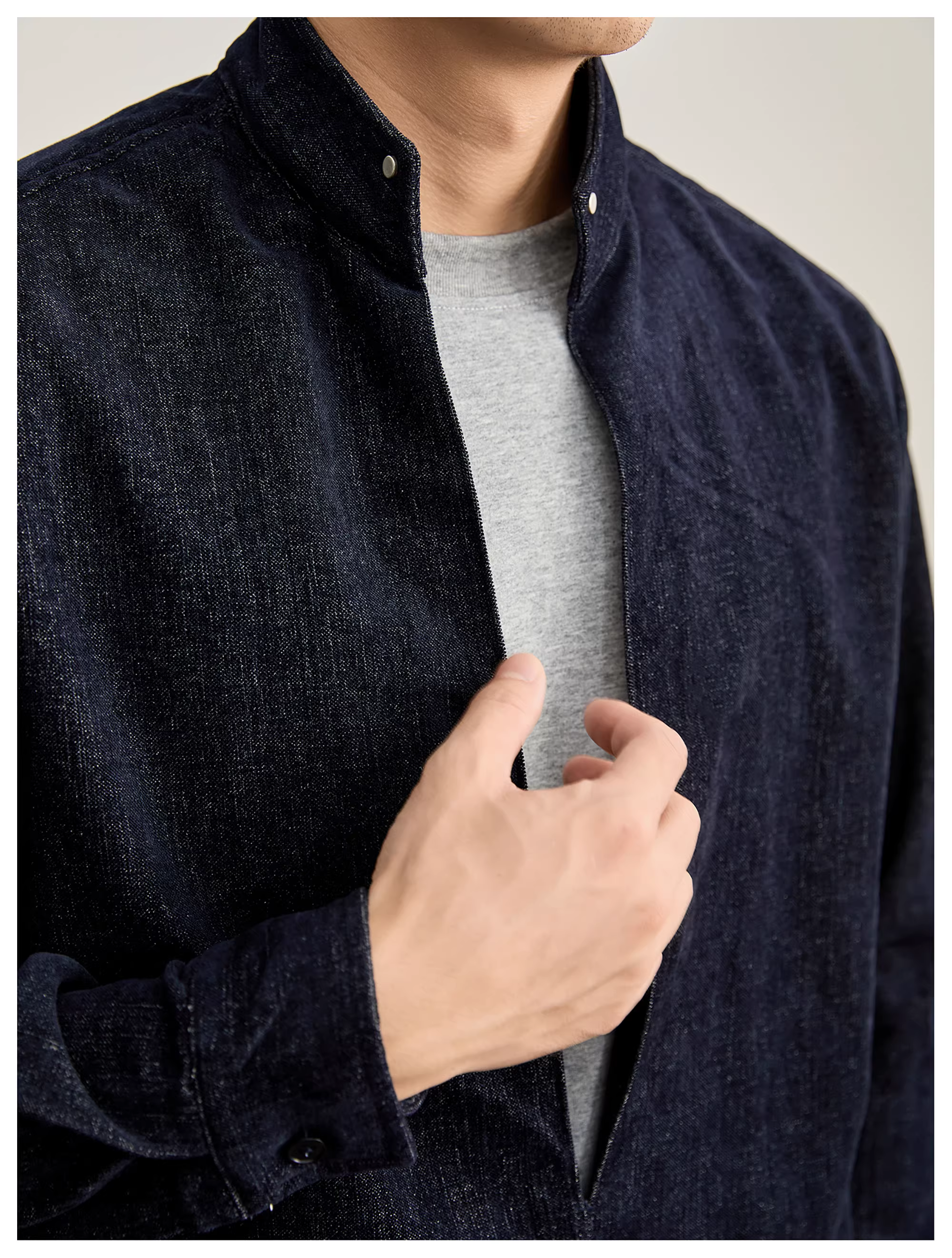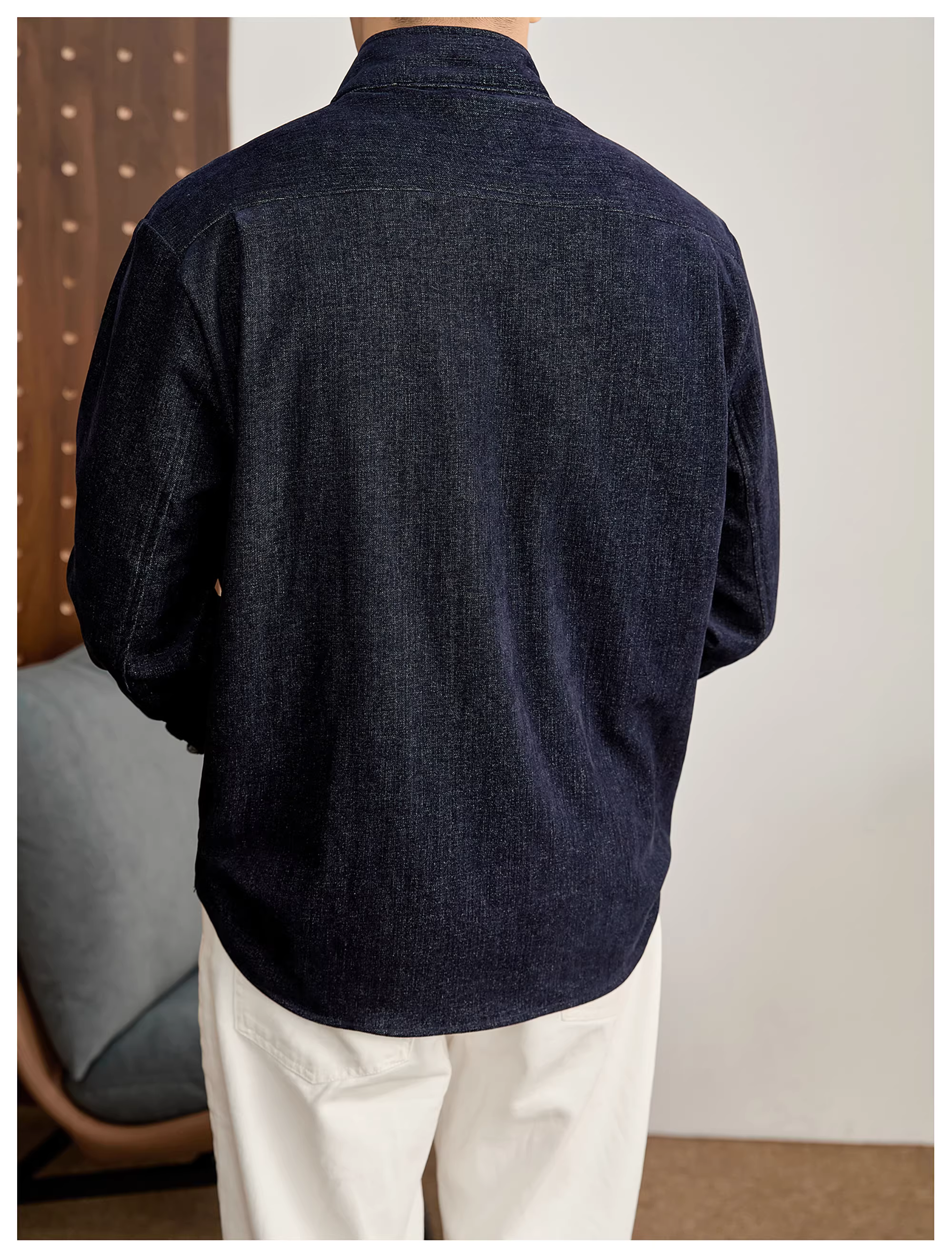 - Áo sơ mi cổ đứng may viền kiểu retro chất liệu len chenille LUUD, chất liệu cotton lyocell giả hai lớp, cổ chữ V, kiểu dáng thường ngày dành cho nam