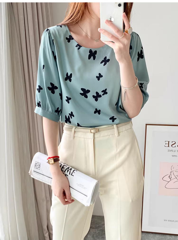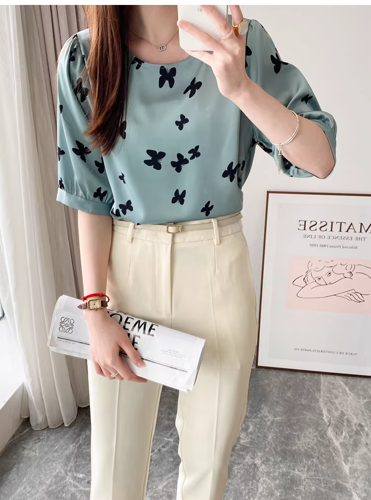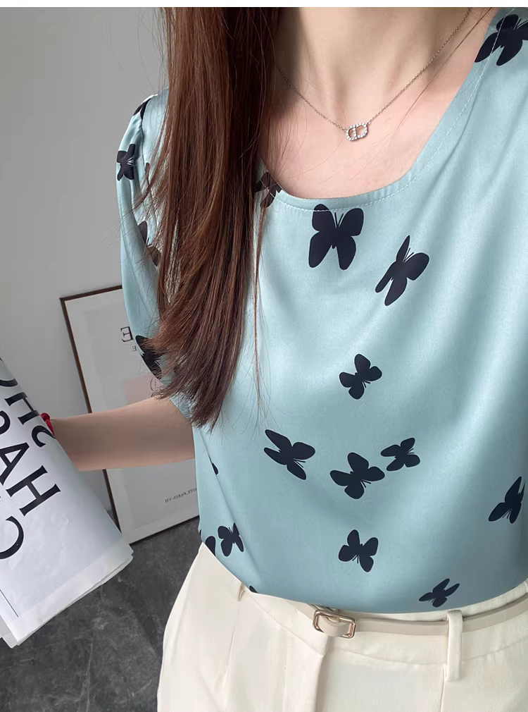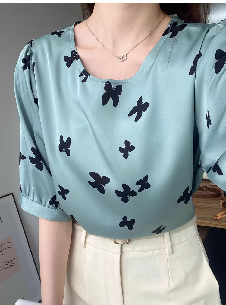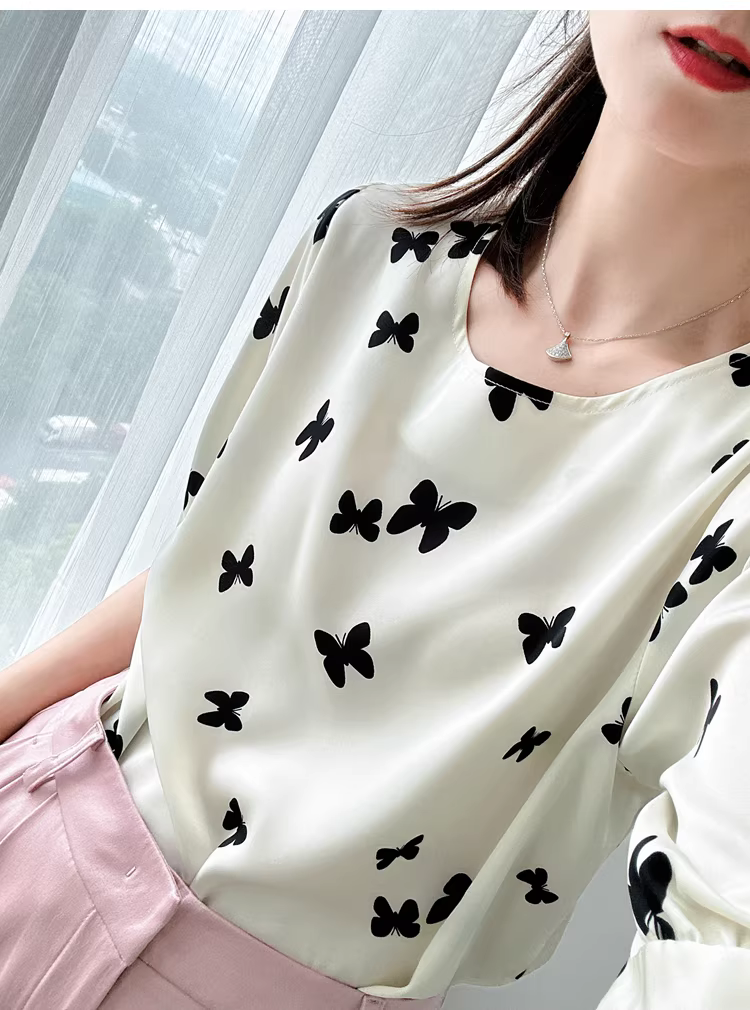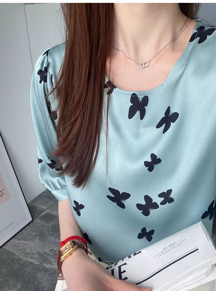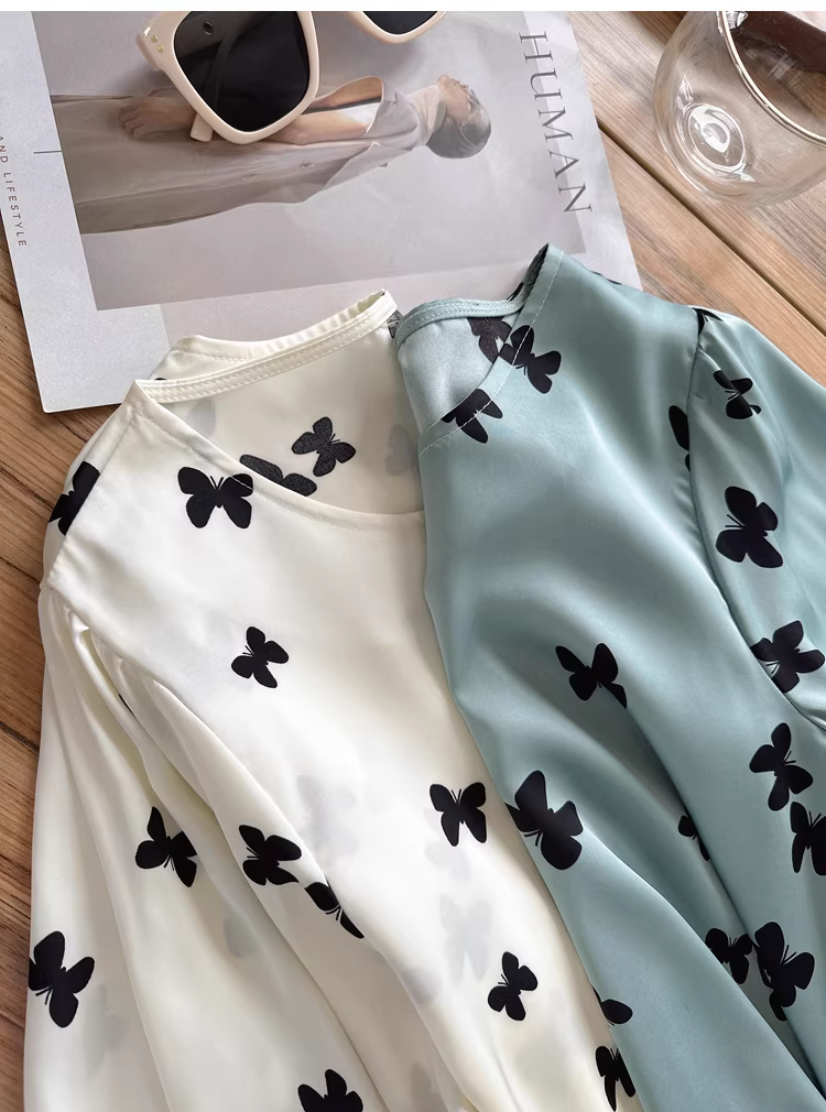 Áo sơ mi cổ tròn dáng rộng chống nhăn hình bướm lãng mạn mát mẻ bằng vải acetate cho nữ mùa hè mới